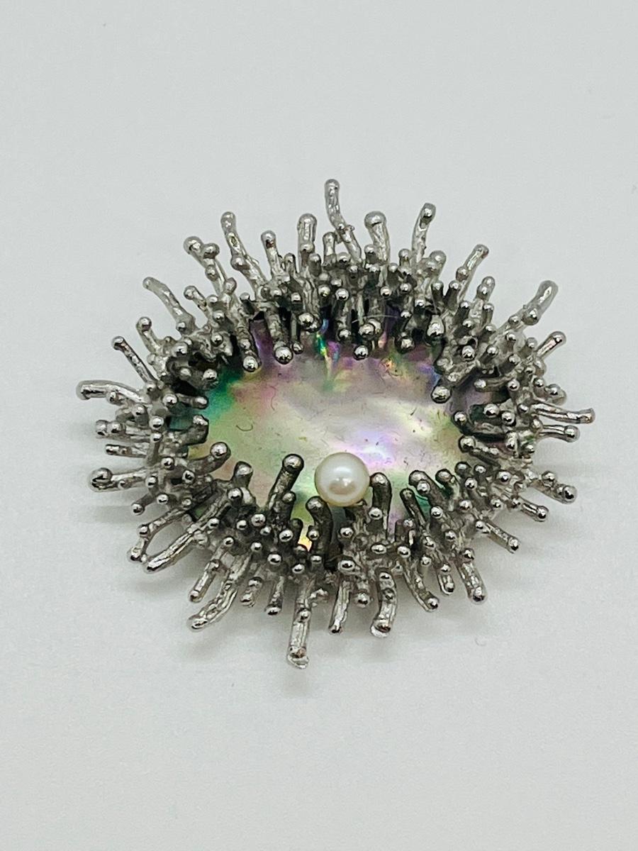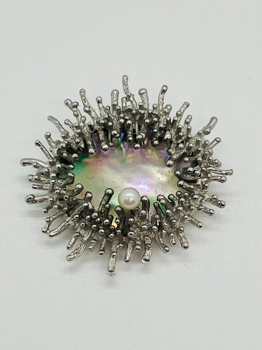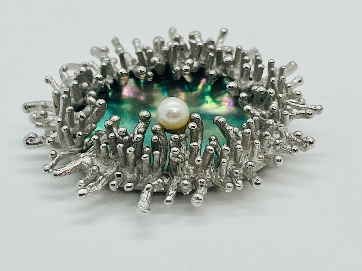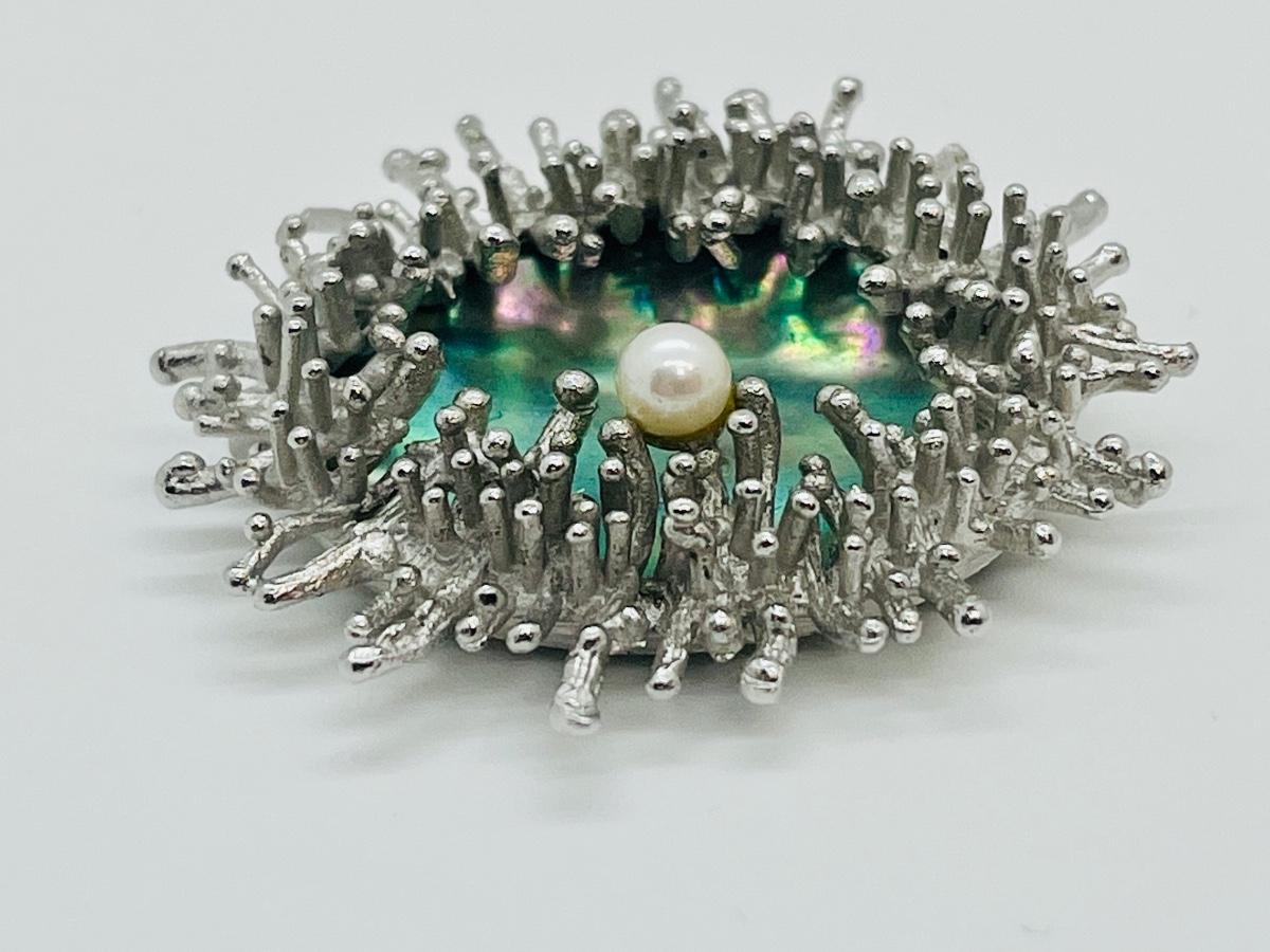 Lot 110: Silver Brooch Textured Frames, Abalone Backdrop, Center-Set Cultured Pearl, Marked 800