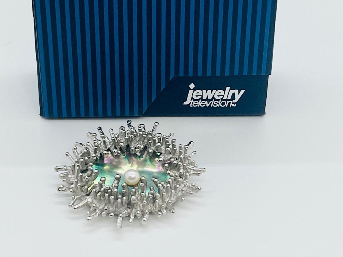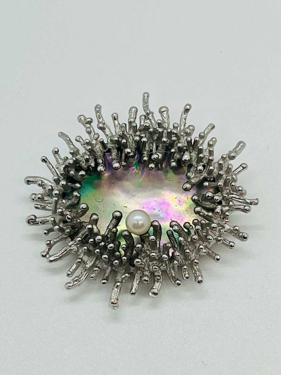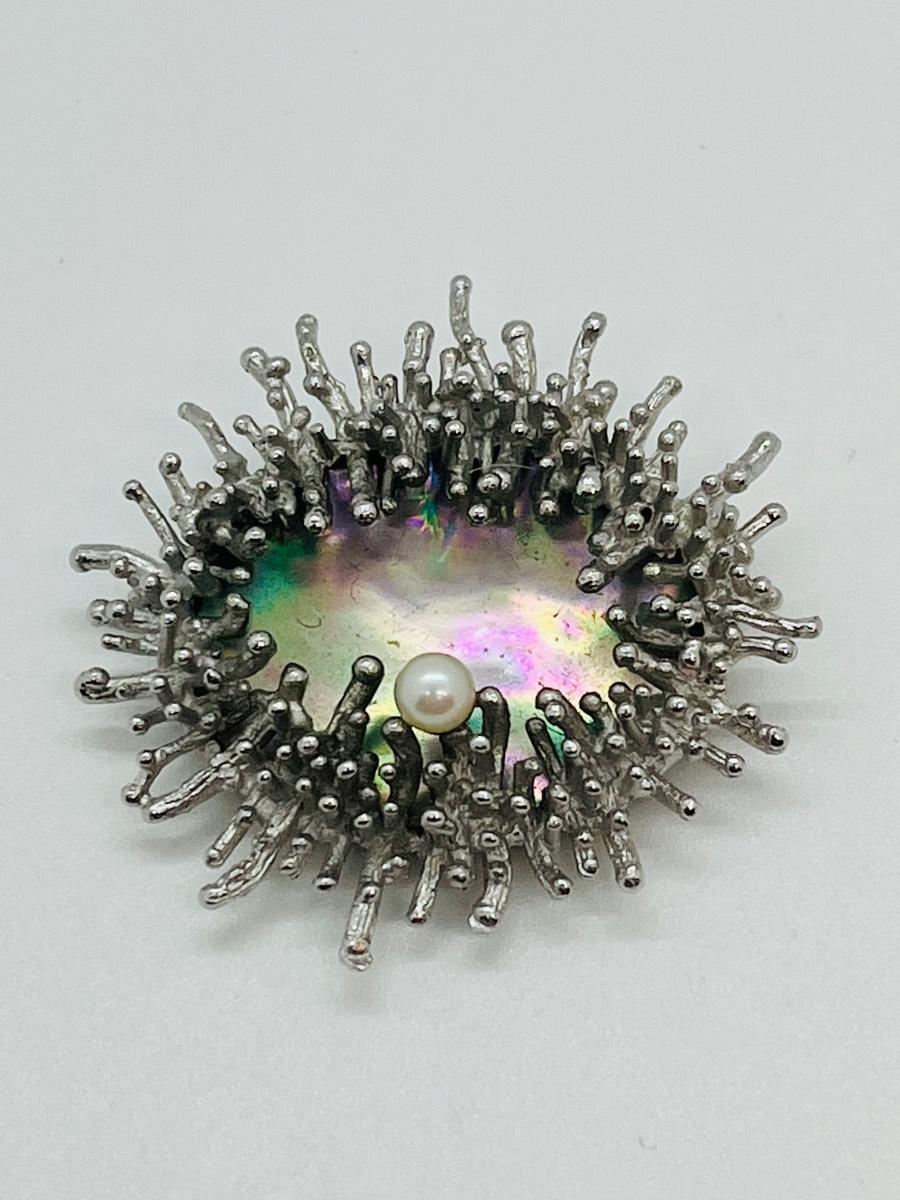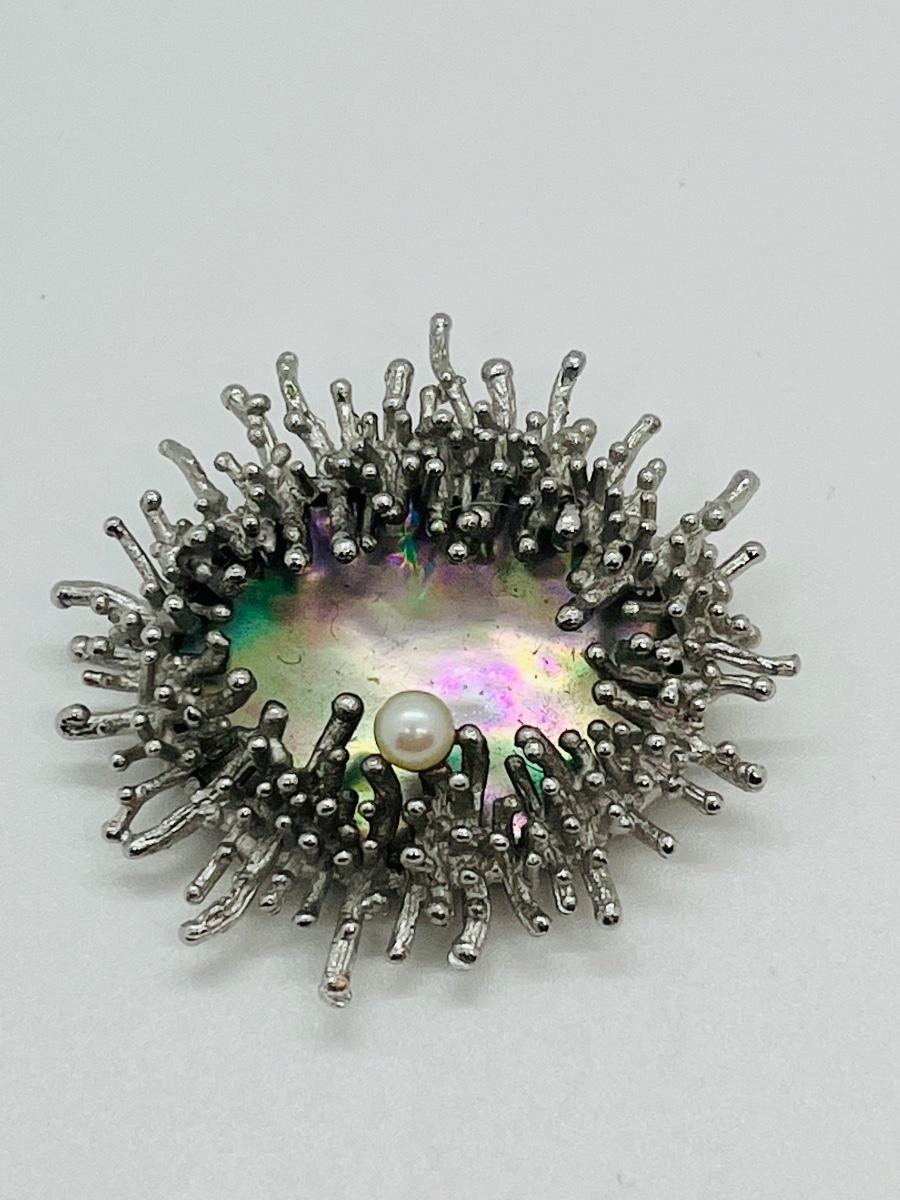 Lot 110: Silver Brooch Textured Frames, Abalone Backdrop, Center-Set Cultured Pearl, Marked 800