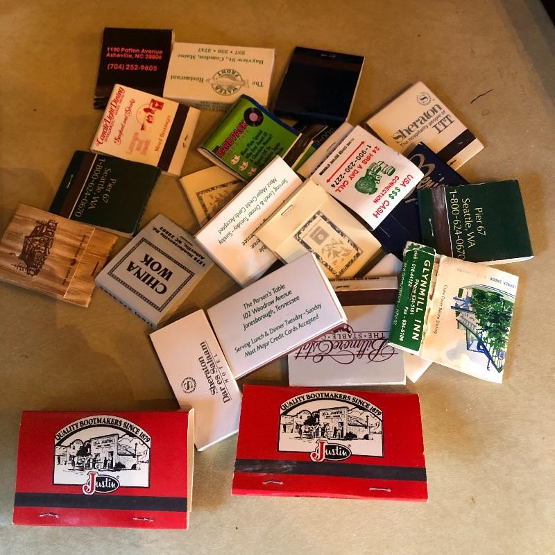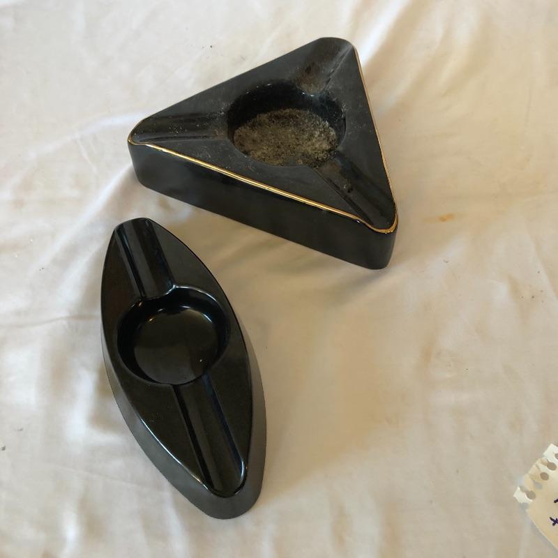 Vintage ashtrays & matches; the craftmen’s bench ashtray is ceramic and the other is plastic. The craftmen’s bench ash tray measures approximately 8” x 9”. The plastic ashtray measures 9” x 3.5”. Shipping available.