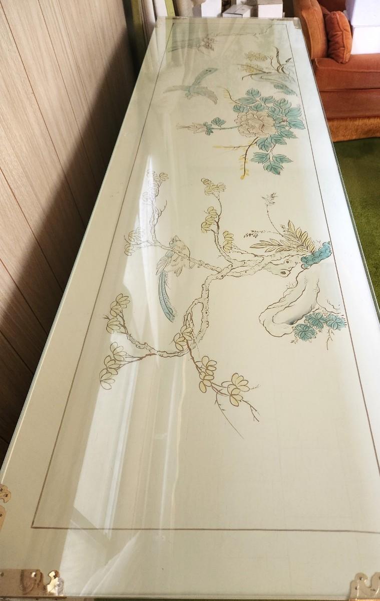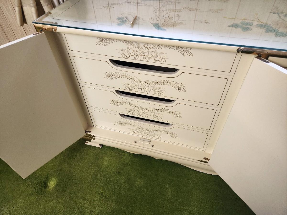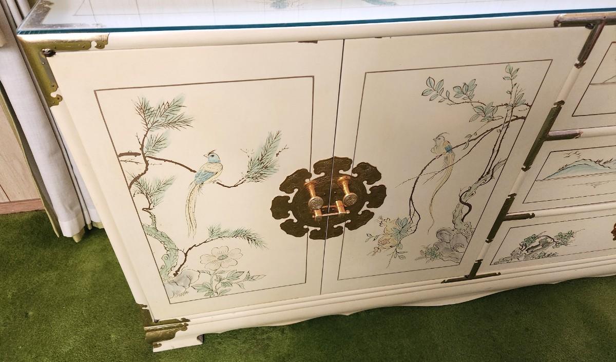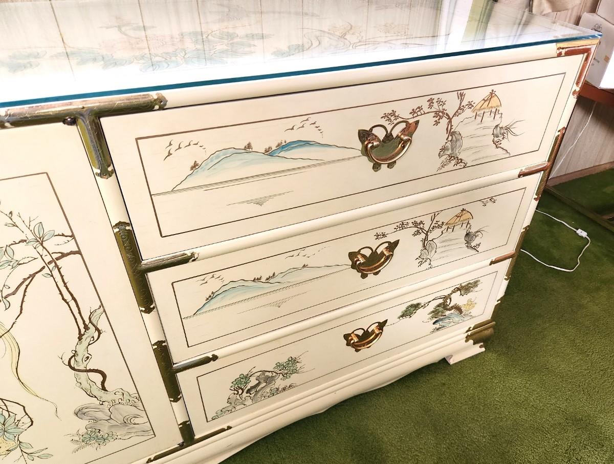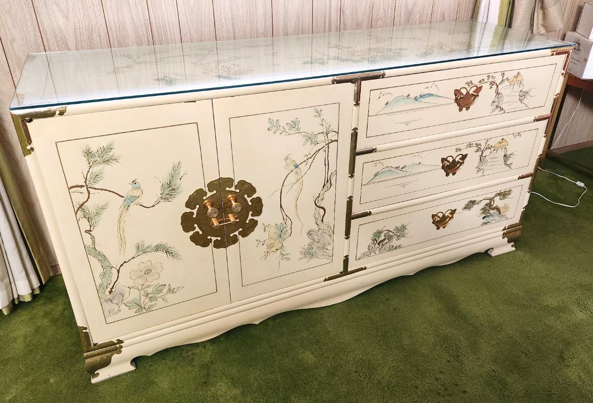 Nice Asian style dresser - 6 drawers, custom glass cover on top. 5 feet across, 18" deep, 31" tall. We have several pieces that match it in this sale. Use as a bedroom dresser or sideboard.