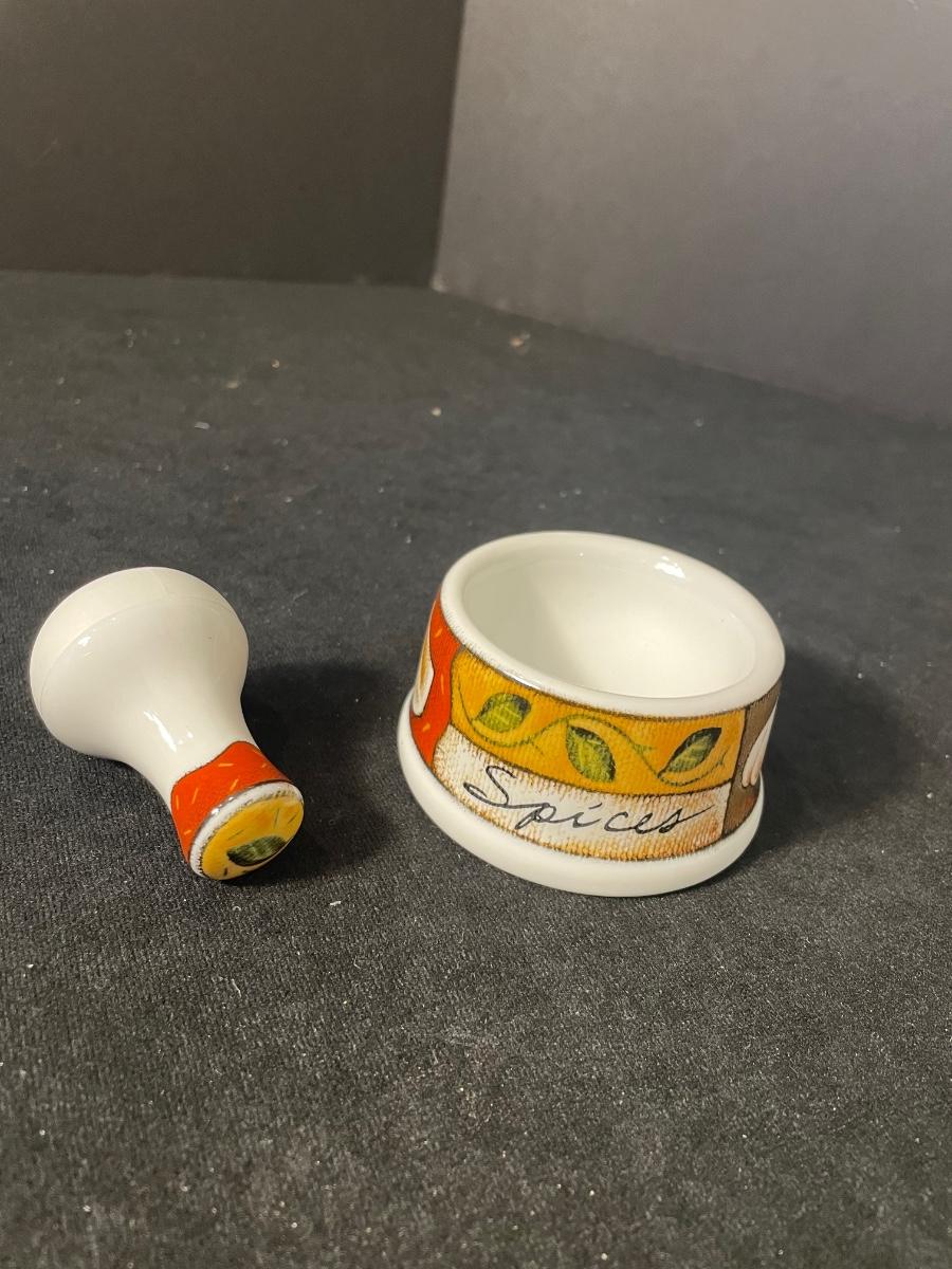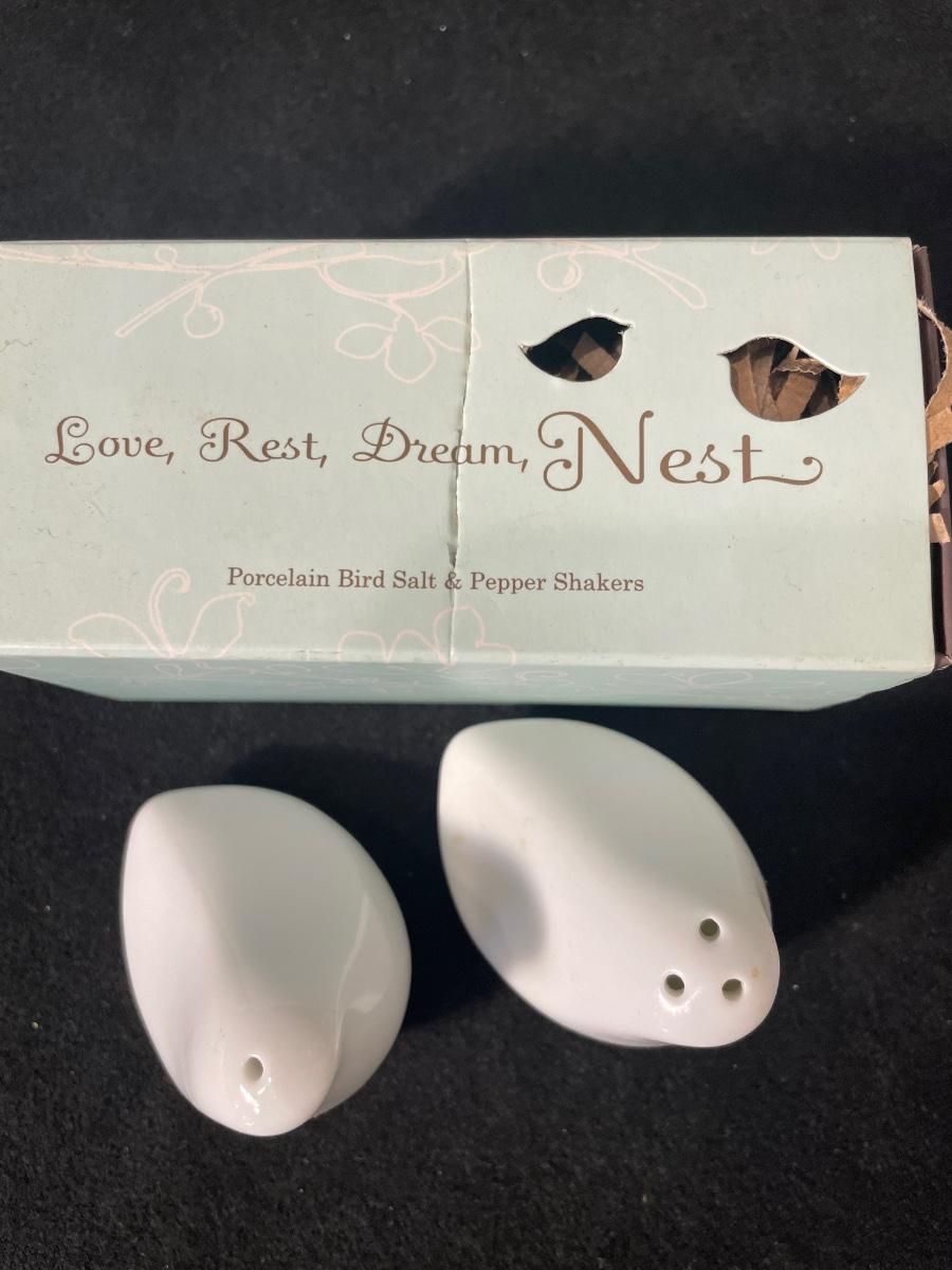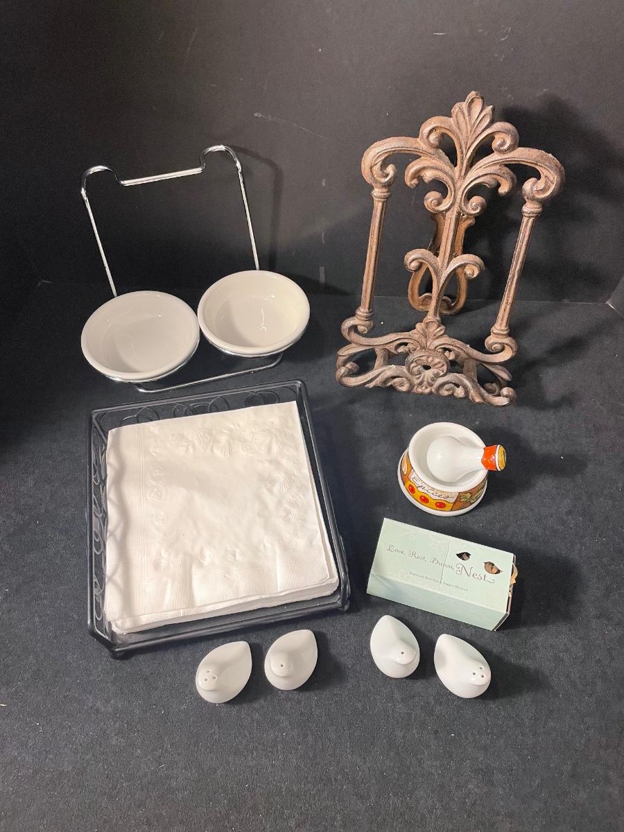 Includes decorative iron cookbook holder, mortar and pestle set, 2 sets of porcelain "bird" salt and pepper shakers, decorative napkin holder and condiment set.
