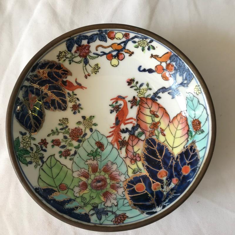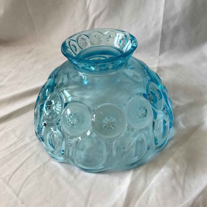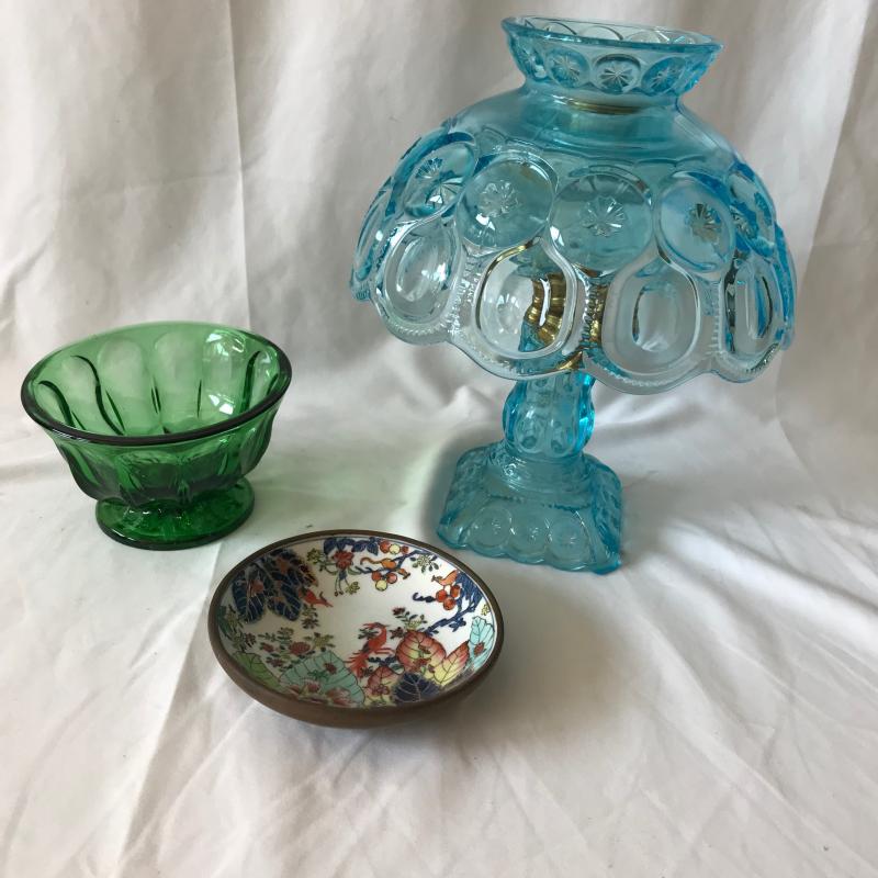 Beautiful Blue Glass Lamp shade and base. Missing parts for oil and to hold lamp shade. Base measures 9.5” tall. Shade is 10”diameter and 6.5” tall. Lot also includes green glass bowl (4”d x 6”h) and hand painted bowl with brass base from Hong Kong. Shipping or local pick up.
