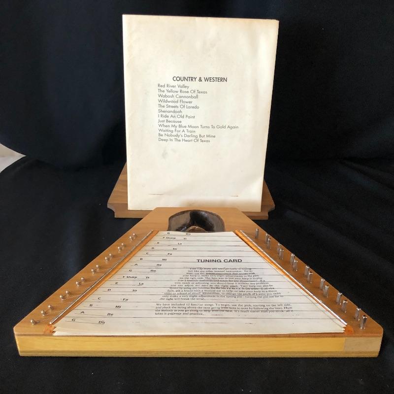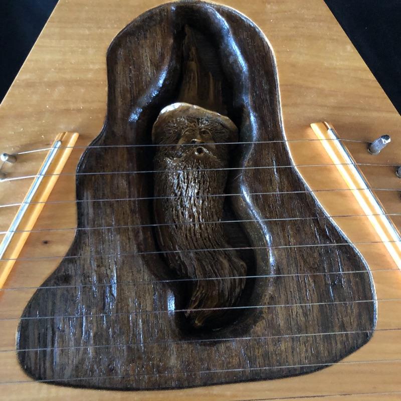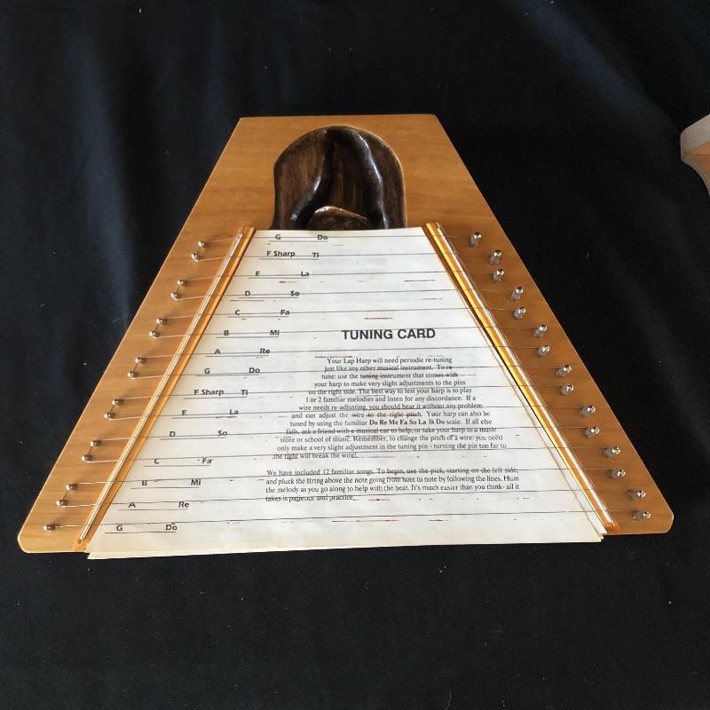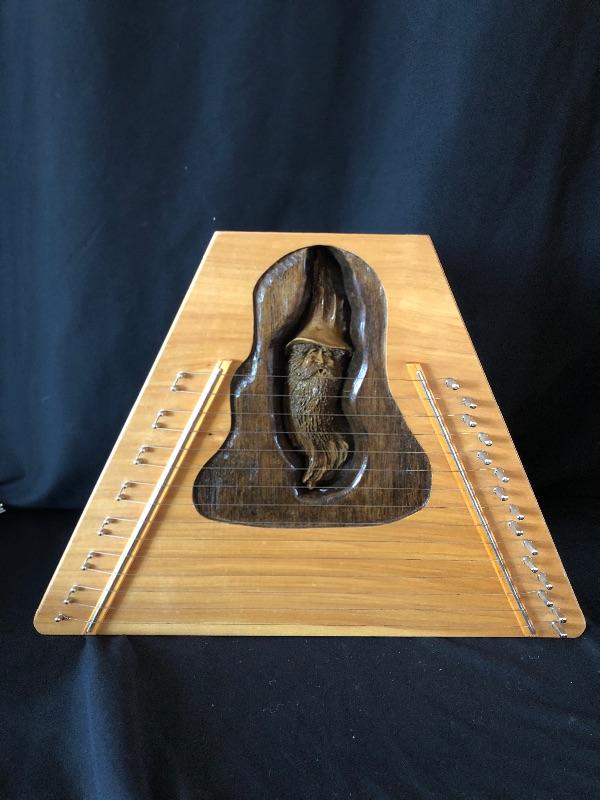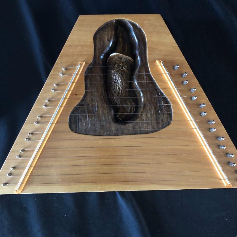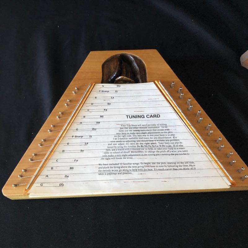 Get this handcrafted in the Blue Ridge mountains lap harp with carved mountain man and extra music. A great gift for the musical person in your family. Harp measures 11.5” x 15” x 1.5”.