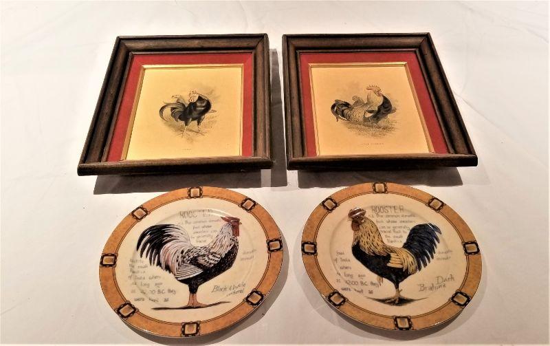 Little four piece chicken lot here - two vintage pictures in frames (cock & hen) and two decorator plates. Price is for the lot.