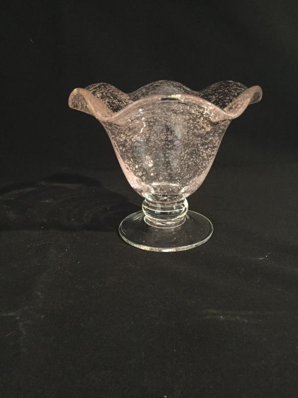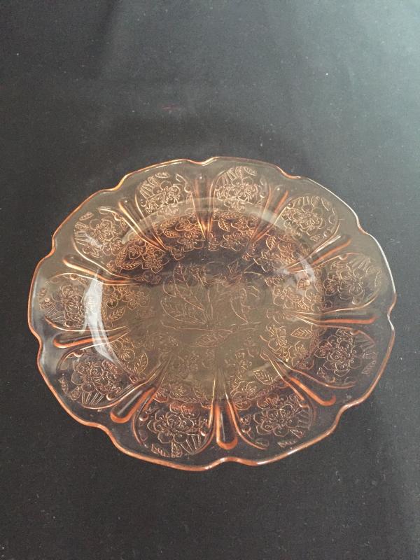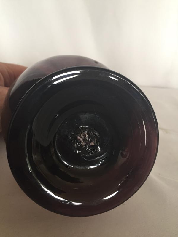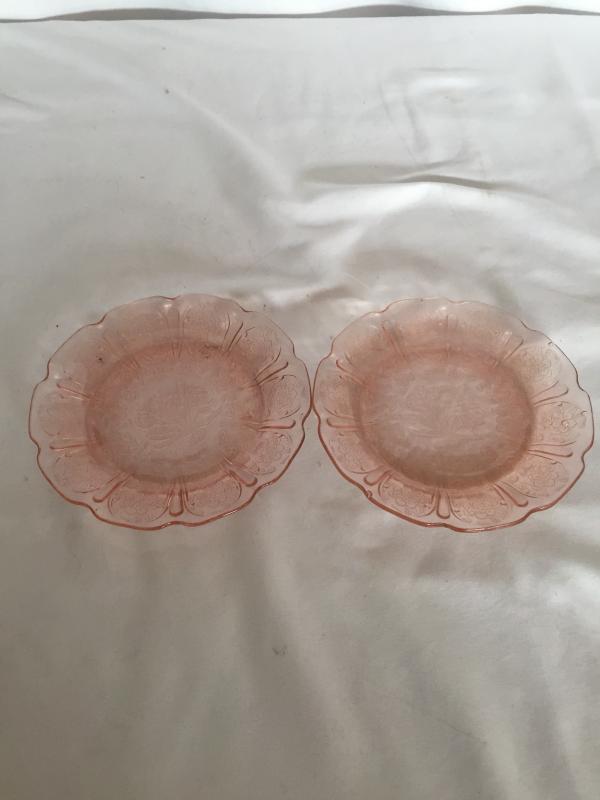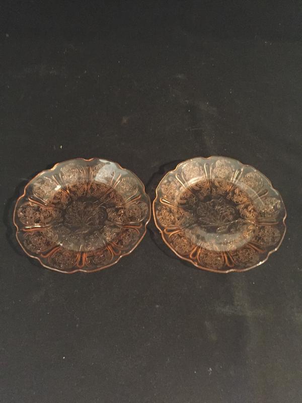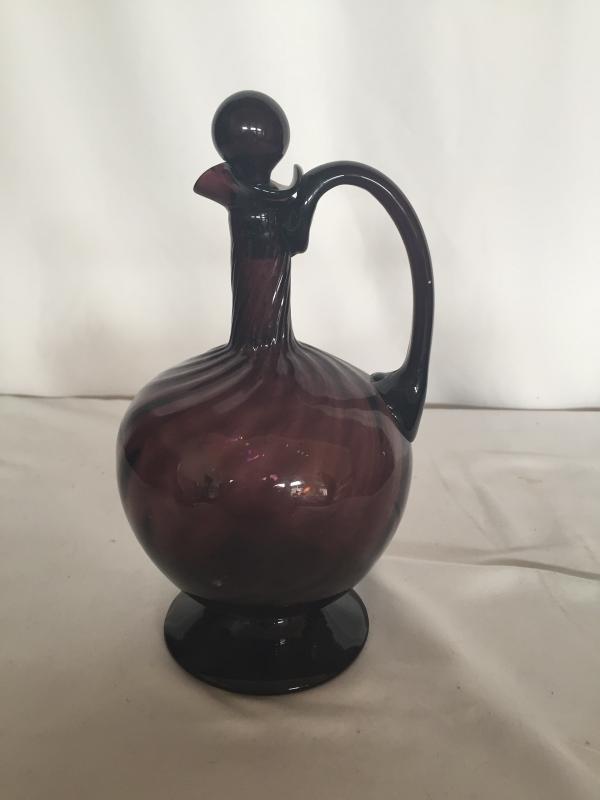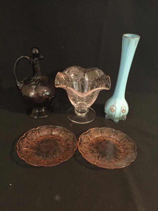 Stunning Colored Glass. Blue overlay Vase, Handblown dark purple pitcher with stopper that could be Fenton, Footer Dish and Pair of pink Depression Style Glass Plates. Vase Measures 10” Tall.