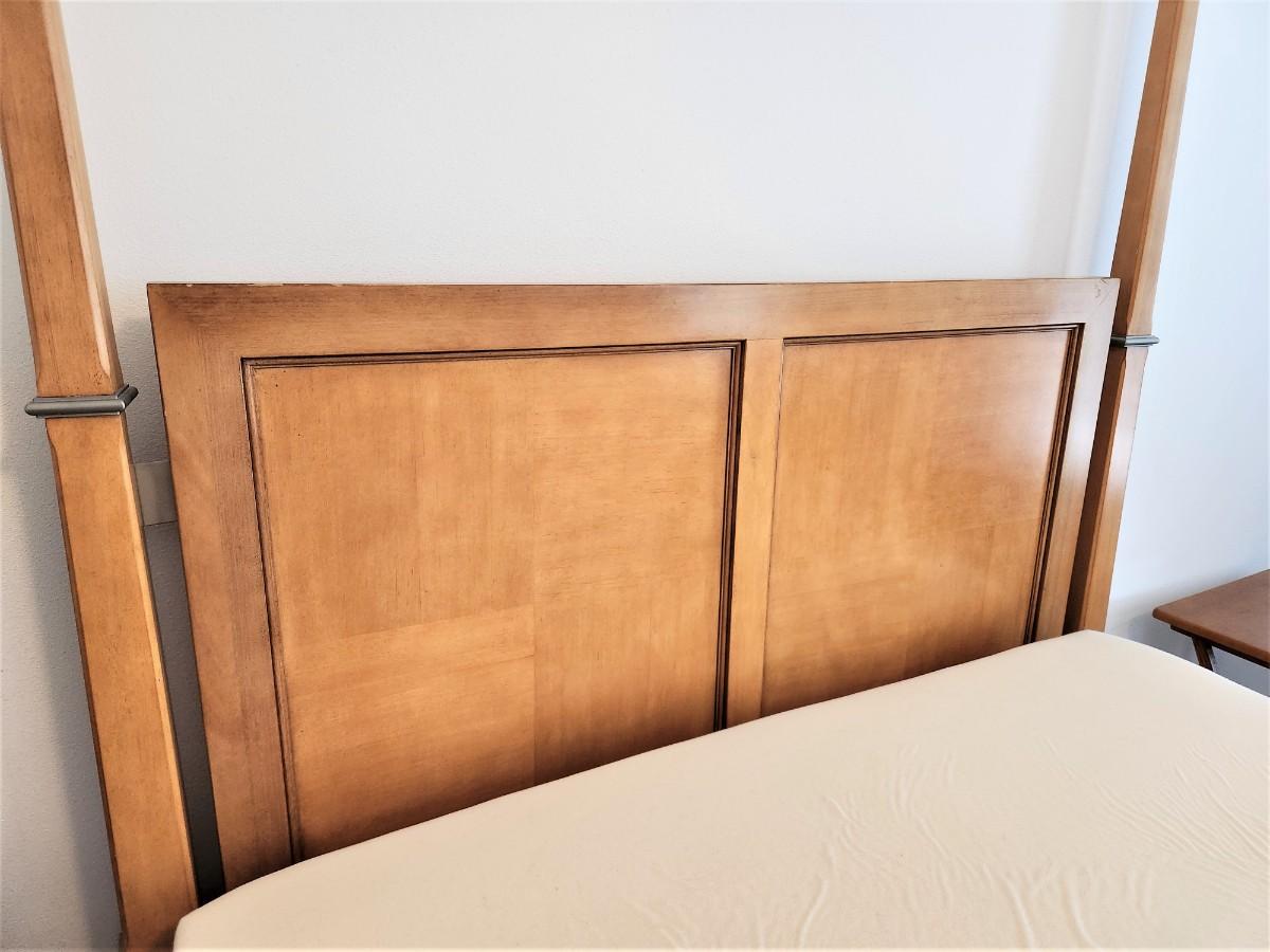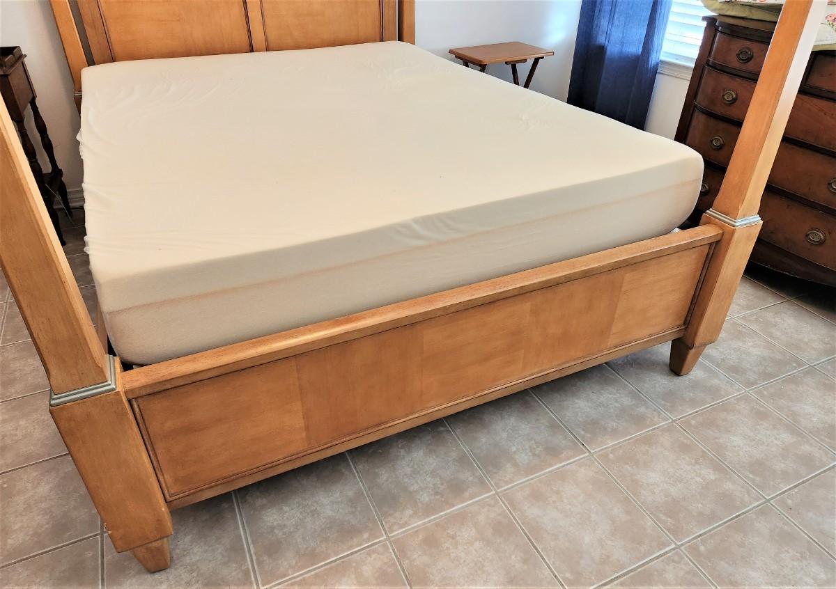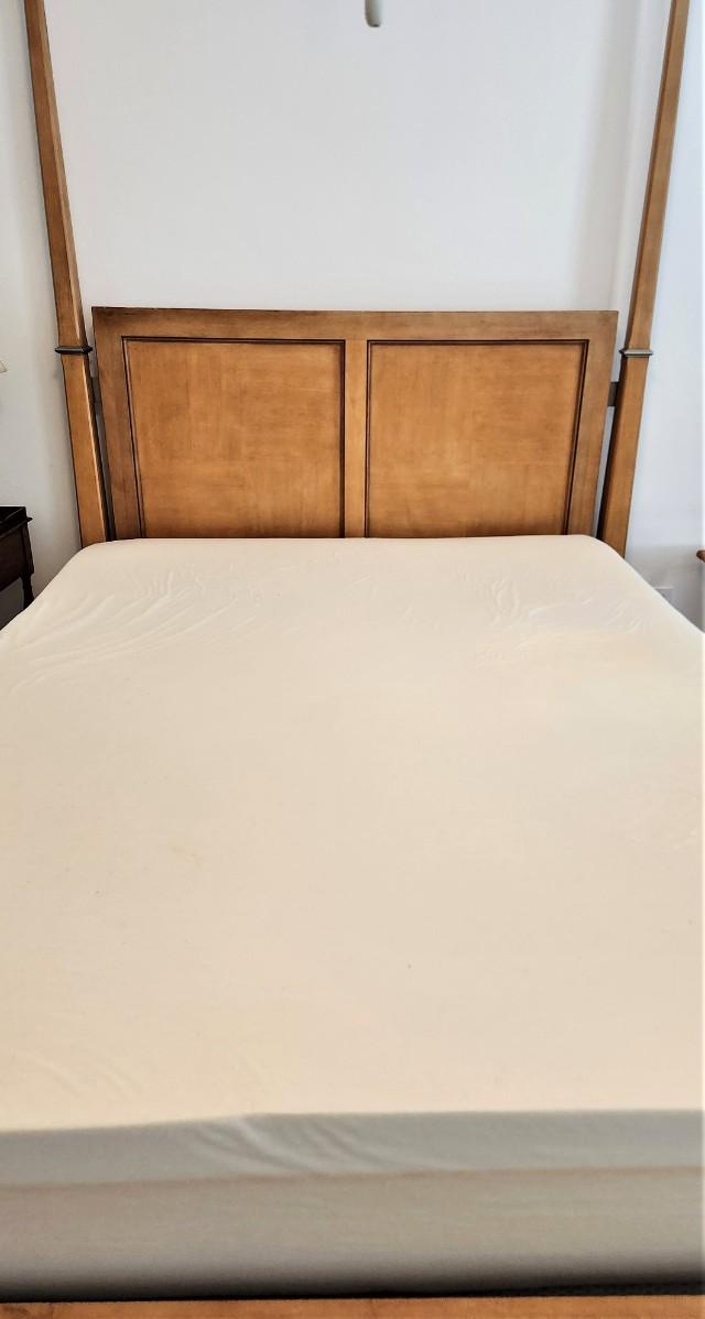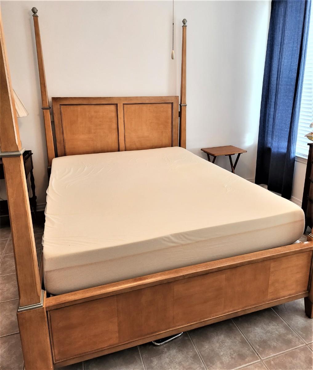 Quality 4-poster bed with super clean Memory Foam mattress (Queen). Great condition. 67" across at foot board, 90" long, 86" tall. Blond finish, grey metal accents.