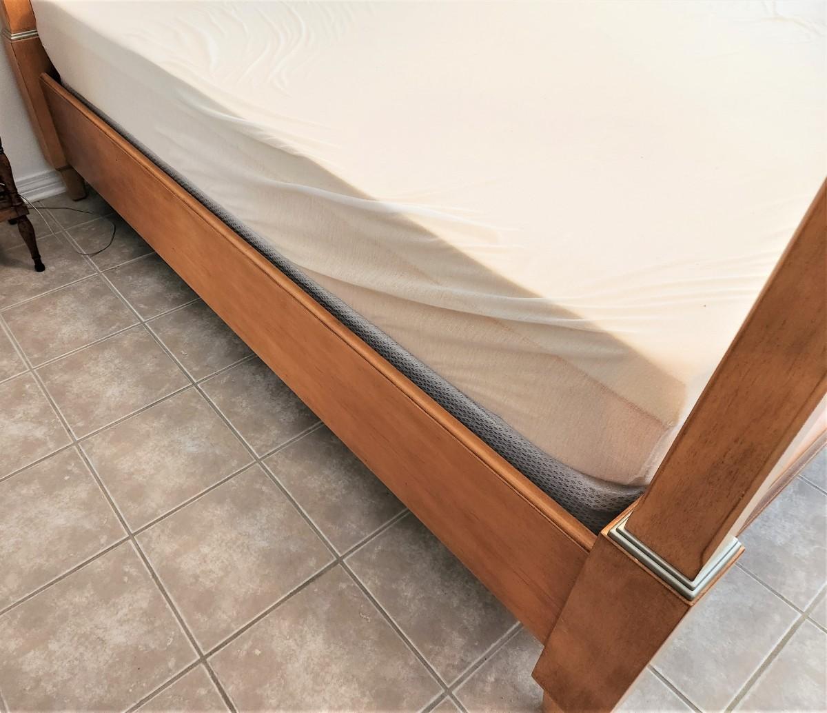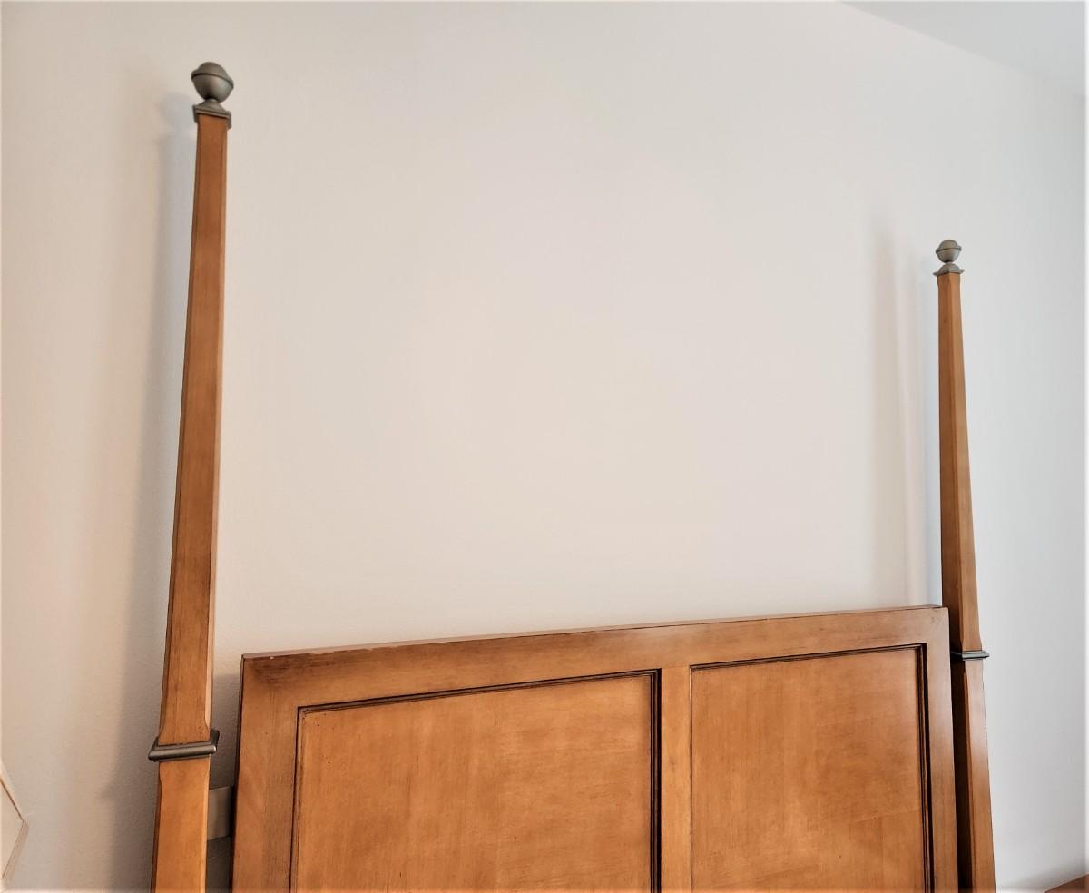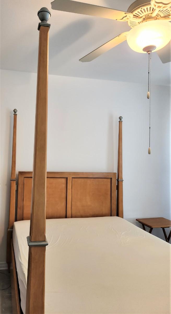Quality 4-poster bed with super clean Memory Foam mattress (Queen). Great condition. 67" across at foot board, 90" long, 86" tall. Blond finish, grey metal accents.