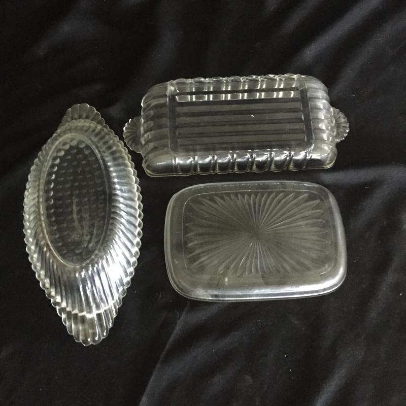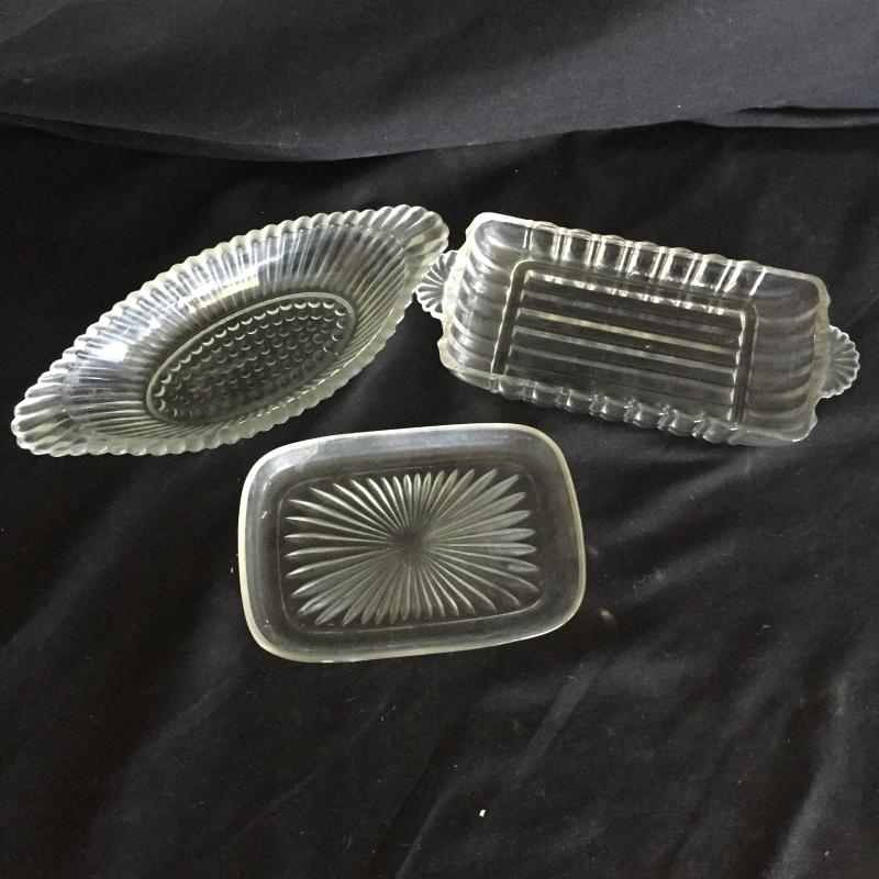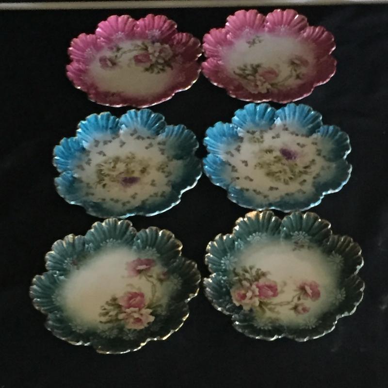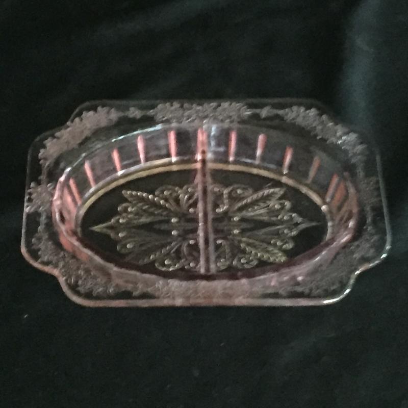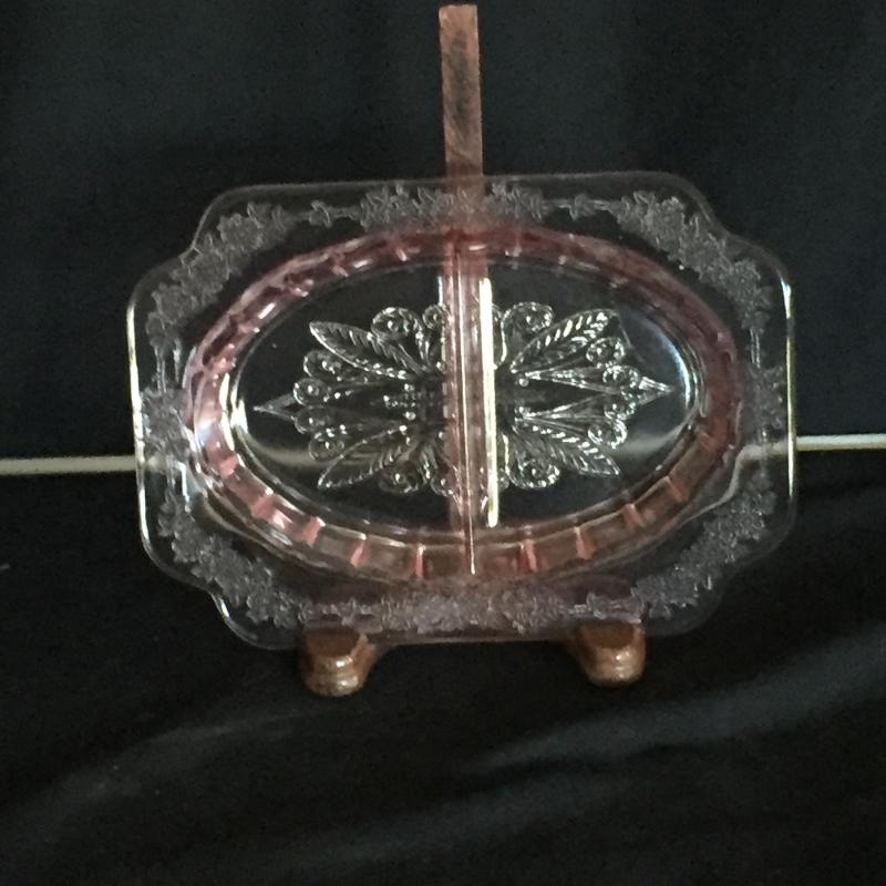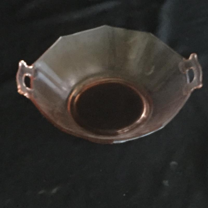 Pink and Clear Depression Glass and small China Plates. Depression Bowl Measures 9”D on Top.