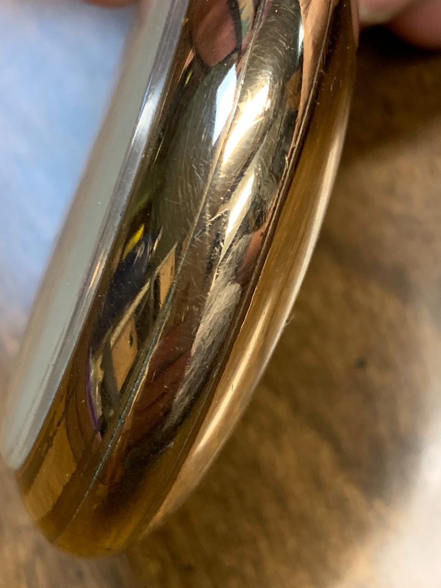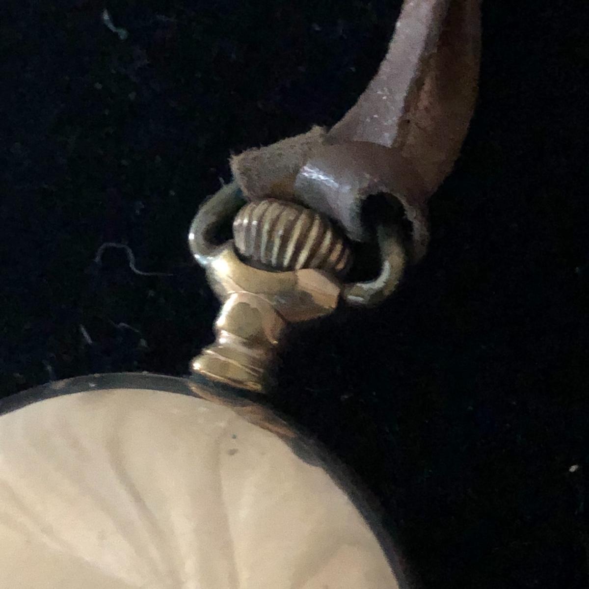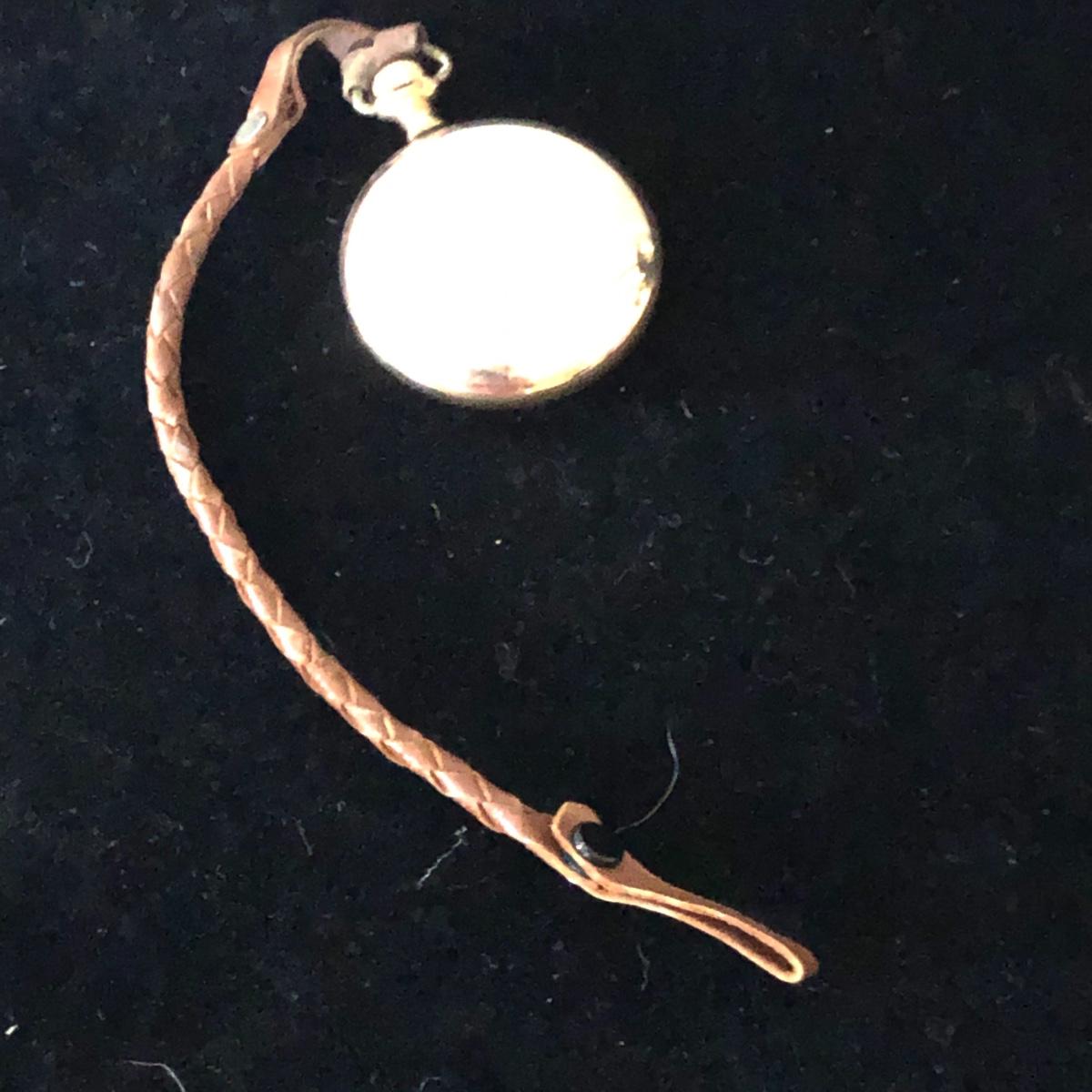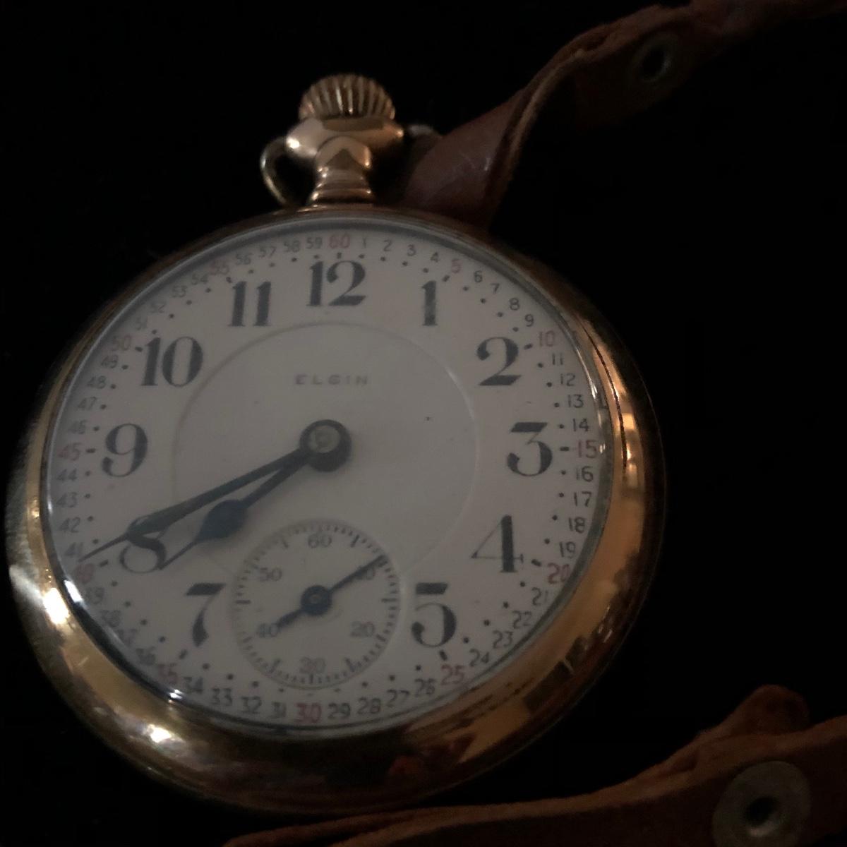 This Elgin pocket watch comes with a leather strap. Check out the detail on its’ face. It winds, ticks however, it seems as if it’s’ hands do not move. Unable open back to obtain serial numbers. Shipping Available.