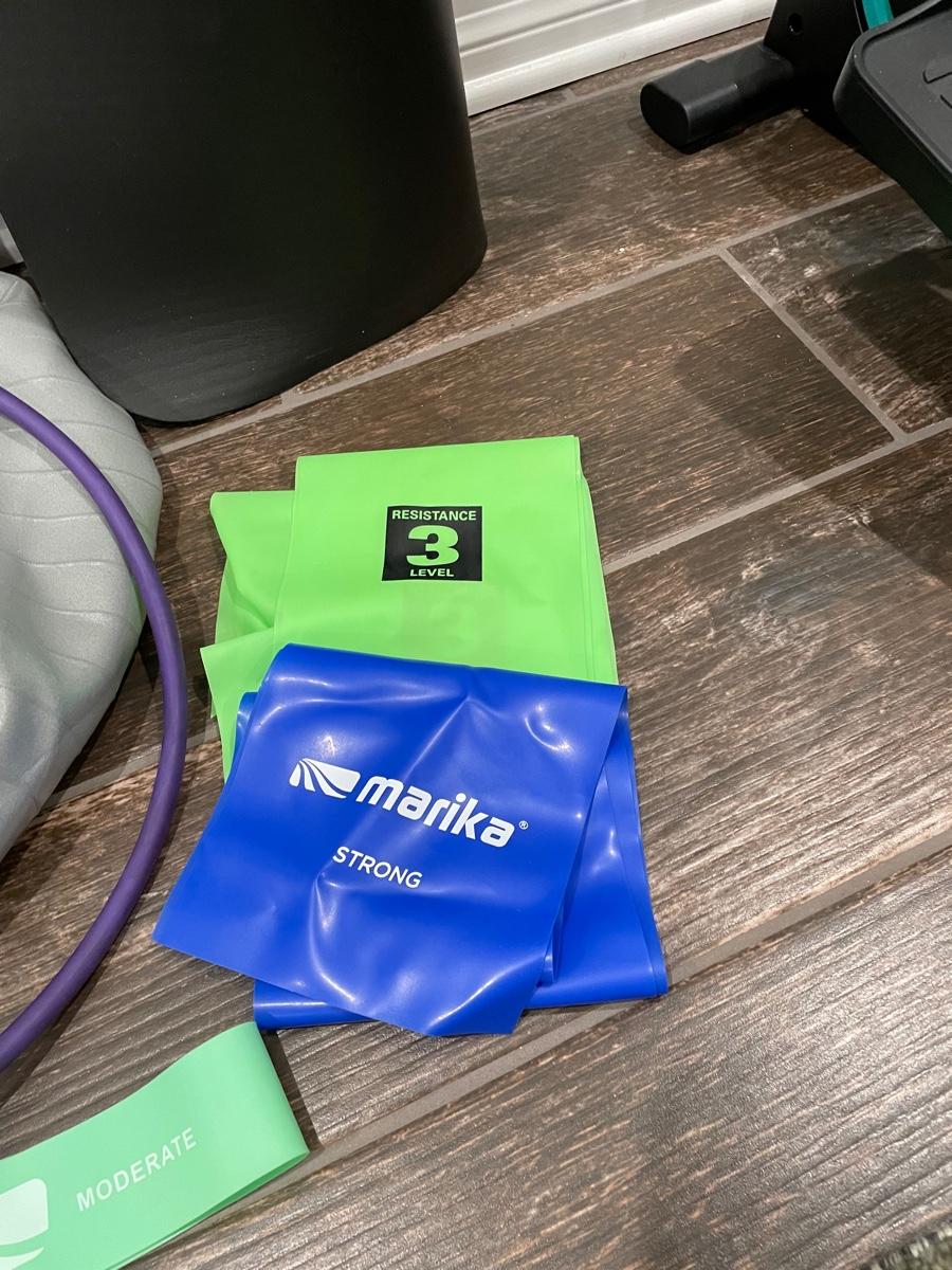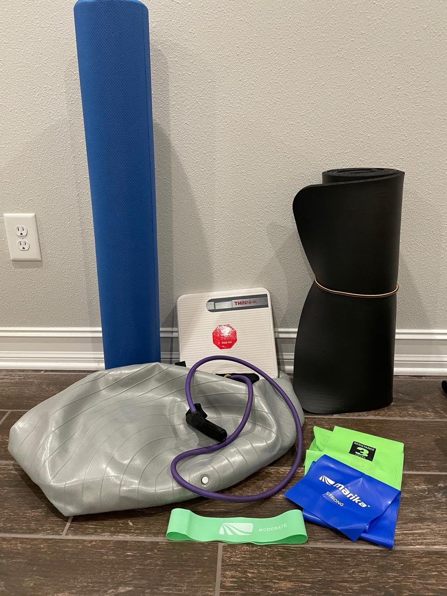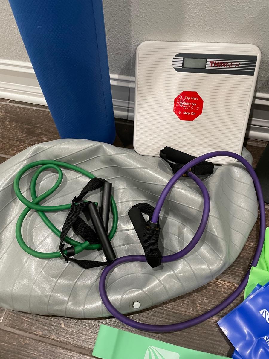 Balance ball, foam roller, foam exercise mat, 2 pair of resistance bands with handles, two flat bands plus a circlular band, bathroom scale