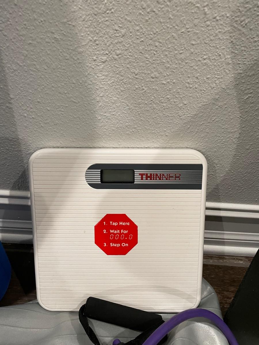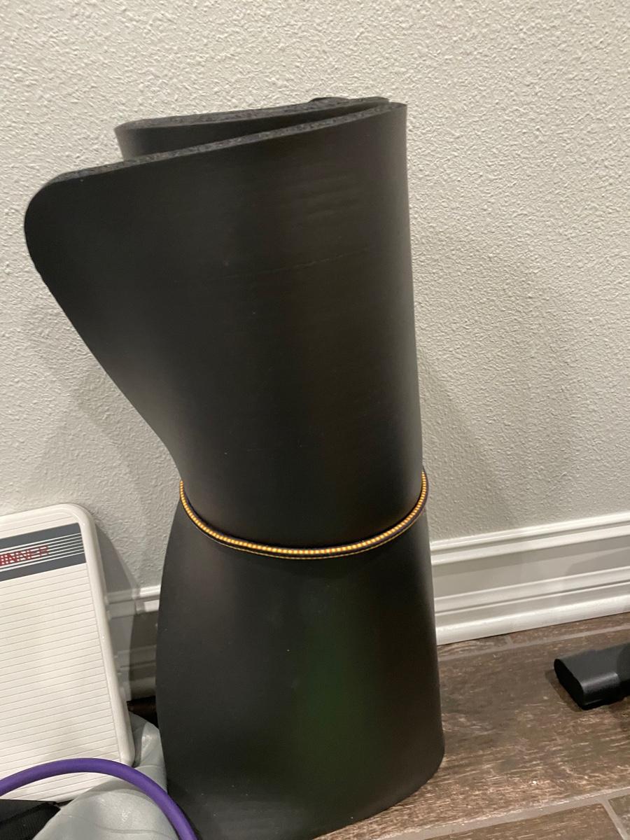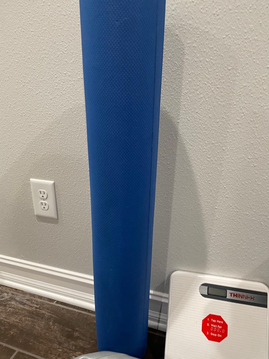 Balance ball, foam roller, foam exercise mat, 2 pair of resistance bands with handles, two flat bands plus a circlular band, bathroom scale