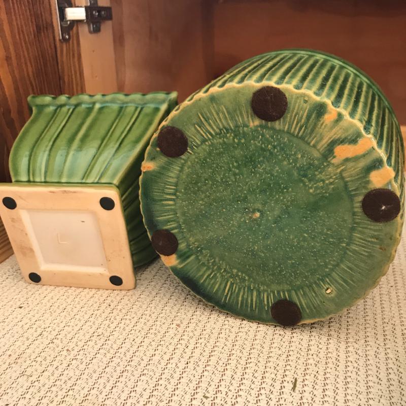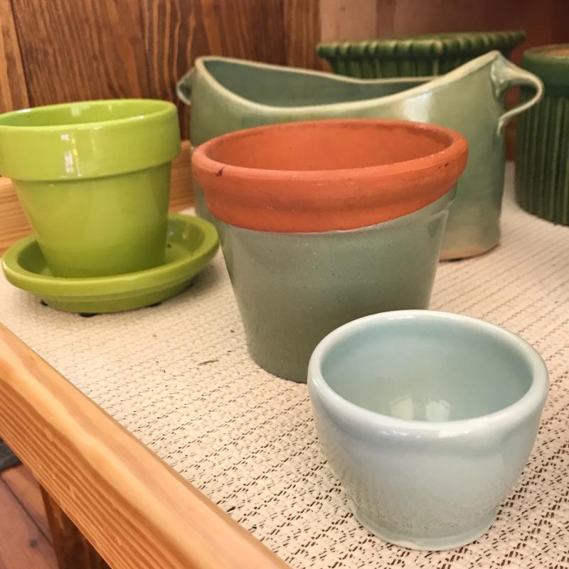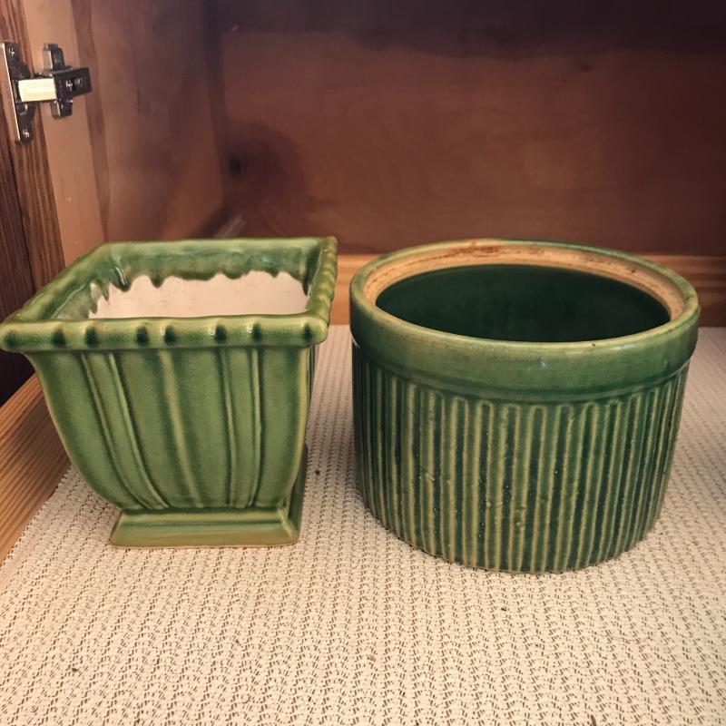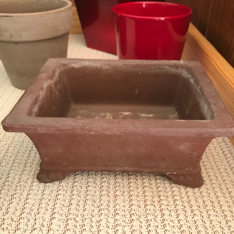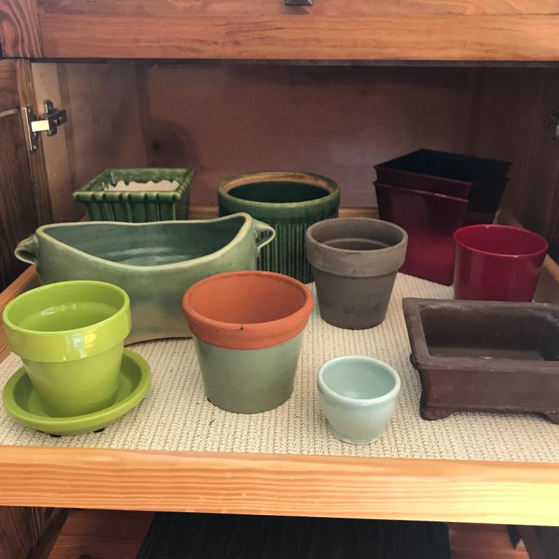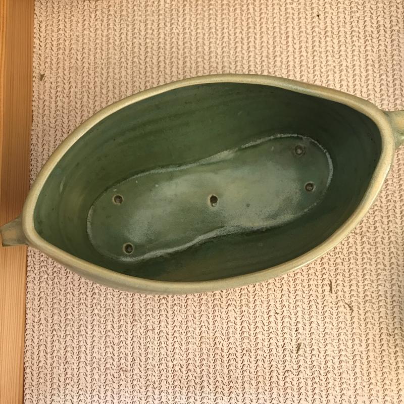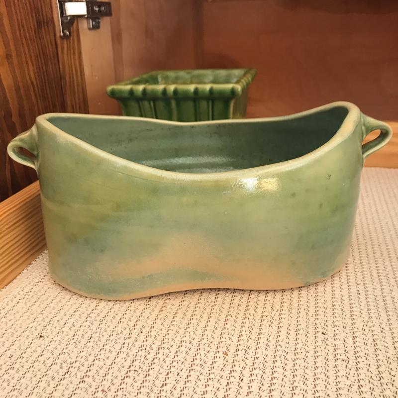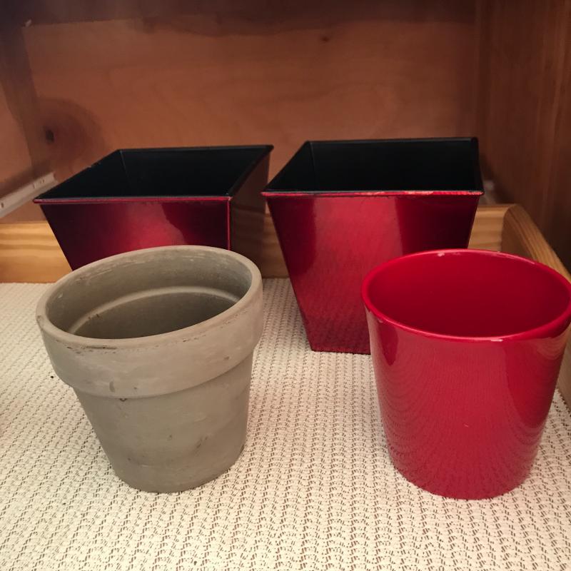 Various sizes of pots for plants. Larger oval one measures 11”l x 5”w