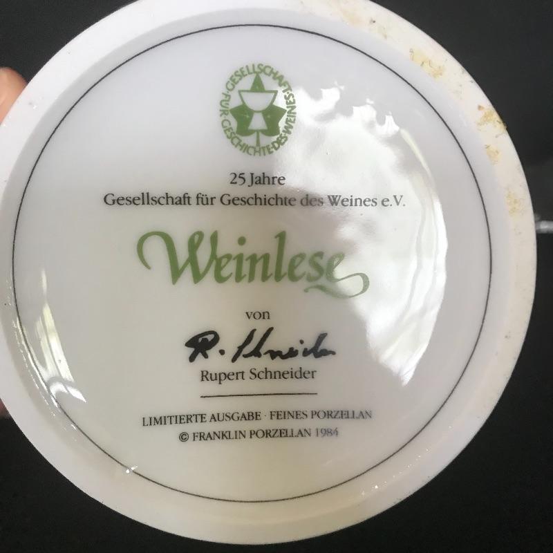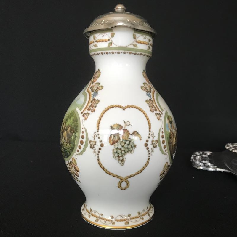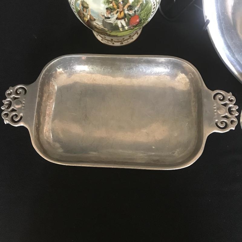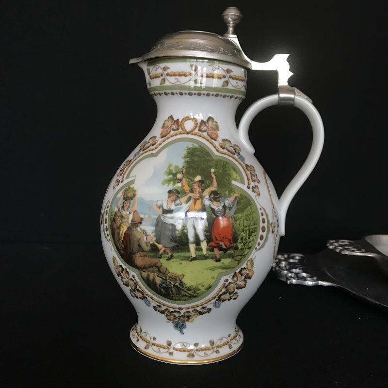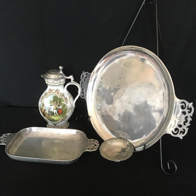 Pewter lot with two matching heavy serving trays, the larger round has a 16” diameter and is 20” including the handles. The smaller tray is marked 210 and the large round tray has 220 with another marking. A wonderfully painted porcelain pitcher marked Weinlese von Rupert Schneider, see photos. Lastly a small lightweight bowl to complete the lot. Shipping available.