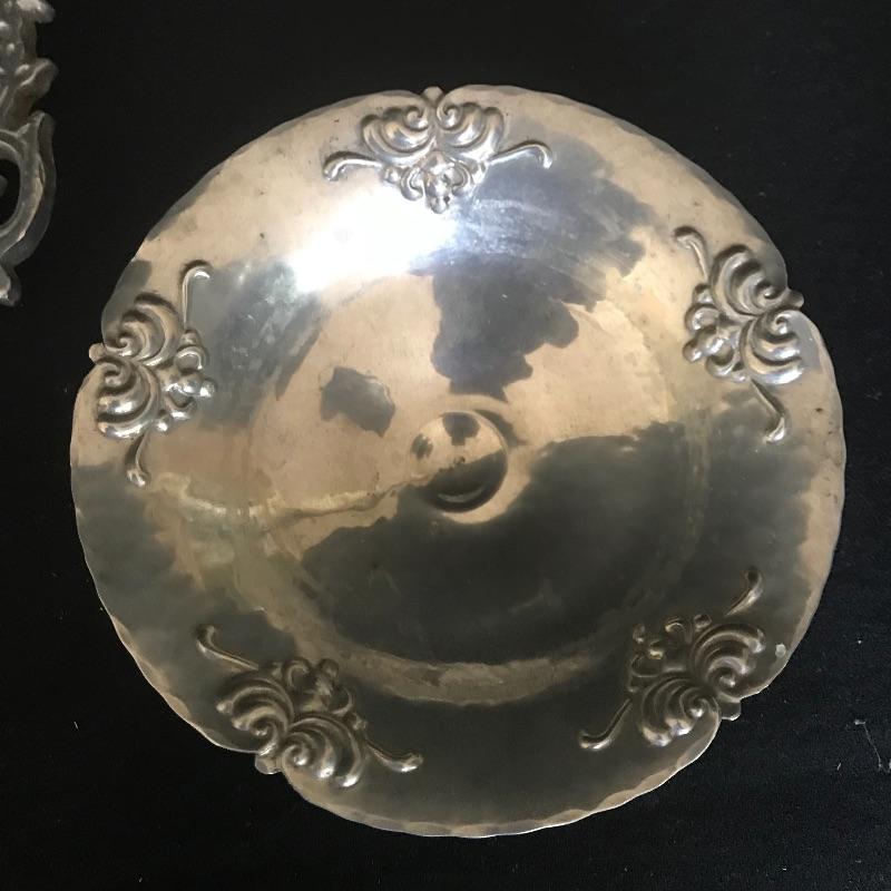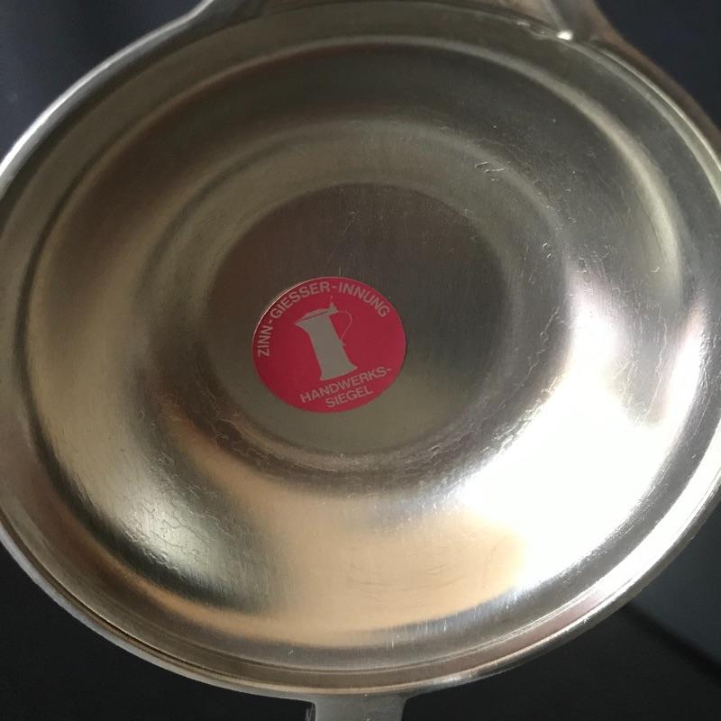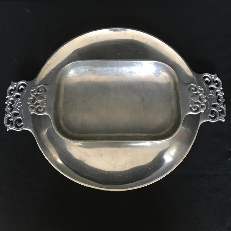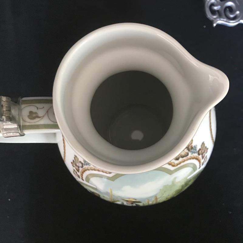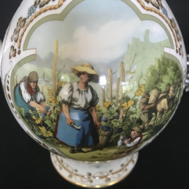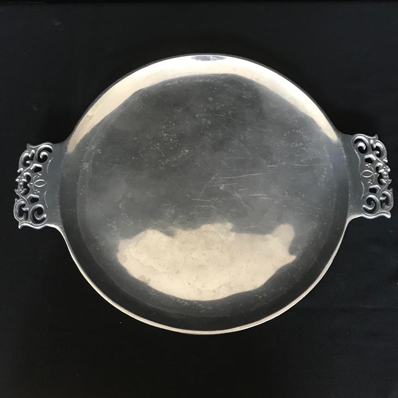 Pewter lot with two matching heavy serving trays, the larger round has a 16” diameter and is 20” including the handles. The smaller tray is marked 210 and the large round tray has 220 with another marking. A wonderfully painted porcelain pitcher marked Weinlese von Rupert Schneider, see photos. Lastly a small lightweight bowl to complete the lot. Shipping available.