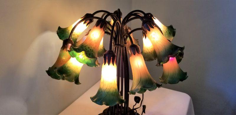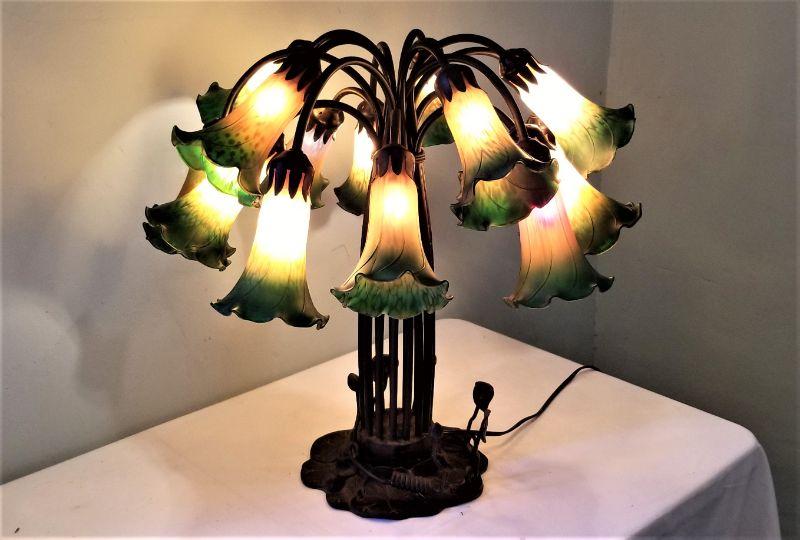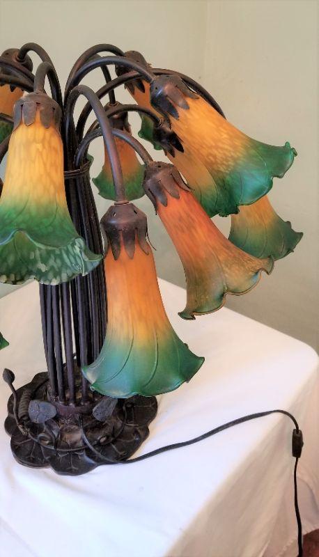 This contemporary table lamp is a real beauty with 15 tulip shades. Switch is on the cord - good working condition - each tulip is 6" long, lamp is 22" tall. Note that one shade has less "green" at the bottom than the others - appears to have been made that way. Wanted to mention for accuracy.