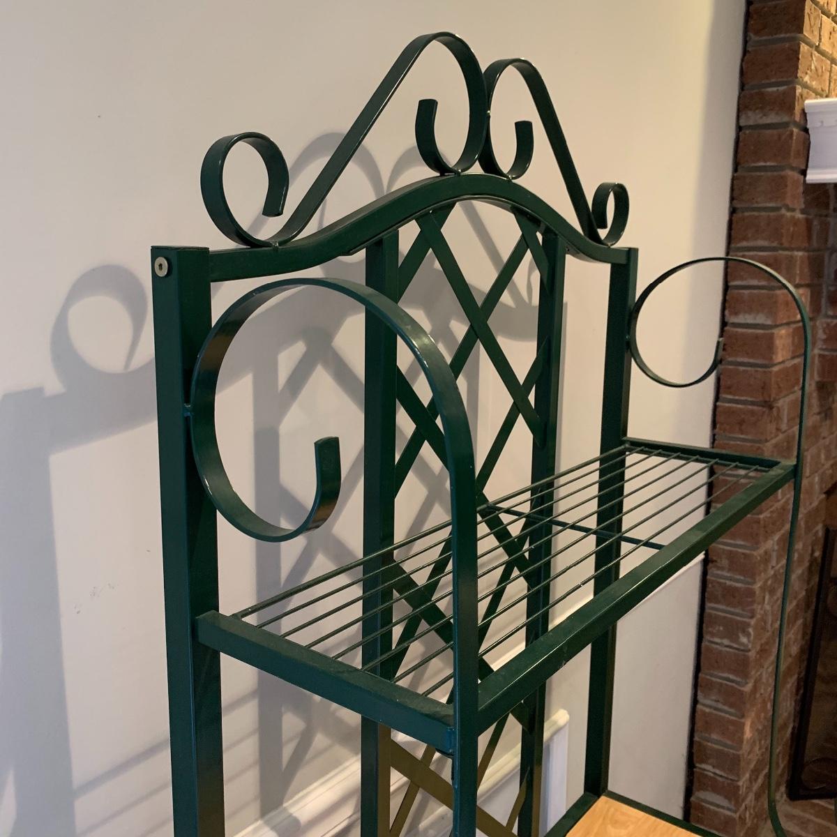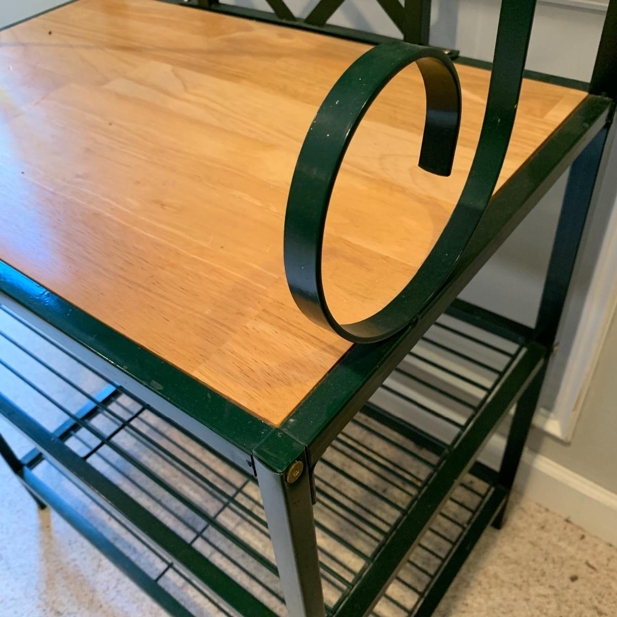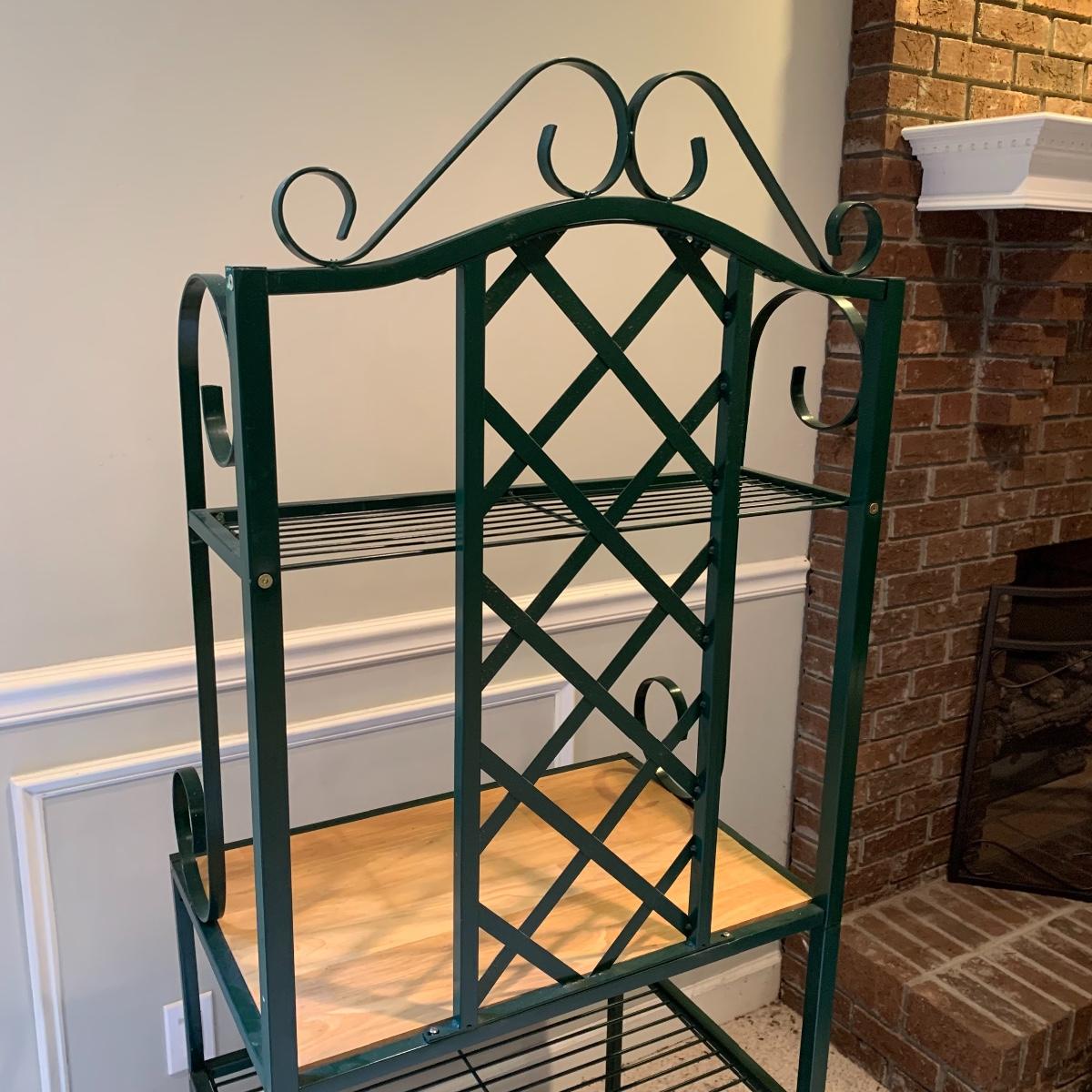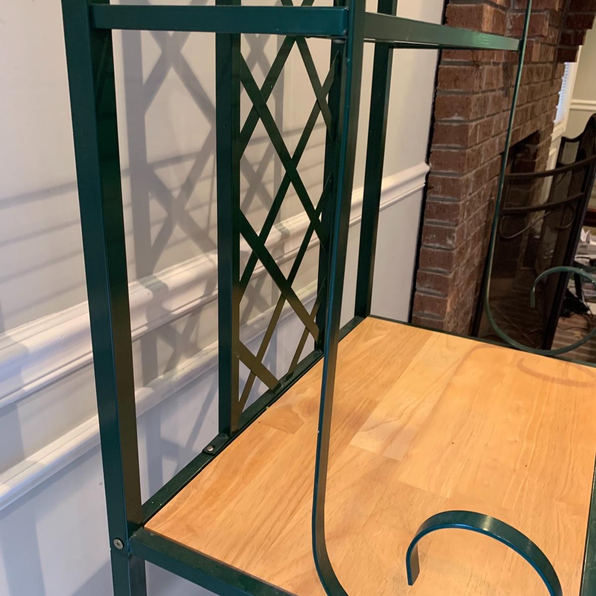 This bakers rack is in great condition. It is a lovely forest green metal rack with a main wooden shelf, two lower metal shelves, and a smaller upper metal shelf. It has a lovely lattice design on the back and swirled accents on the top and sides. It measures 18”x27”x64.5”. The height of the wooden shelf is 29.5”. It is fairly small and lightweight so should be easy to move, but if disassembly is required an Allen wrench and Phillips head screwdriver will be needed. Local pickup only.