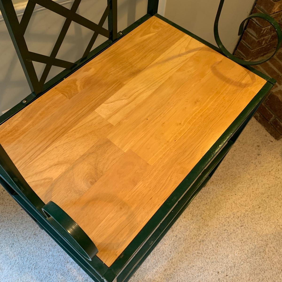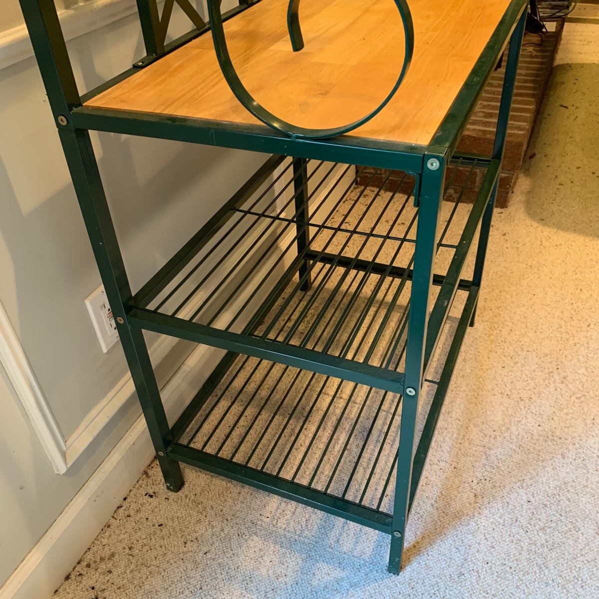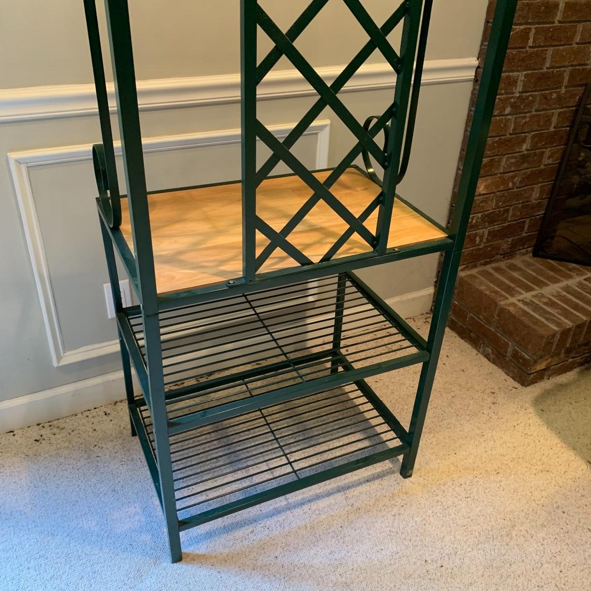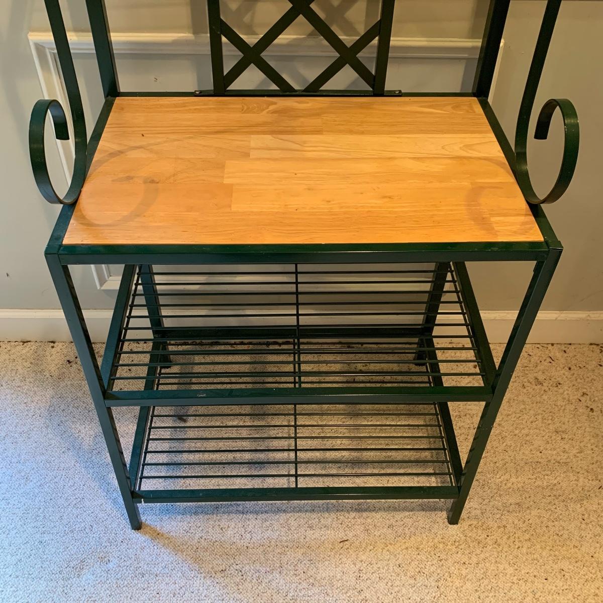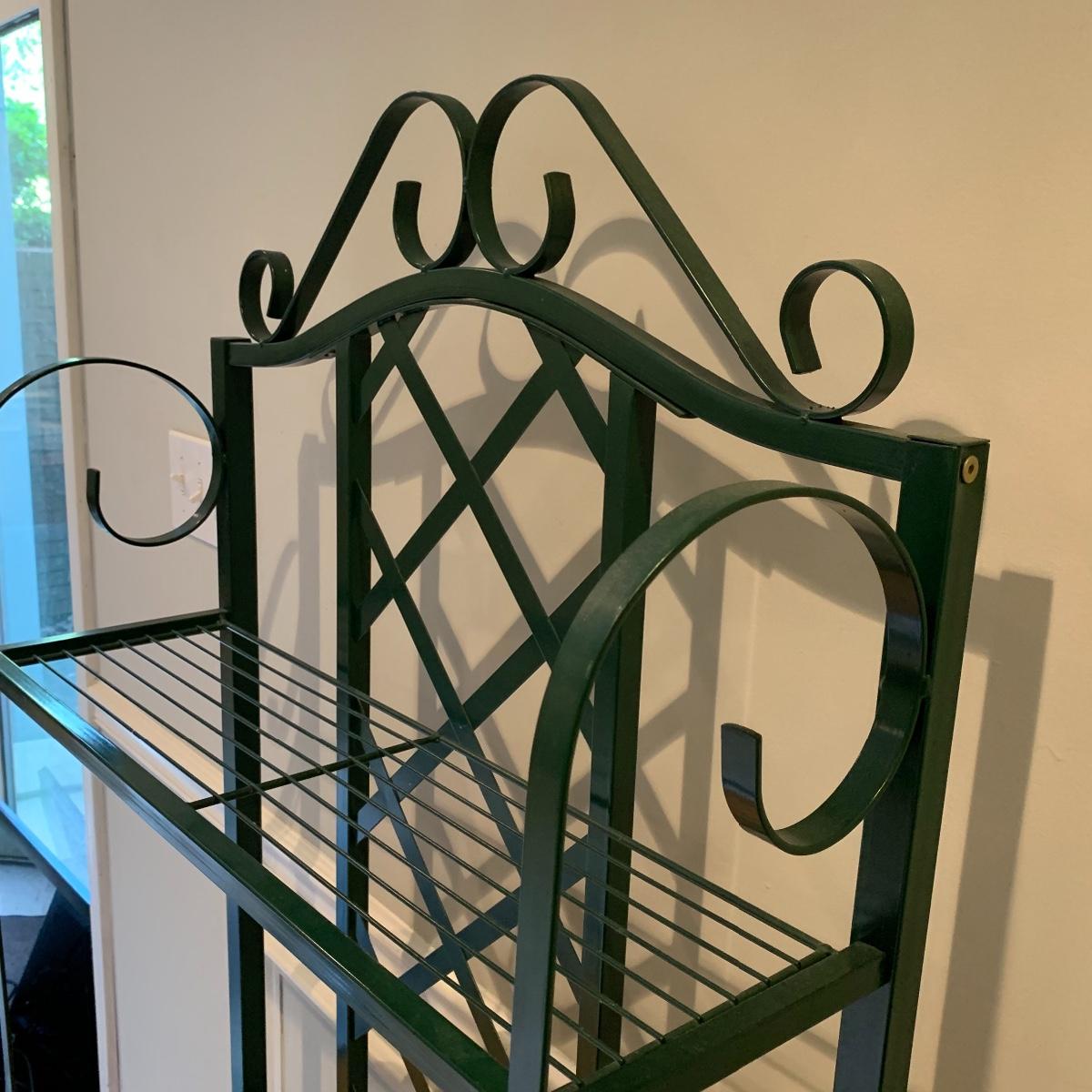 This bakers rack is in great condition. It is a lovely forest green metal rack with a main wooden shelf, two lower metal shelves, and a smaller upper metal shelf. It has a lovely lattice design on the back and swirled accents on the top and sides. It measures 18”x27”x64.5”. The height of the wooden shelf is 29.5”. It is fairly small and lightweight so should be easy to move, but if disassembly is required an Allen wrench and Phillips head screwdriver will be needed. Local pickup only.