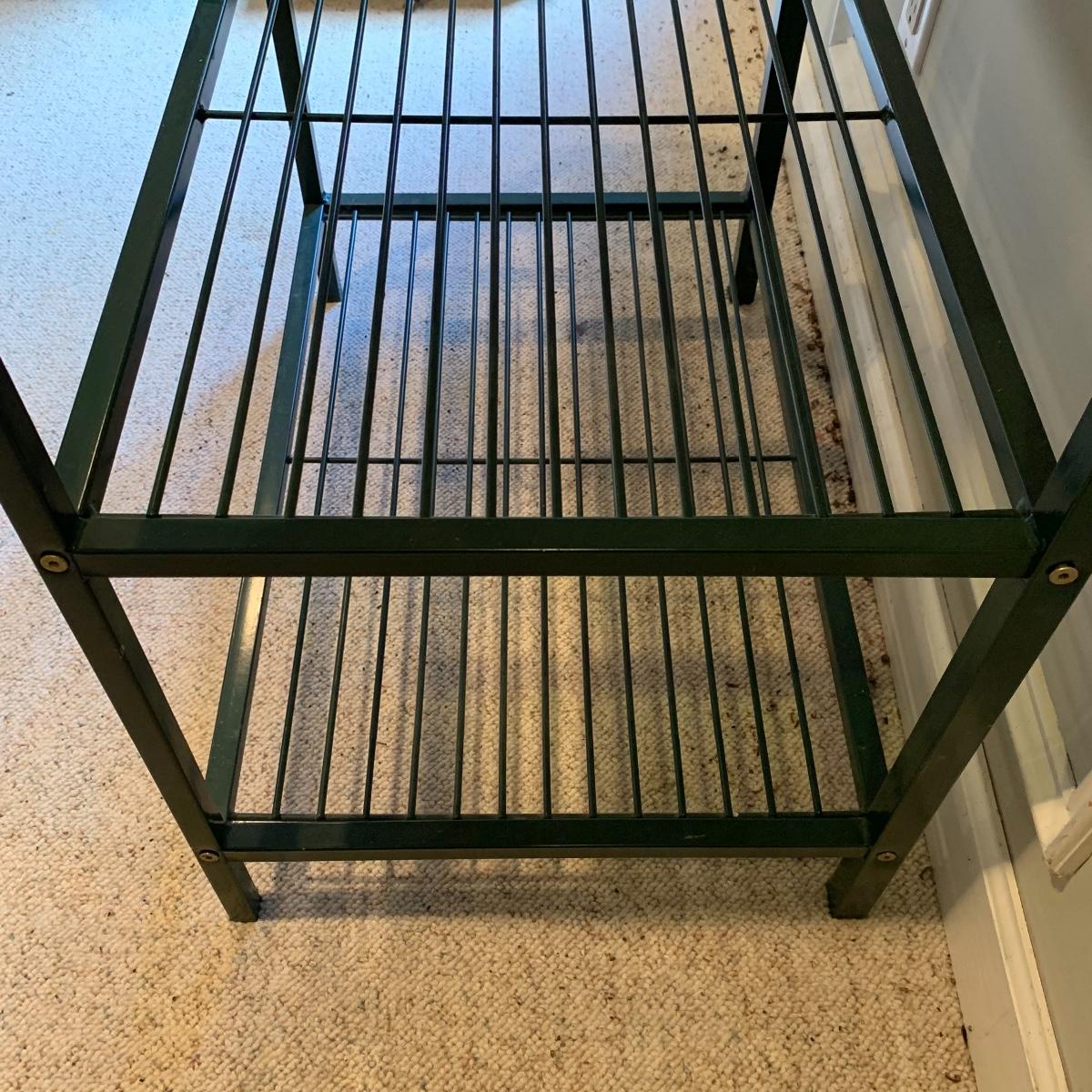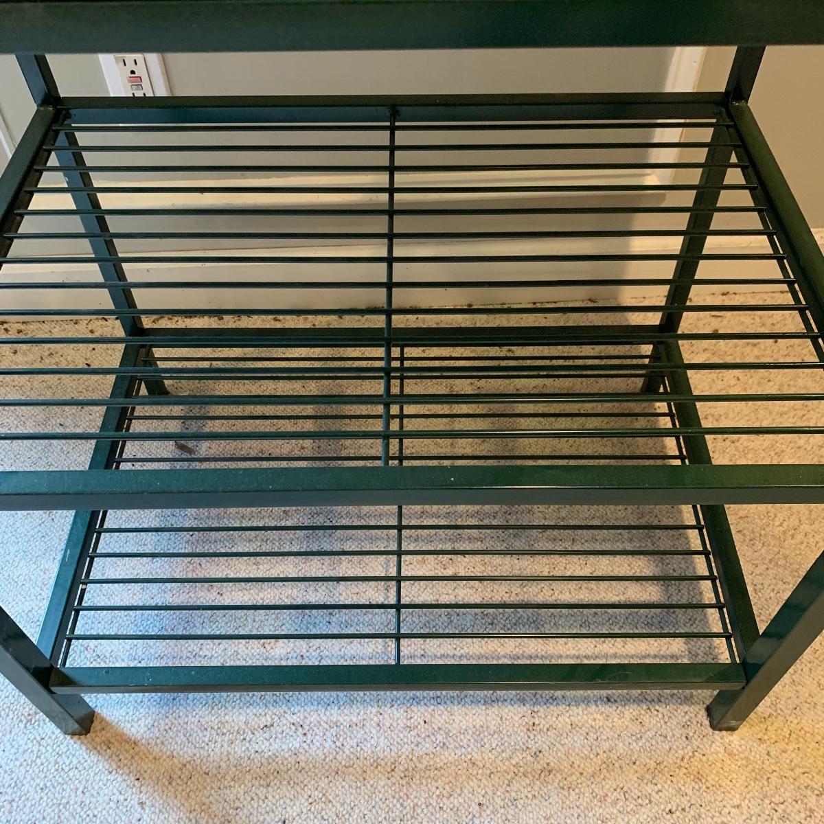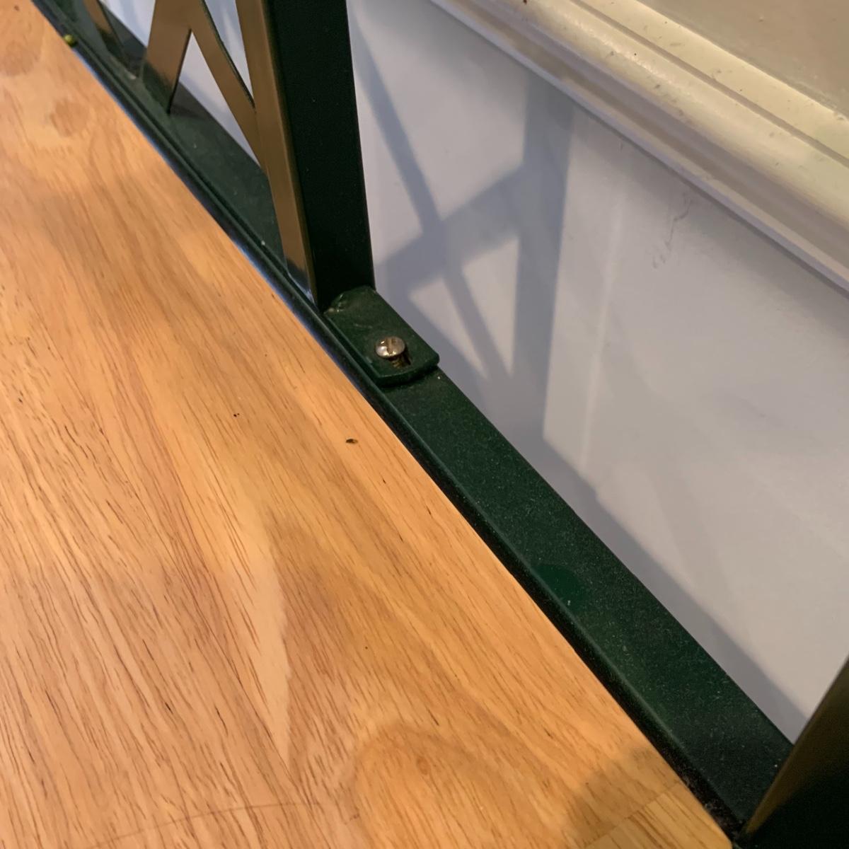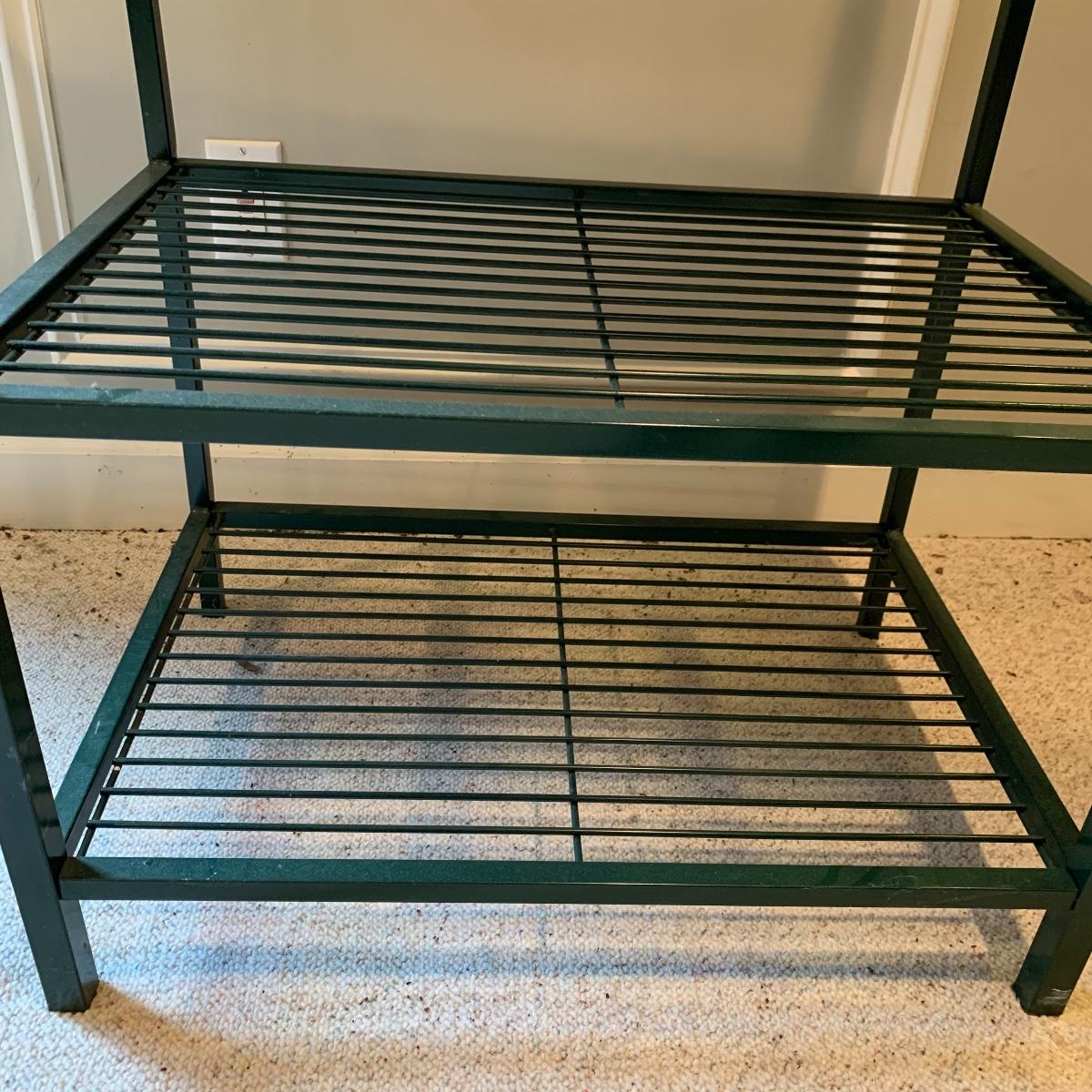This bakers rack is in great condition. It is a lovely forest green metal rack with a main wooden shelf, two lower metal shelves, and a smaller upper metal shelf. It has a lovely lattice design on the back and swirled accents on the top and sides. It measures 18”x27”x64.5”. The height of the wooden shelf is 29.5”. It is fairly small and lightweight so should be easy to move, but if disassembly is required an Allen wrench and Phillips head screwdriver will be needed. Local pickup only.