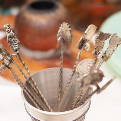 Lot 110 Hand made wooden dutch shoe wine holder, vintage grinder: Fire King Jadeite small plates, 2 sets of picks that have little metal holders. Irish mug, candle holders, glass and wood. Metal Coasters, Fork that has been modified. IDL Jr. Moistener, Metal flower bowl,