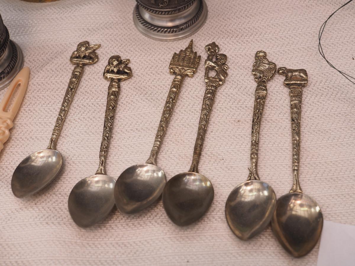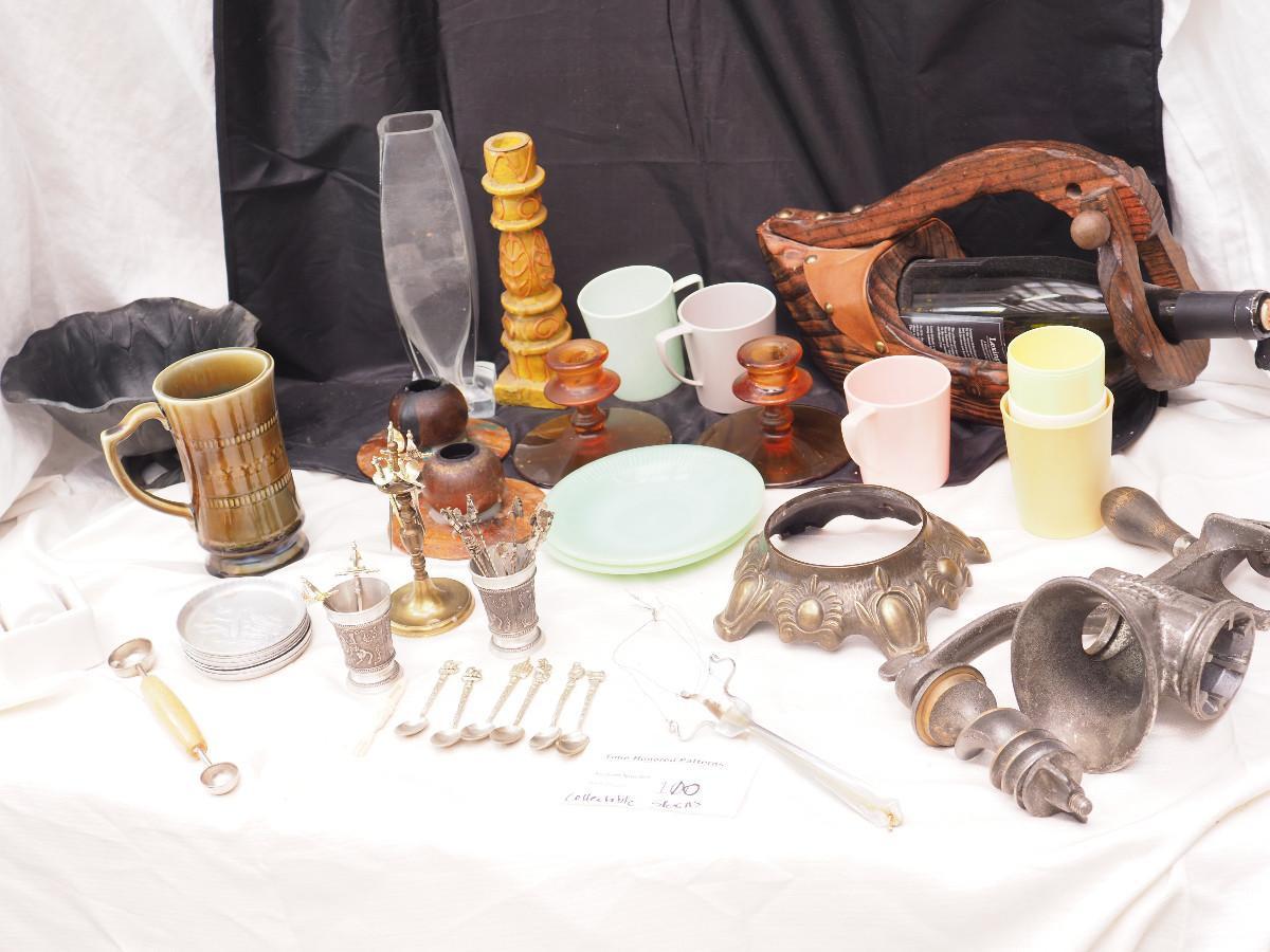 Lot 110 Hand made wooden dutch shoe wine holder, vintage grinder: Fire King Jadeite small plates, 2 sets of picks that have little metal holders. Irish mug, candle holders, glass and wood. Metal Coasters, Fork that has been modified. IDL Jr. Moistener, Metal flower bowl,