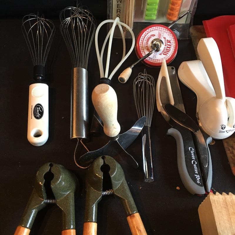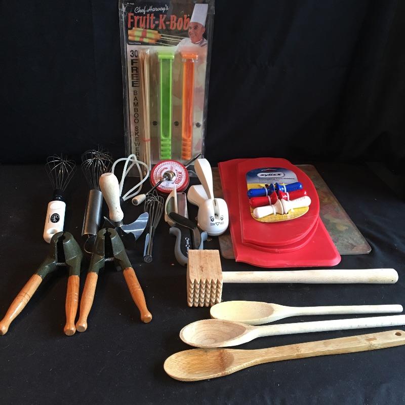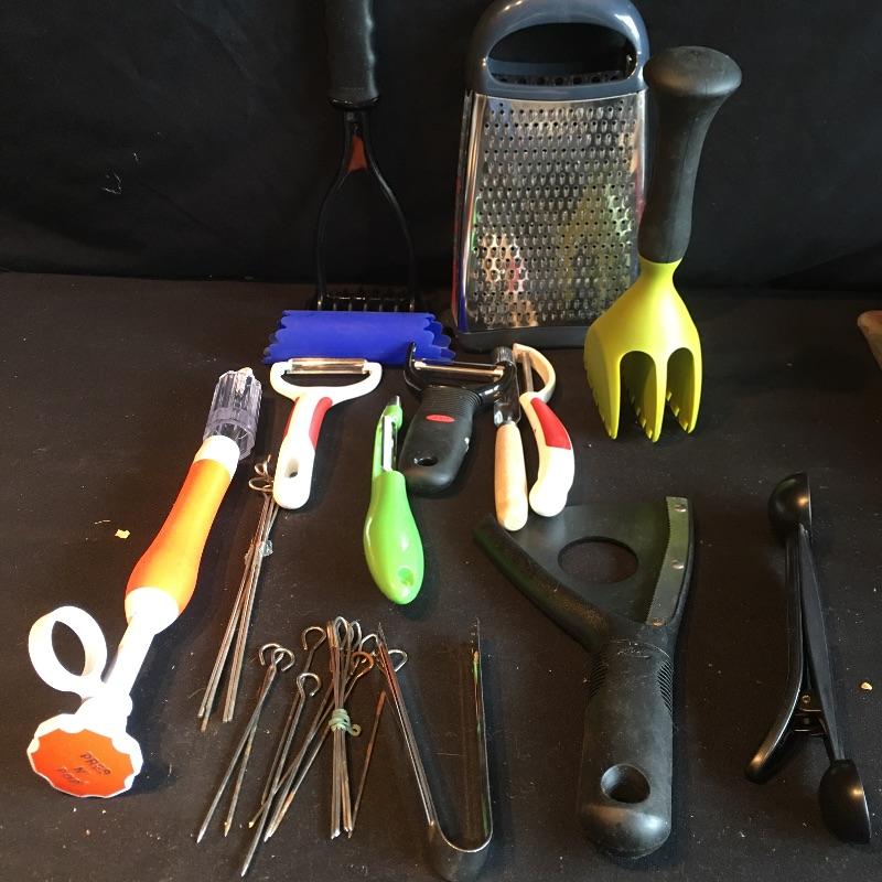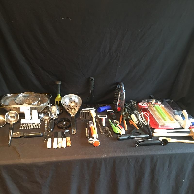 Oodles of kitchen utensils includes grater, peelers, whiskers, metal corn holders, strainers, can opener, spatula, ladle, prep n pop, wooden spoons, tenderizing hammer, folding cutting boards and more.