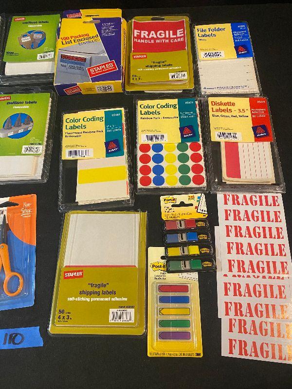 "Fragile" shipping, Post-Its, dot labels, Fiskars non-stick scissors, mini pads and more.