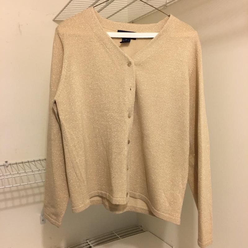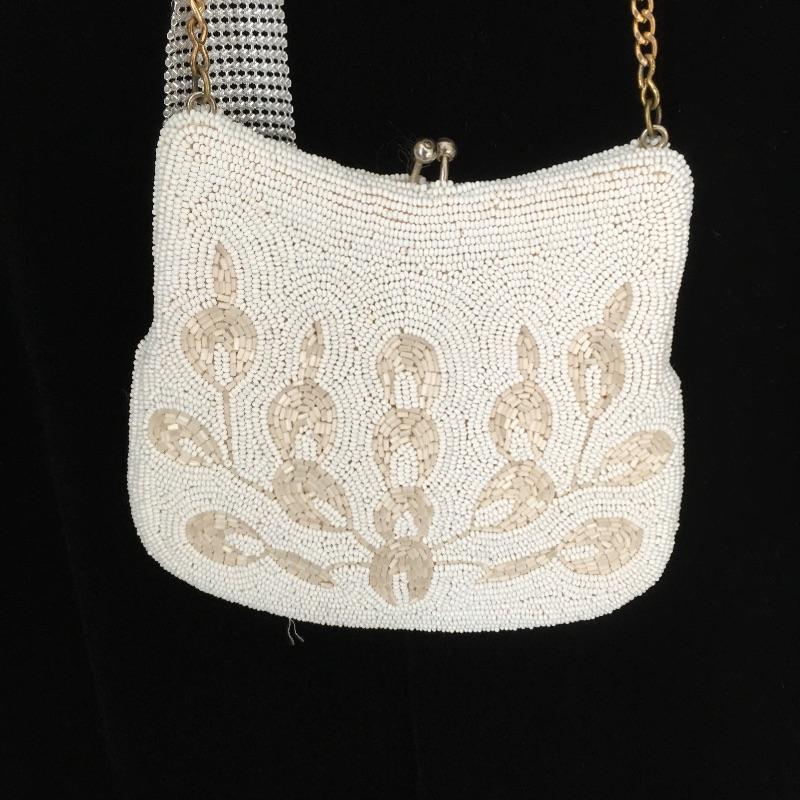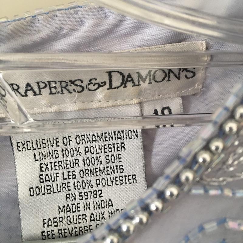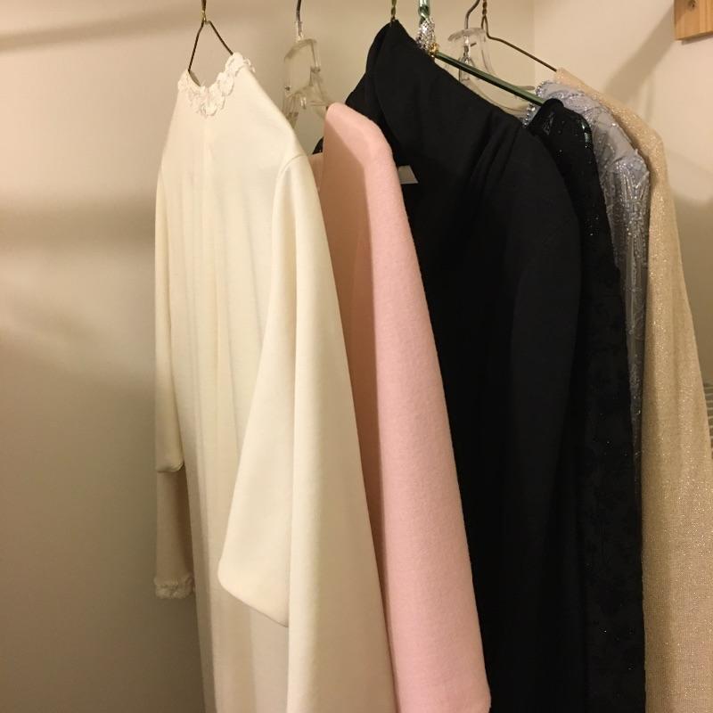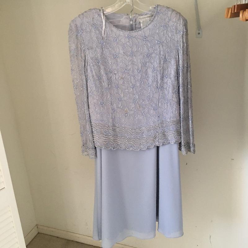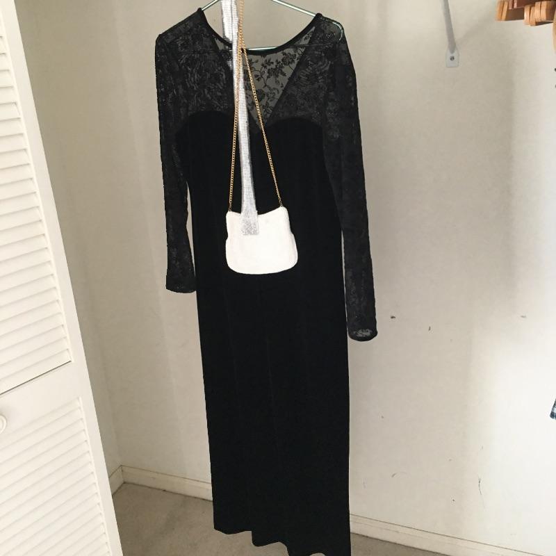 Ladies formal wear includes light purple beaded top with skirt by Drapers and Damon’s size 10, gold sparkle sweater size M by Charter Club, London black velvet dress by Robbie Bee sz 12, gorgeous beaded purse and three dresses without labels. (White and pink appear to be handmade vintage). Shipping available