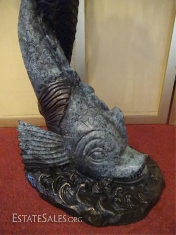 LOT 110: LARGE BRONZE SCULPTURE, MERMAID WITH FISH AND SHELLS, PLUMBED FOR OPTIONAL USE AS FOUNTAIN WITH WATER FLOWING FROM SHELLS, NEW, NEVER USED, IN EXCELLENT CONDITION, 55"H X 20"W X 14"D, SKU006.01 H889