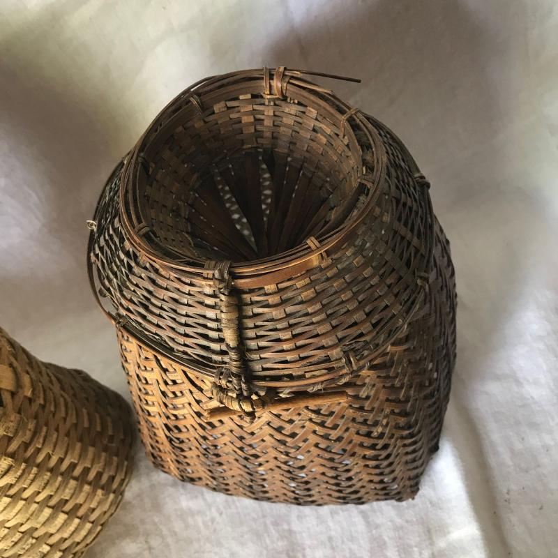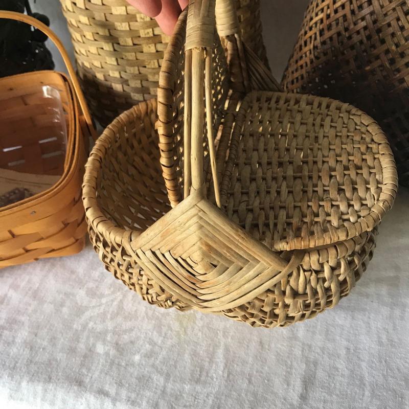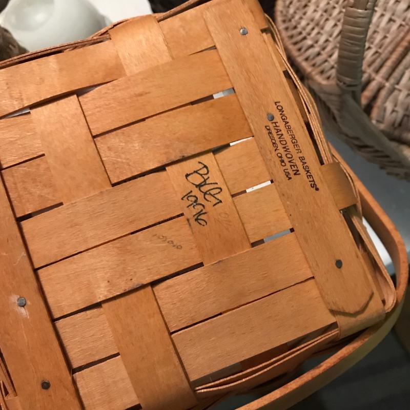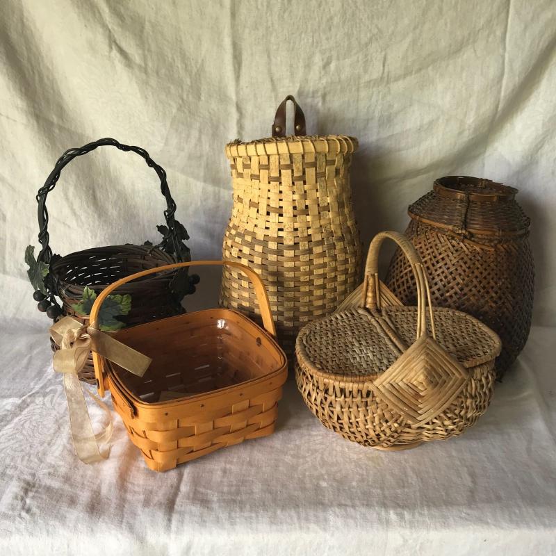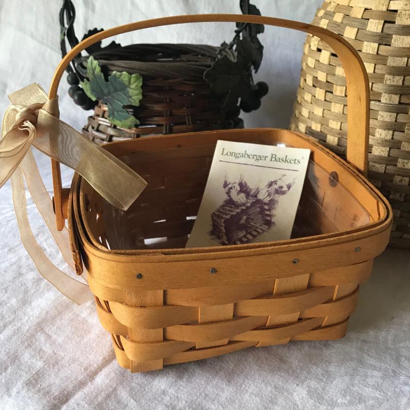 Small Longaberger basket with handle and brochure measures 7”sq by 4”h. . Lot includes 5 baskets in all of various sizes and styles. Tallest is approx. 12”. No shipping