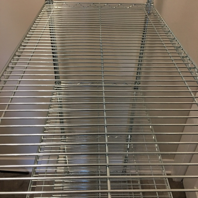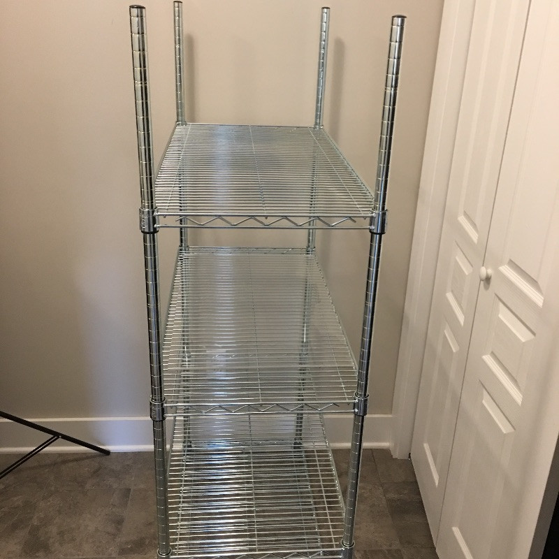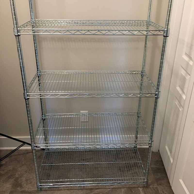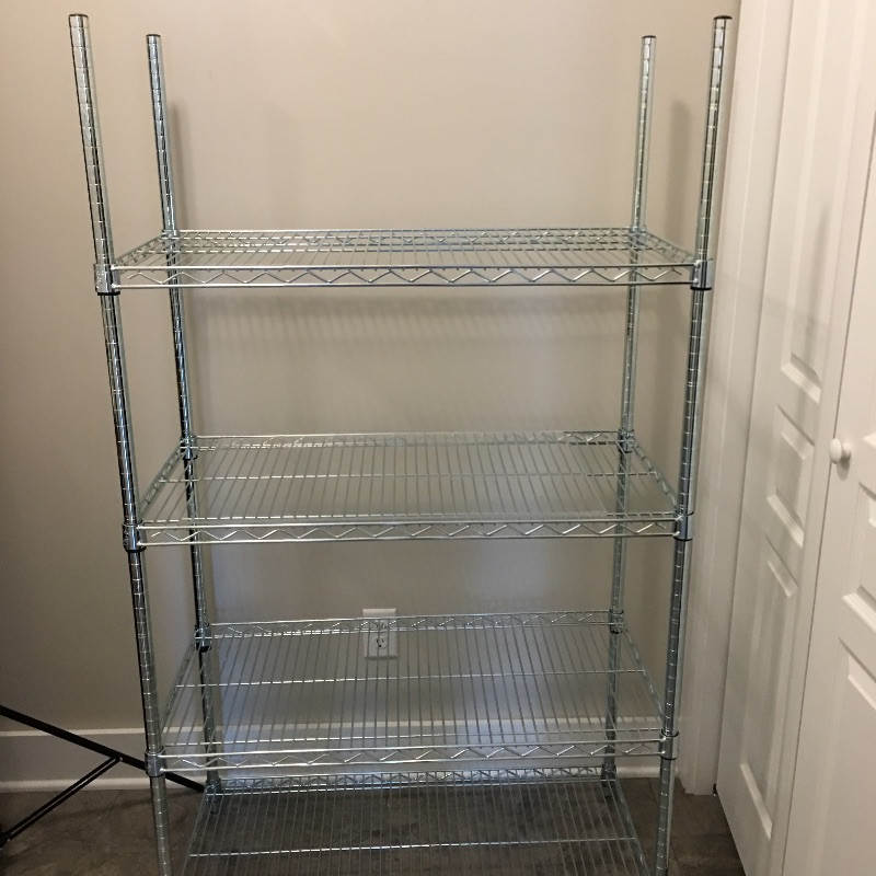 Metal shelf with four shelf’s. Great looking shelf for your storage needs, Shelf measures 18” x 35” x 64”.