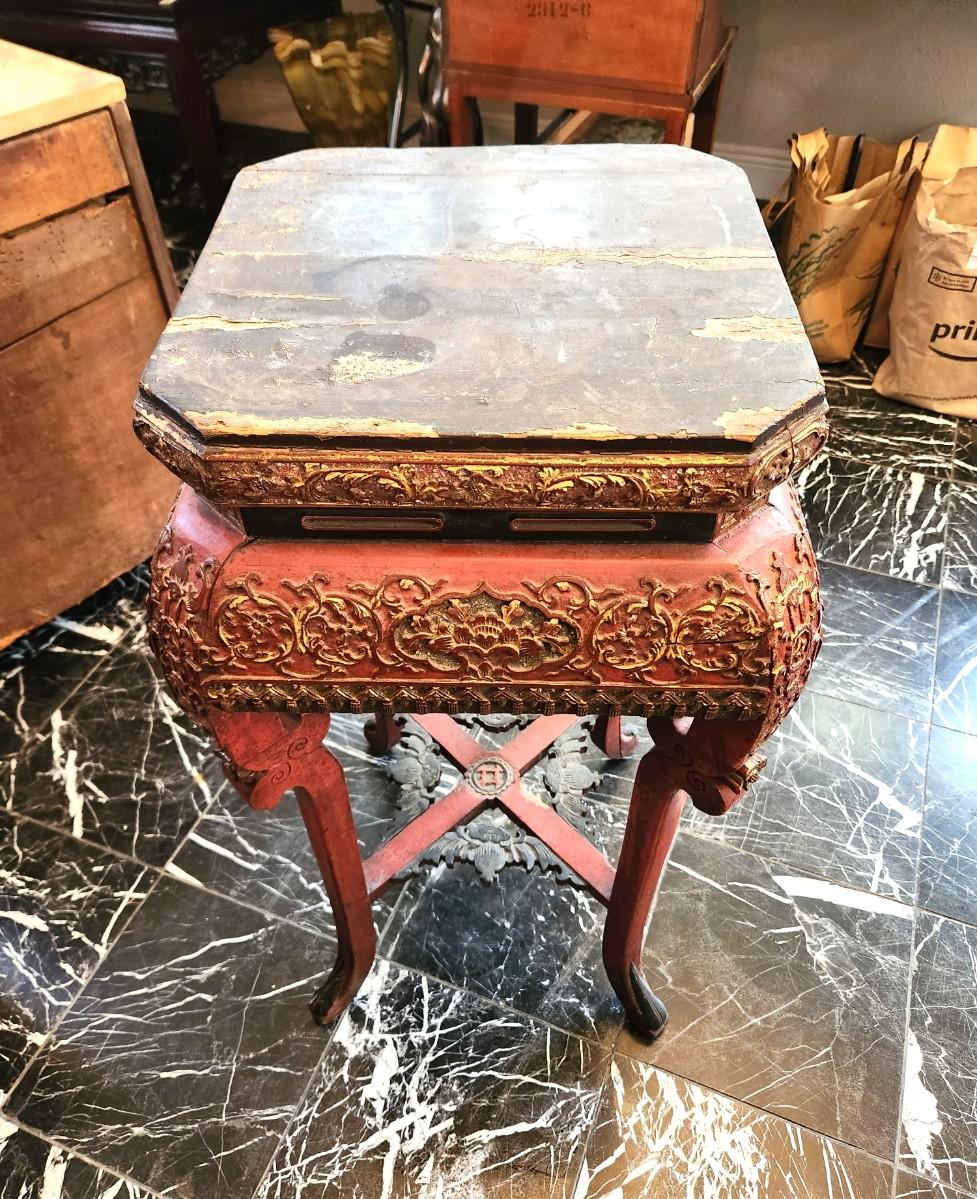 Old Chinese Red Lacquer side table/plant stand - one leg has a split but does not affect integrity of the piece. 32.5" tall, top 14" across. Antique condition, gold gilded accents.