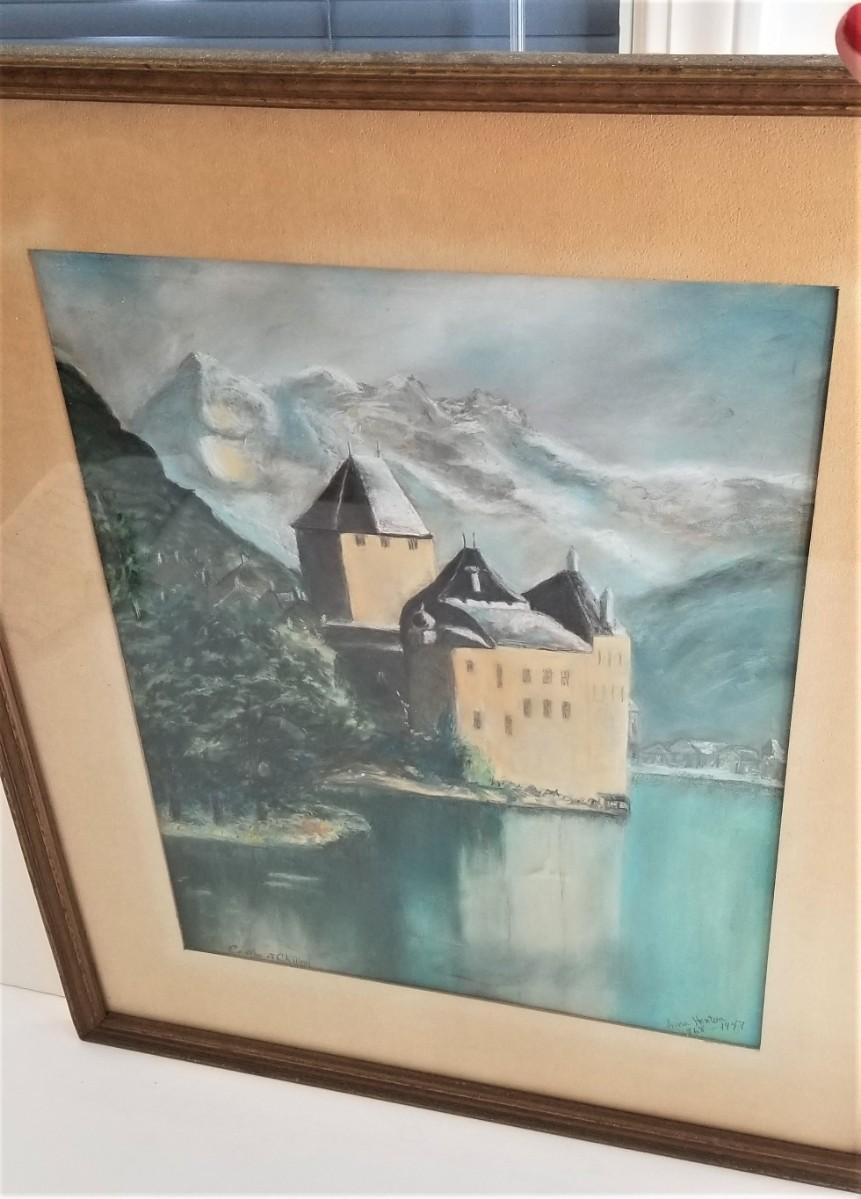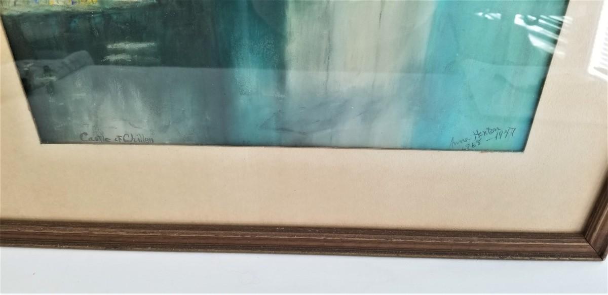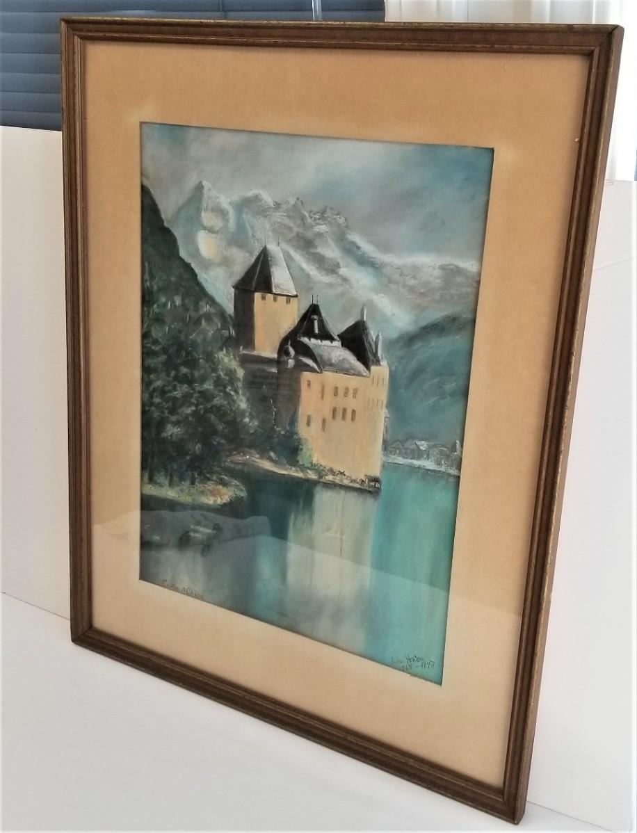 Well executed original pastel - framed - The Castle of Chillon - signed Anna (Rees) Henton, 1868-1947. Anna actually died in Billings, Montana on July 4, 1959 when she was in her 90's. Apparently a self-taught artist, this lady was very prolific and worked in oil and pastels. 19.75" across, 24" tall. Good condition.