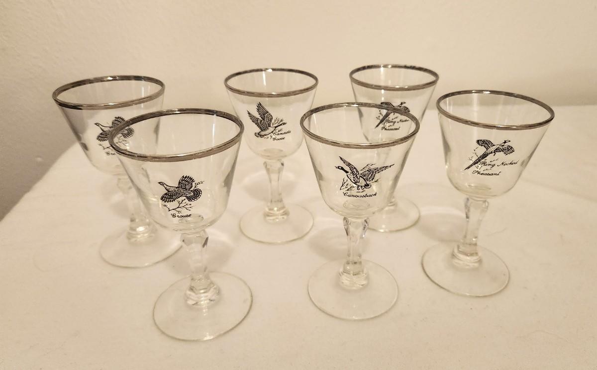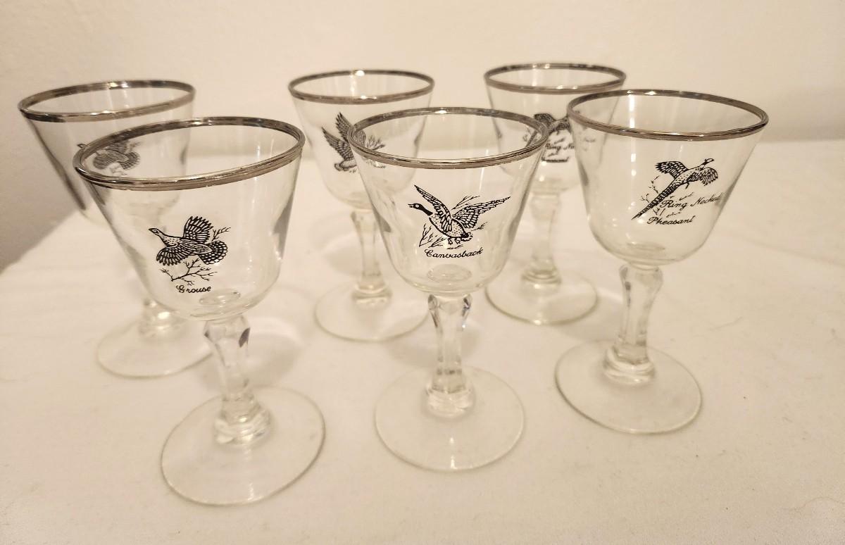 Mid Century Modern Tiffin Glass Bird series - you get 2 Ring Neck Pheasant, 2 Grouse, 1 Canvasback, and 1 Canada Goose. Each 3 oz. glasses. Silver rims. Each about 5.25" tall. Good vintage condition.