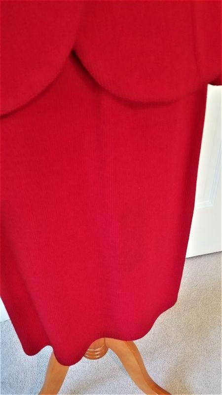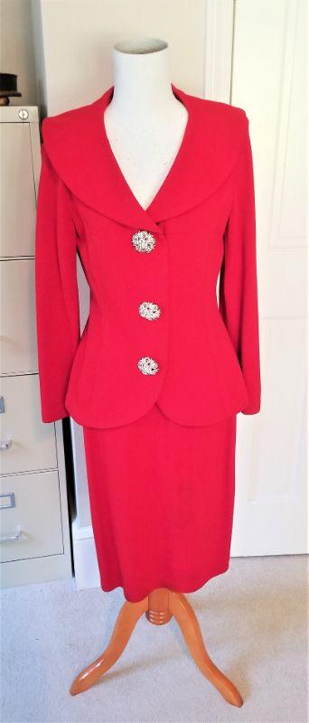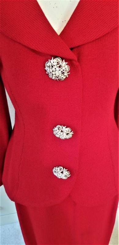 Perfect for that holiday party - gorgeous St. John's Knit suit with rhinestone buttons - size 4. Deep red color. I can't find any pulls, etc. HOWEVER - if you look very closely at the front of the skirt near the bottom there appears to be some sort of light discoloration. I don't know if this is a grease/food stain that the cleaner's didn't get completely out or what - you have to look sooo closely to see it so check out ALL the photos. You be the judge. No buyer's remorse on this one! You could also wear the jacket and pair it with a black skirt - just sayin' This suit new cost over $1,000.