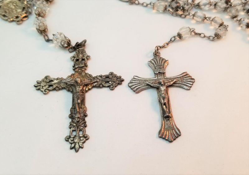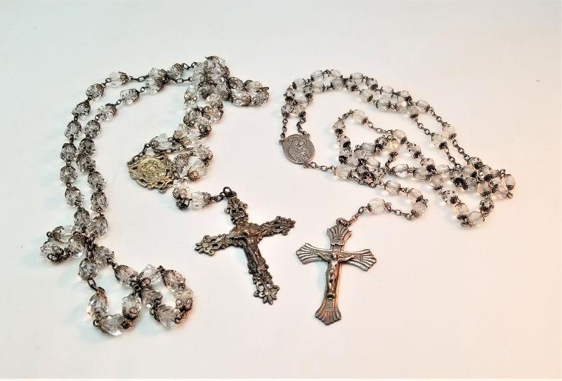 Late addition! Two very nice vintage sterling silver and crystal rosaries. The longer one is single capped with sterling silver over an aurora borealis bead - ornate crucifix. Measures about 25" long. The other is a bit simpler - beads are not capped but all the fittings are sterling silver. Crucifix has monogram "DB." Very nice center piece with the Sacred Heart on one side and Our Lady of Perpetual Help on the other. Measures about 22" long.