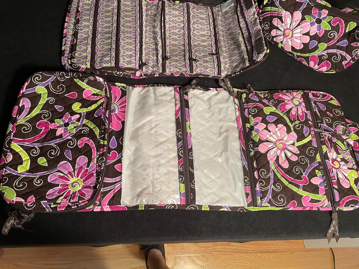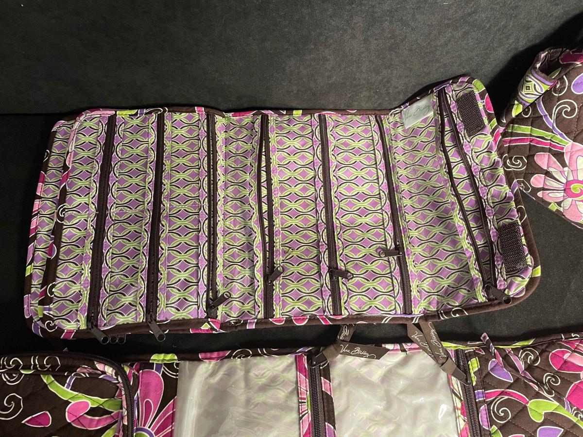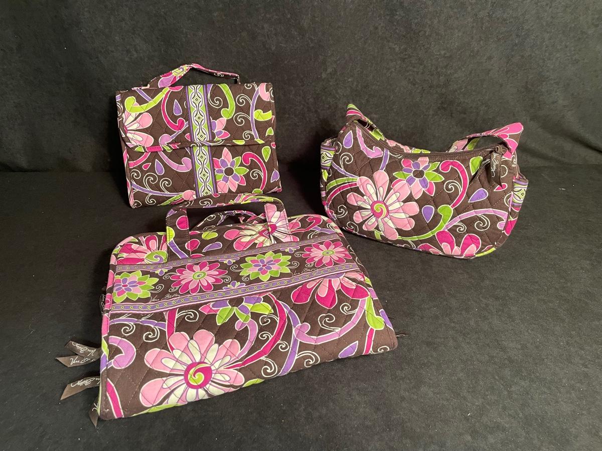 Purple punch pattern set of 3 travel bags--foldup jewelry case, toiletry organizing case and small handbag