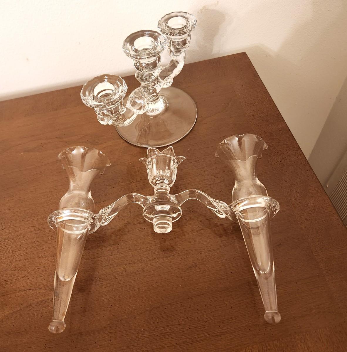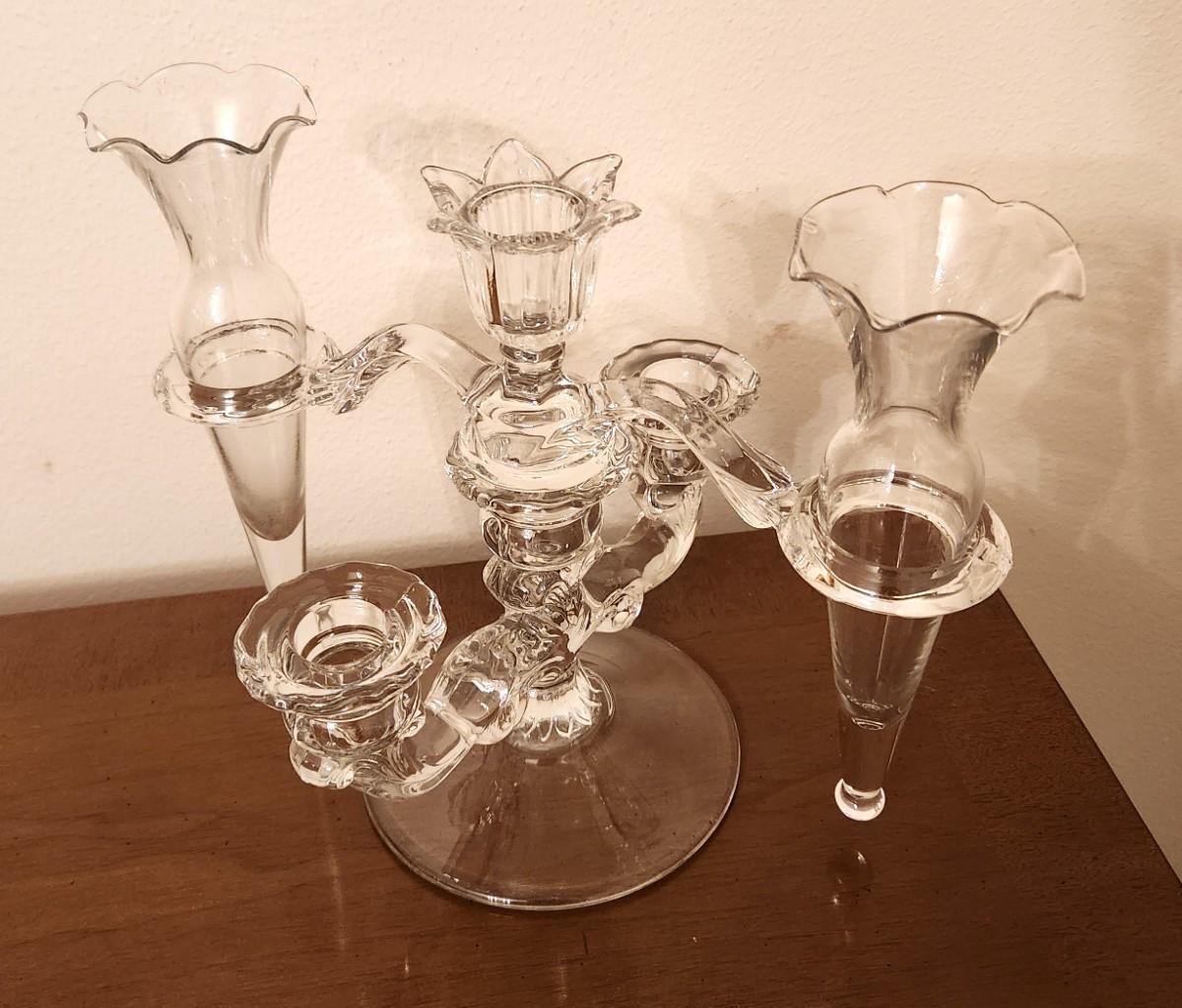 This piece is a real beauty - vintage Cambridge glass rotating crystal epergne/candlestick in the "Caprice" pattern. Great condition - 9.5" tall, 10.5" wide. Features 3 candlesticks and 2 vases.