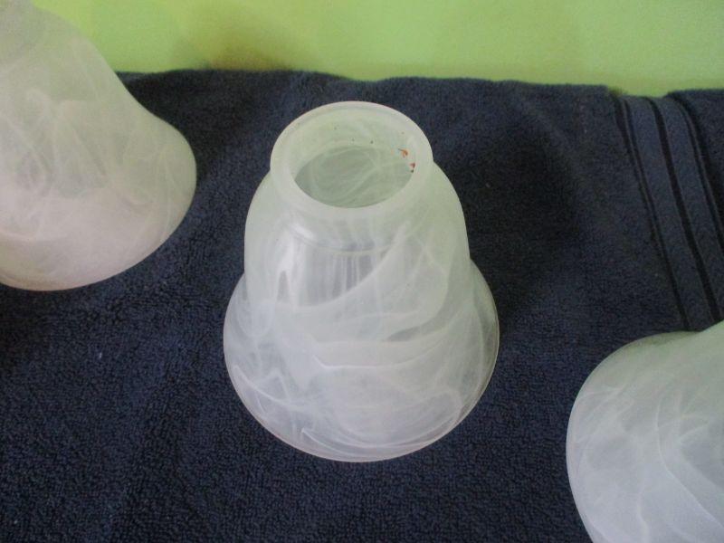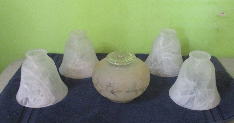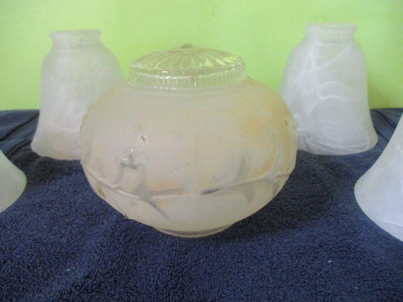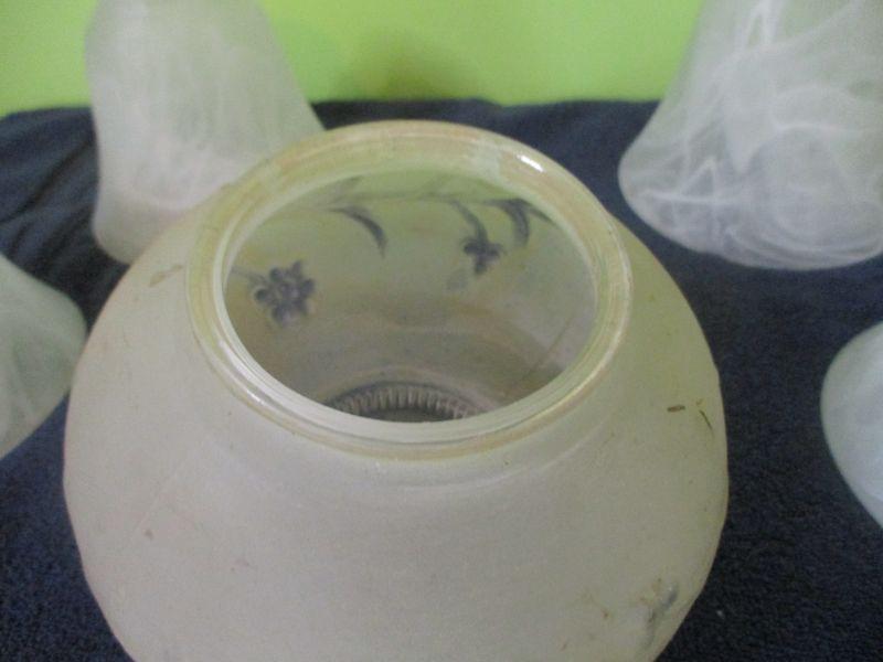 The light cover is in excellent condition (just needs to be cleaned) and has beautiful details. It is for a ceiling light. The other four are in never used, excellent condition and I believe were to have been used with a ceiling lamp, but they weren't. The vintage cover has an opening diameter of 2.75" inside the rim and 3.25" outside the rim. The others are standard/modern size.