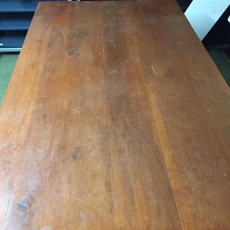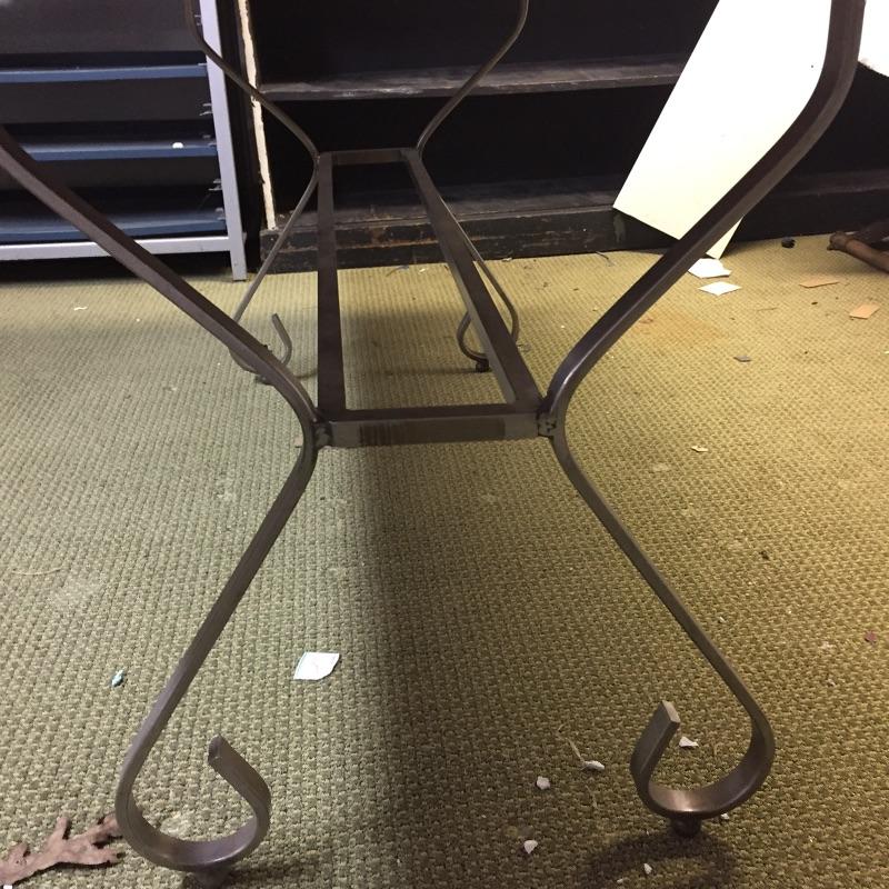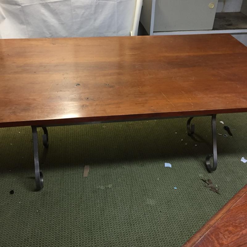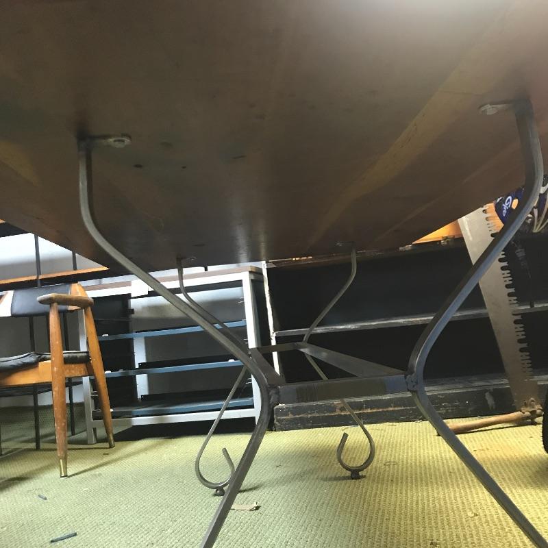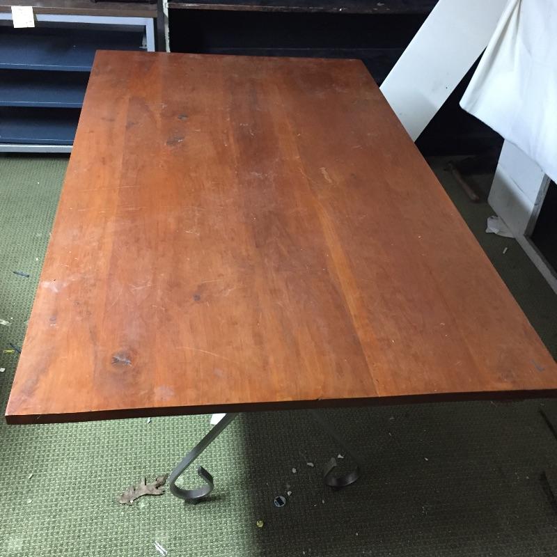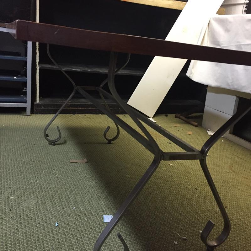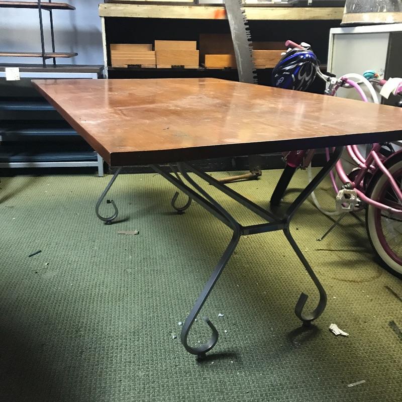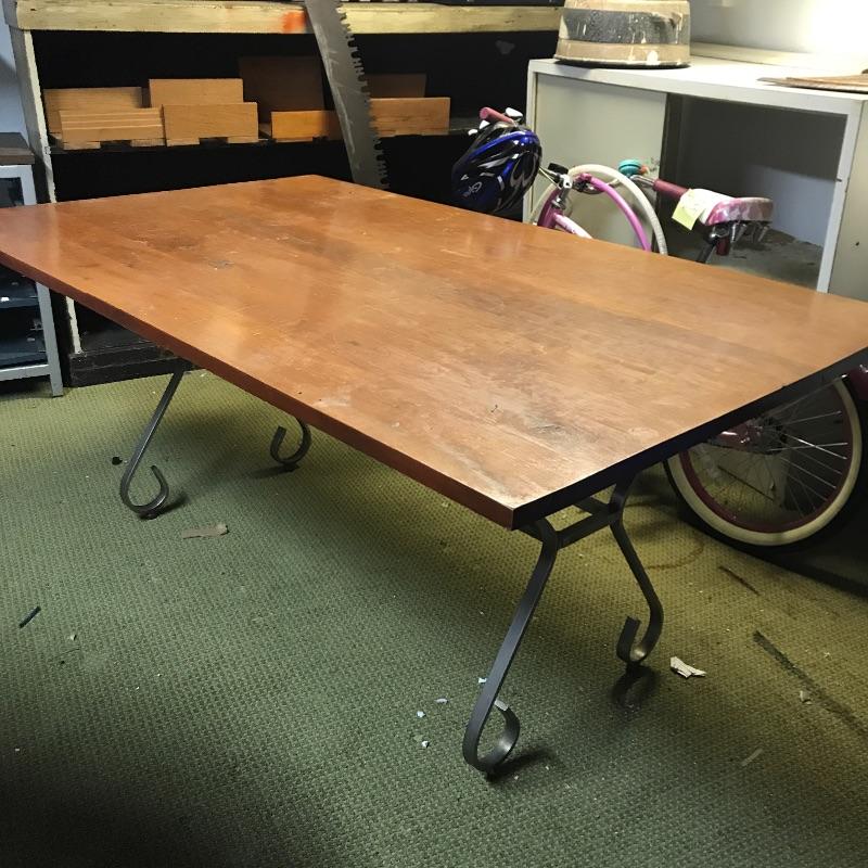 Wood and Iron dining table. Splendid table will look great in your dining room or maybe in your office. Table has lovely patina , keep it as is or make it look like new with a little elbow grease. Iron is sturdy with a nice design. Table measures 37.75” x 64” x 27.75” tabletop measures 1” thick.