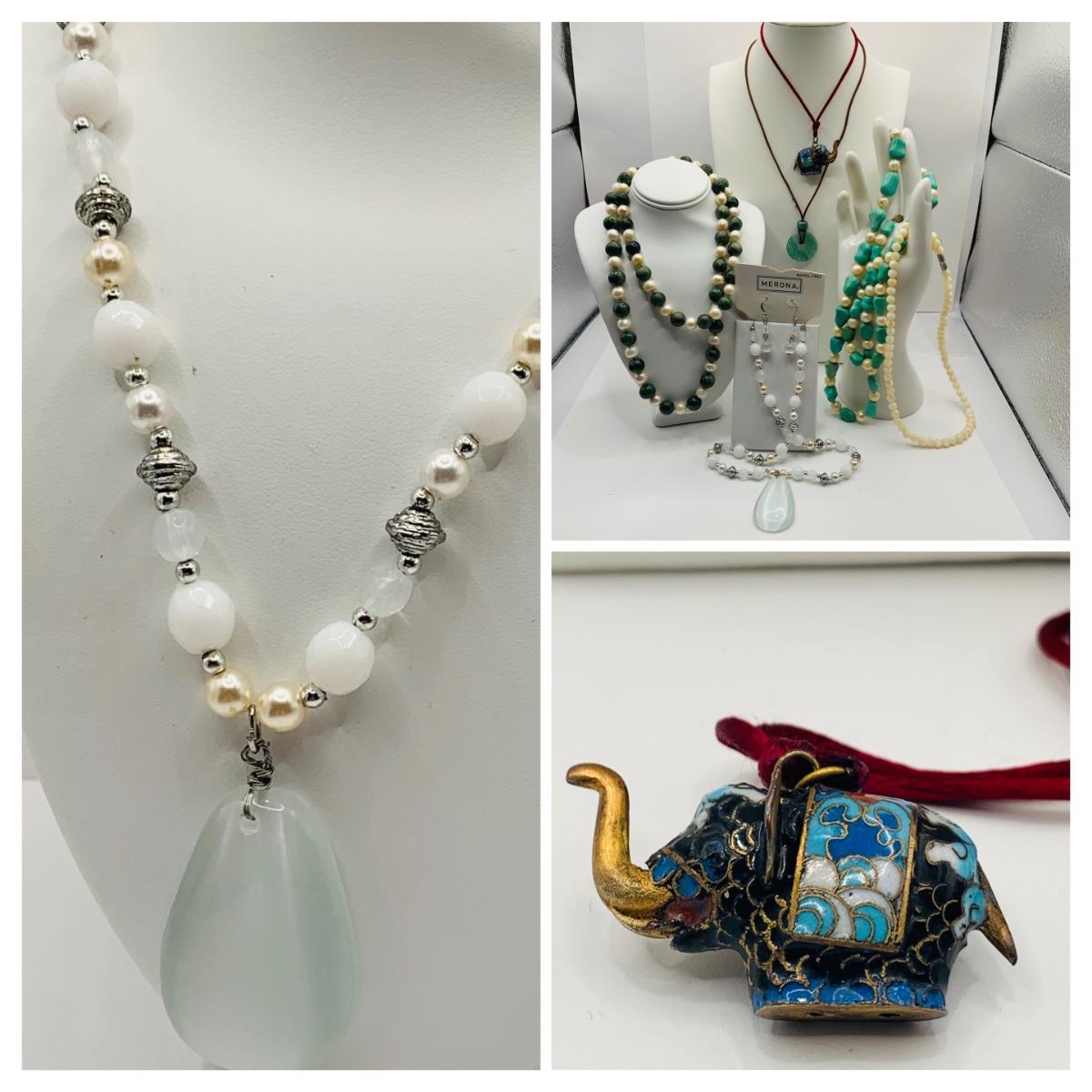 LOT 27: Collection of Beaded Fashion Jewelry Necklaces Featuring a Cloissonne Elephant Pendant on a Silk Cord and More