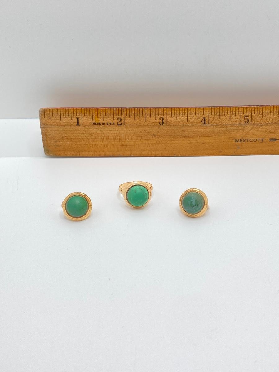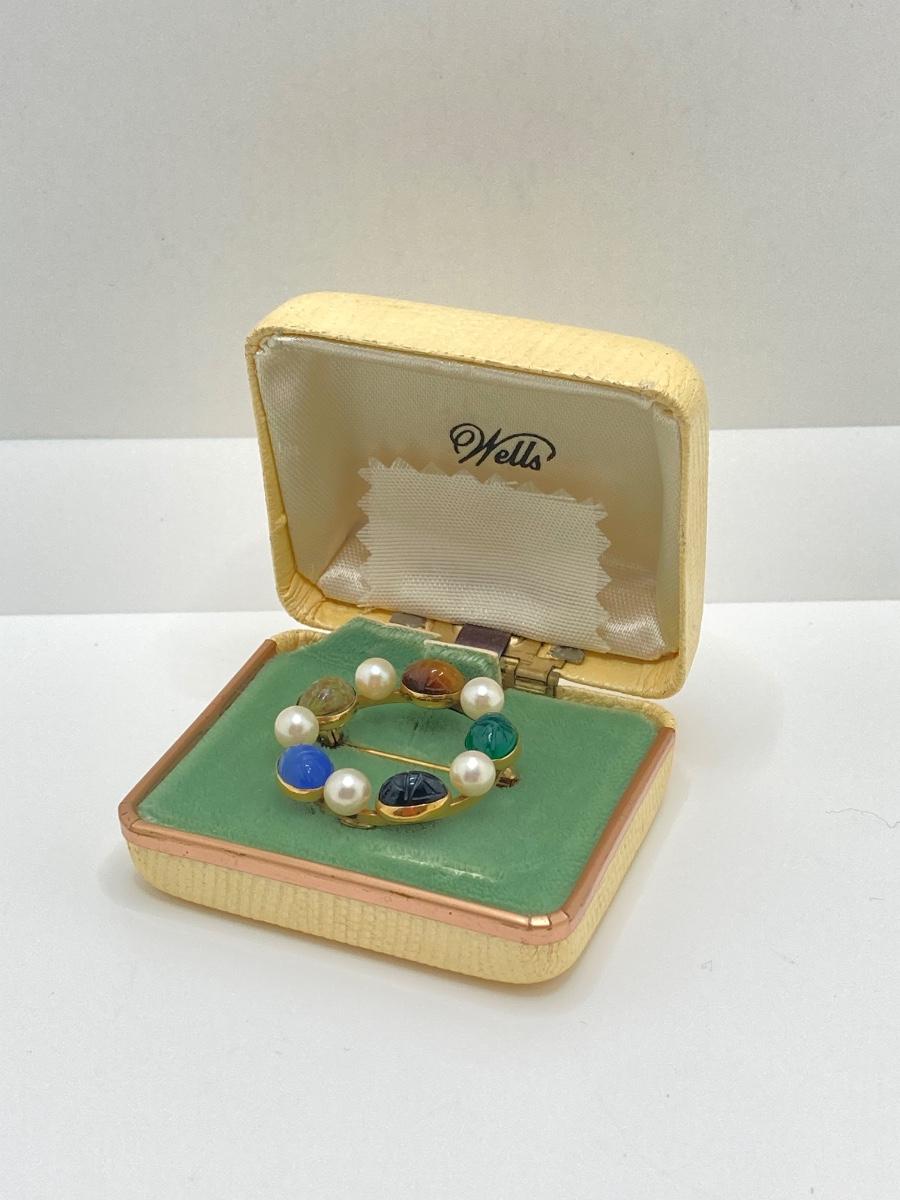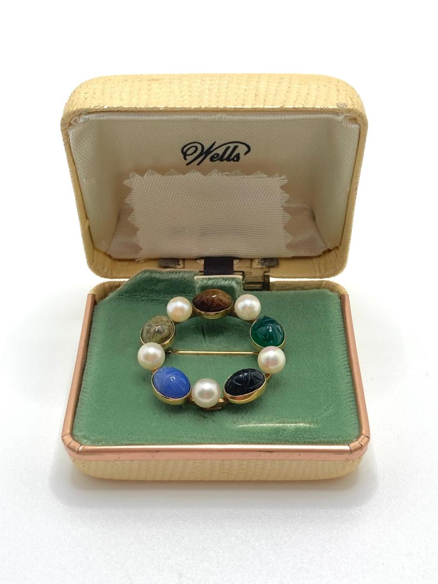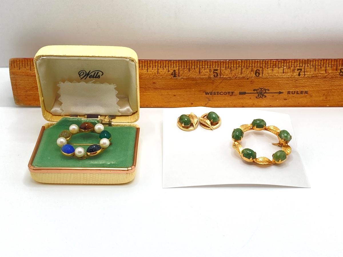 LOT 74J: Vintage Jewelry Collection - Wells 14K G.F. Scarab Stone Brooch, Earrings and Ring