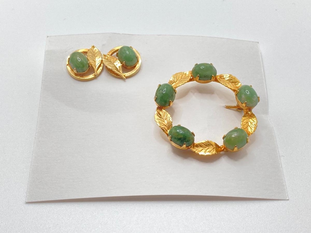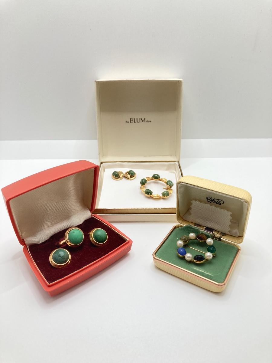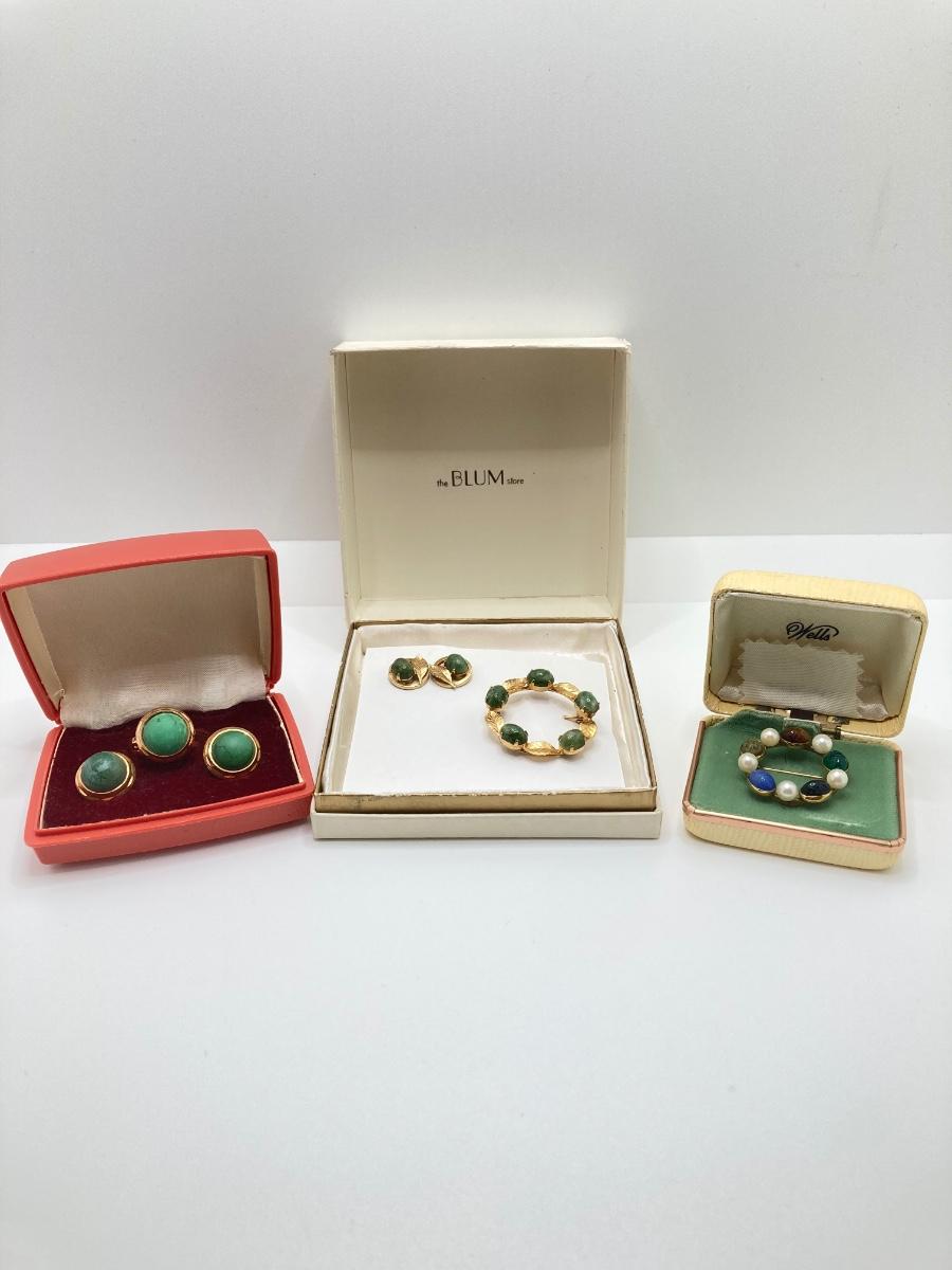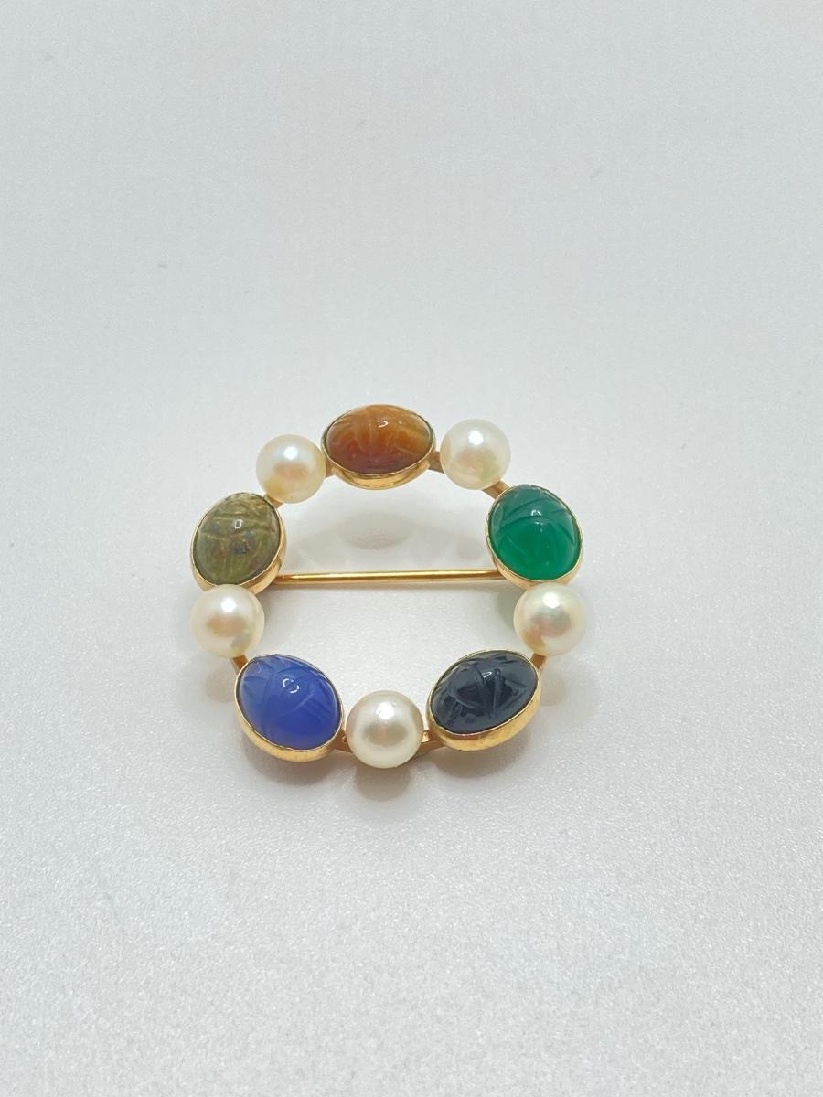 LOT 74J: Vintage Jewelry Collection - Wells 14K G.F. Scarab Stone Brooch, Earrings and Ring