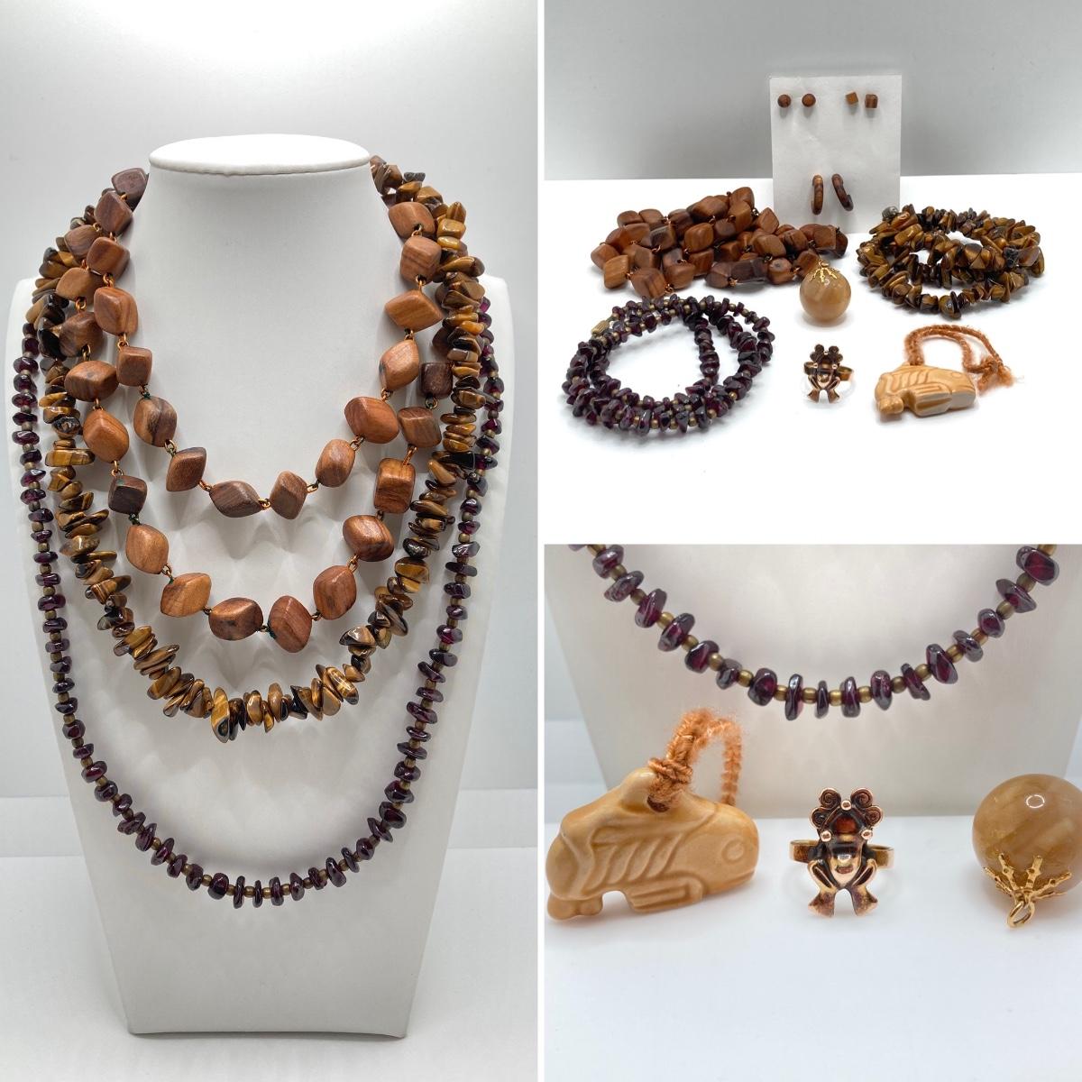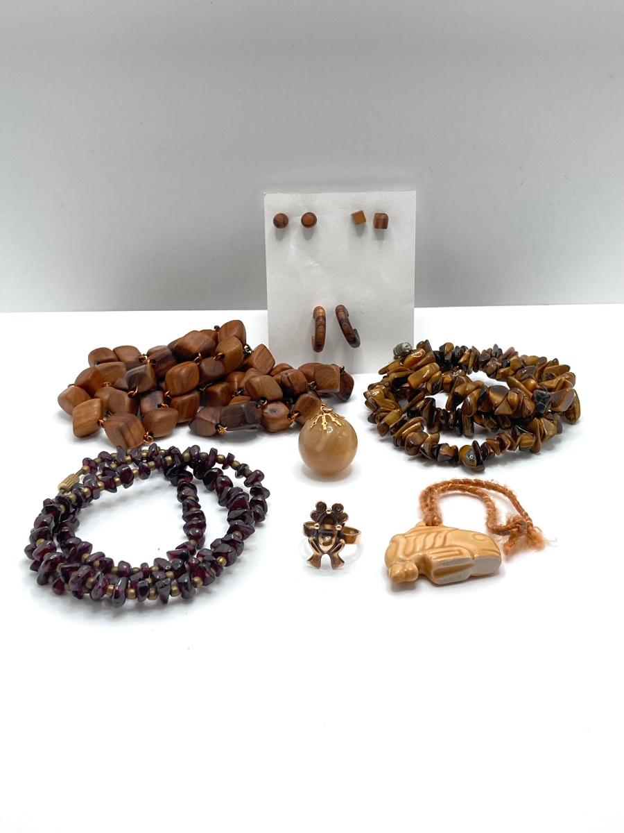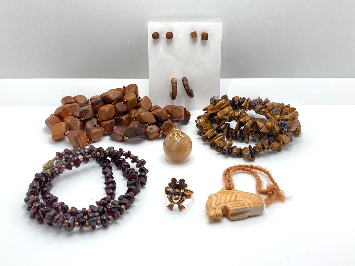 LOT 77J: Vintage Fashion Jewelry Collection - Wood Beaded Necklaces / Earrings, Frog Ring and Stone Pendants