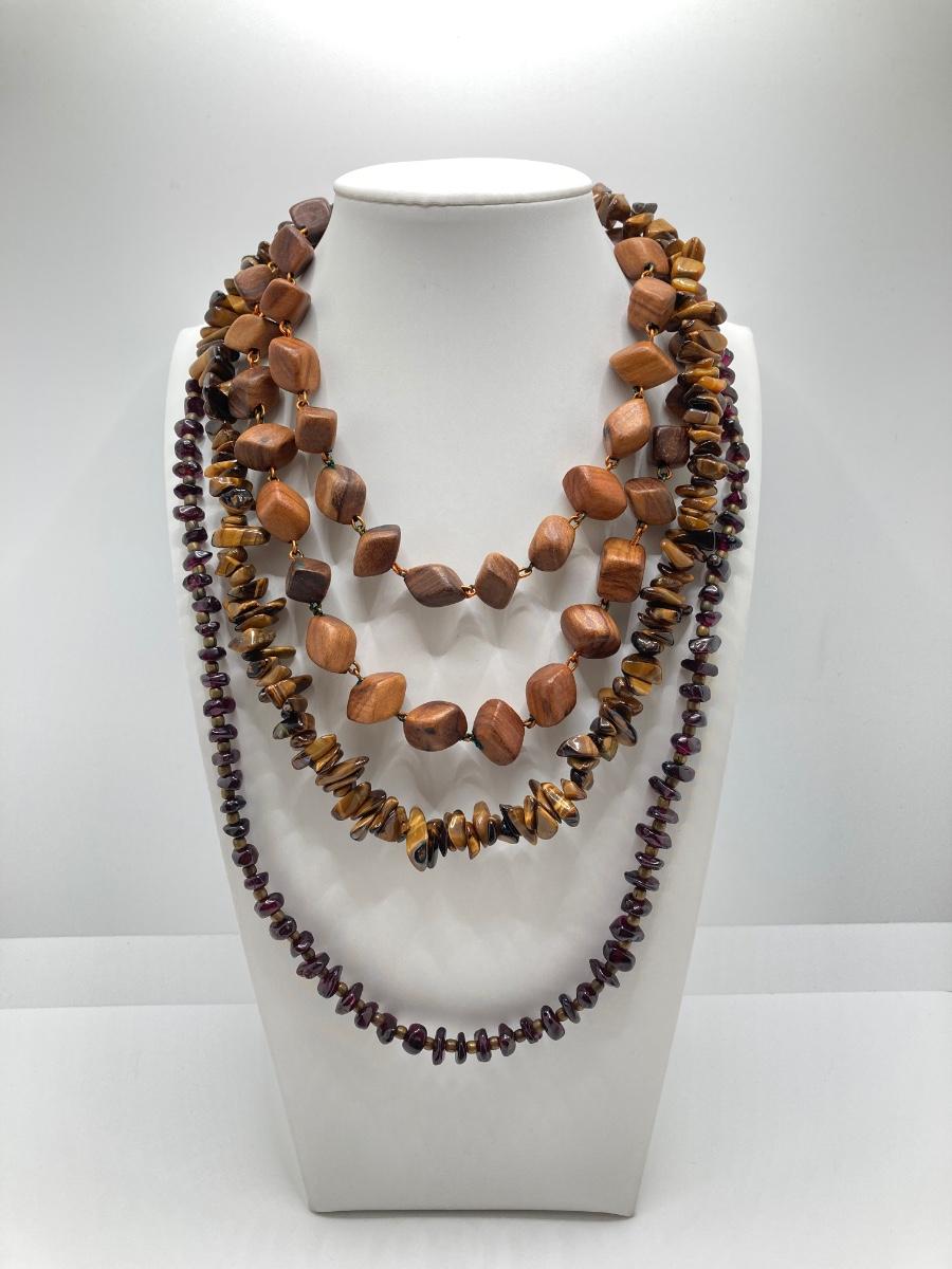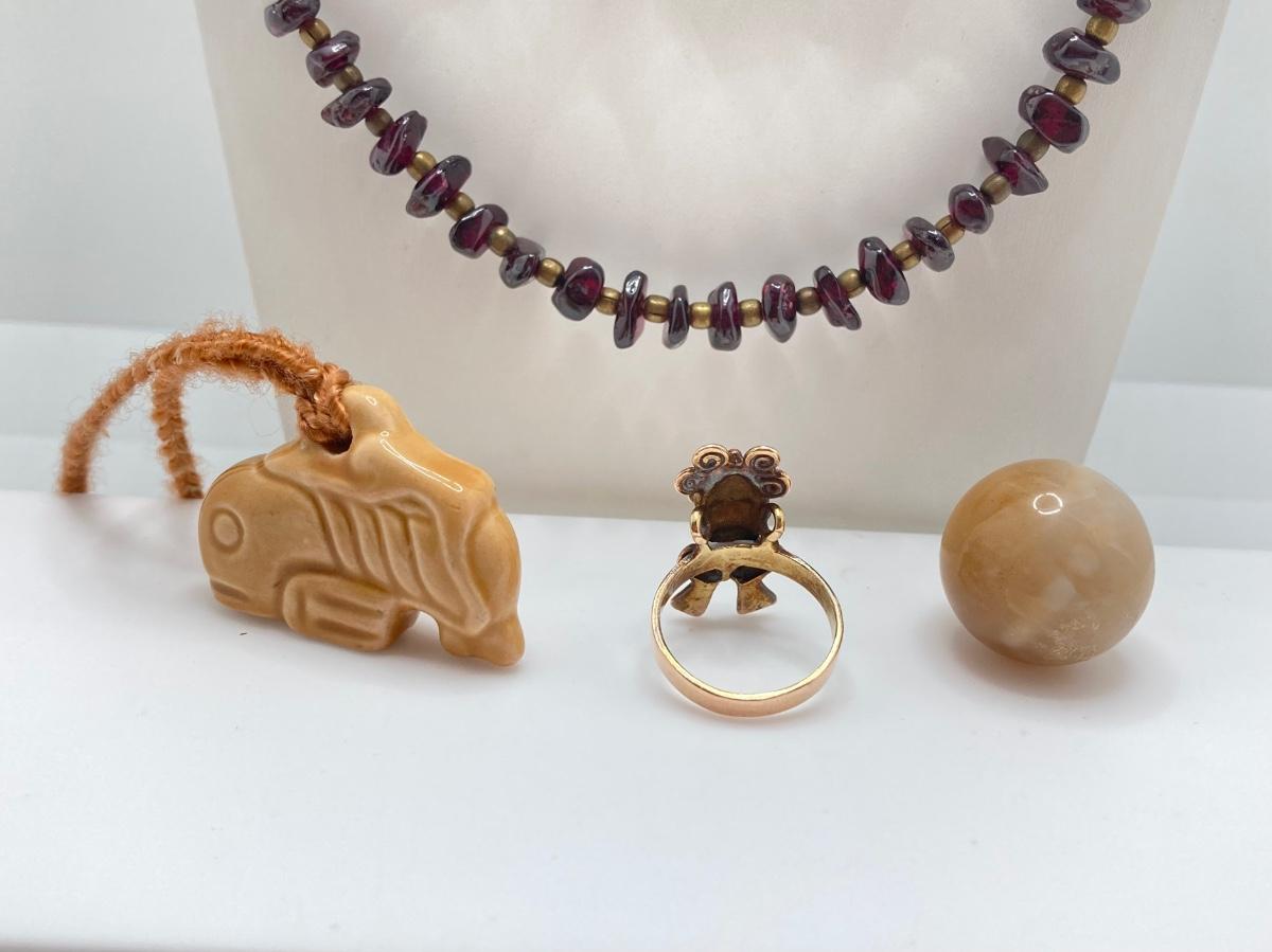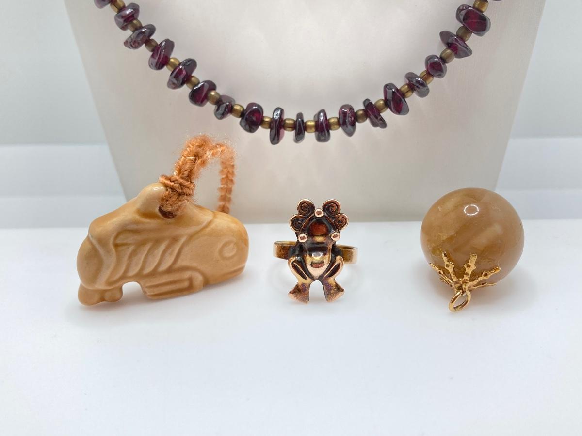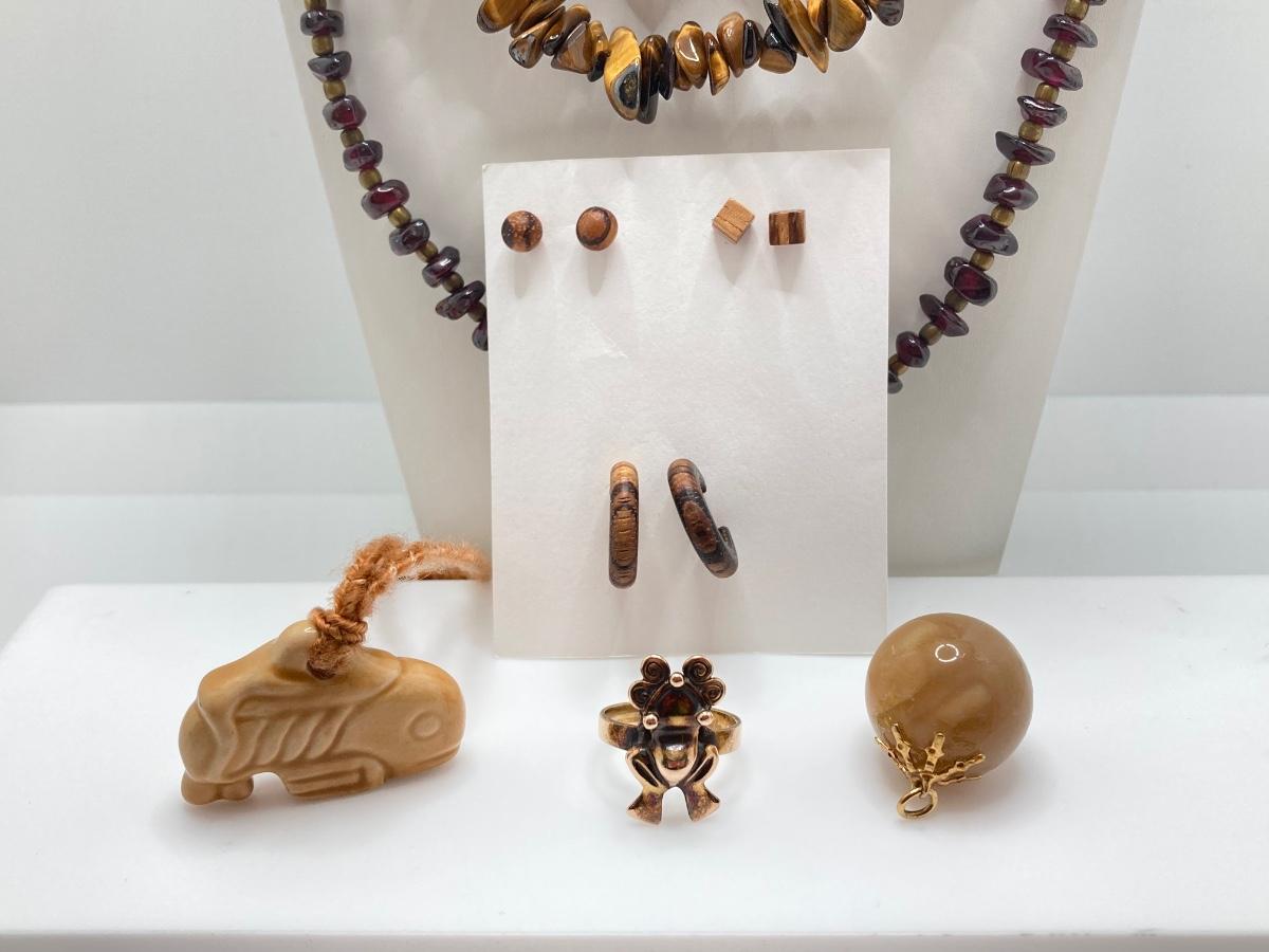 LOT 77J: Vintage Fashion Jewelry Collection - Wood Beaded Necklaces / Earrings, Frog Ring and Stone Pendants