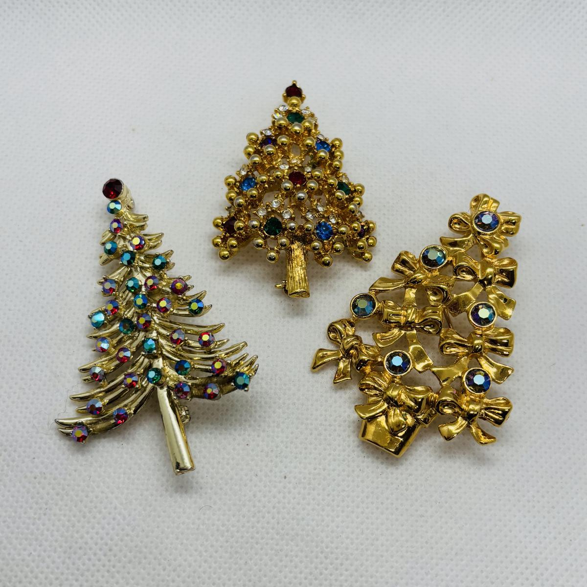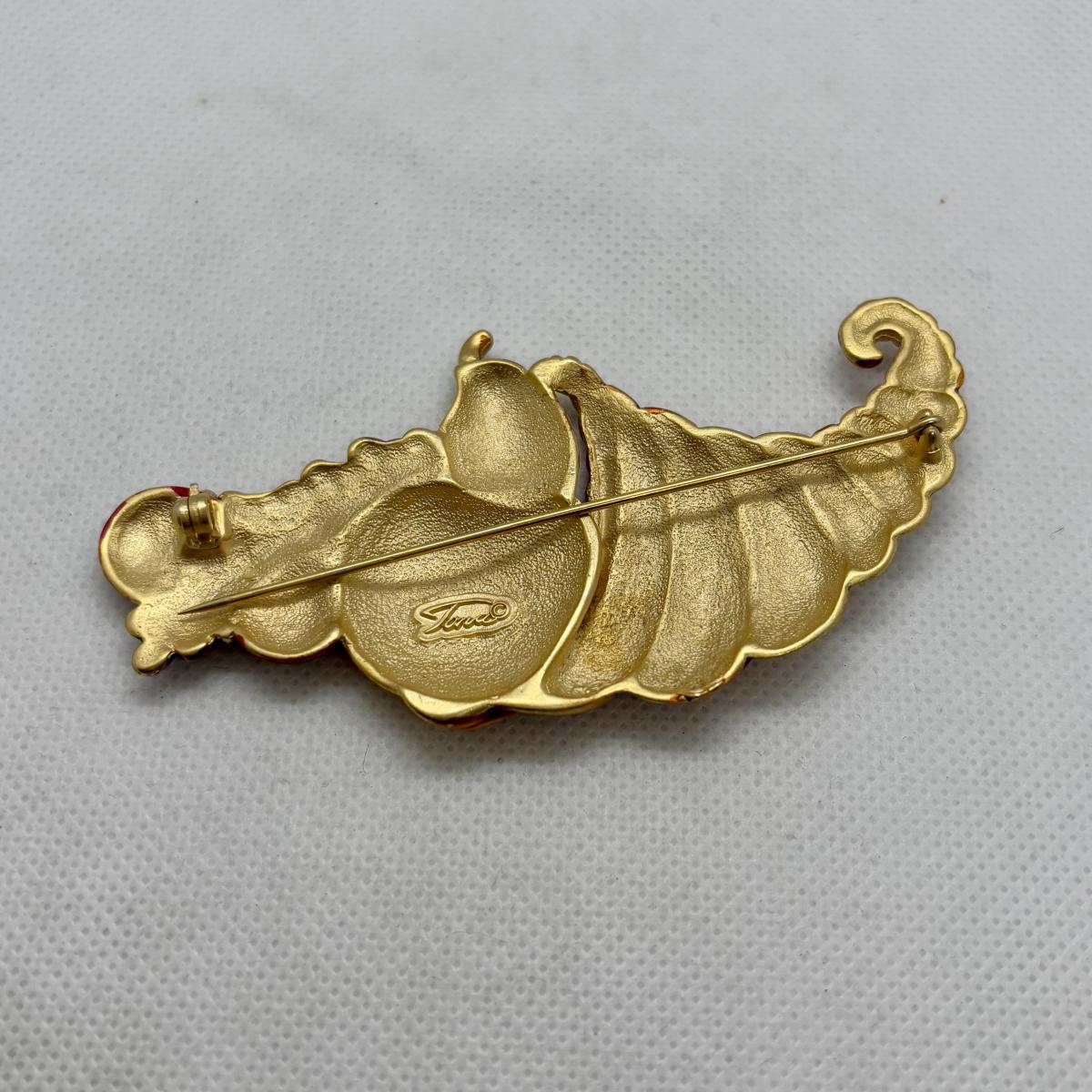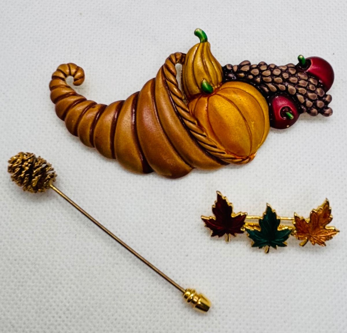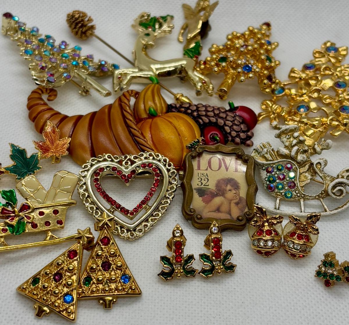 LOT 90: Collection of Holiday Brooches including a Tona Gold Tone Enamel Cornucopia Pumpkin Brooch, Eisenberg Christmas Tree Brooch w/Multicolor Rhinestones