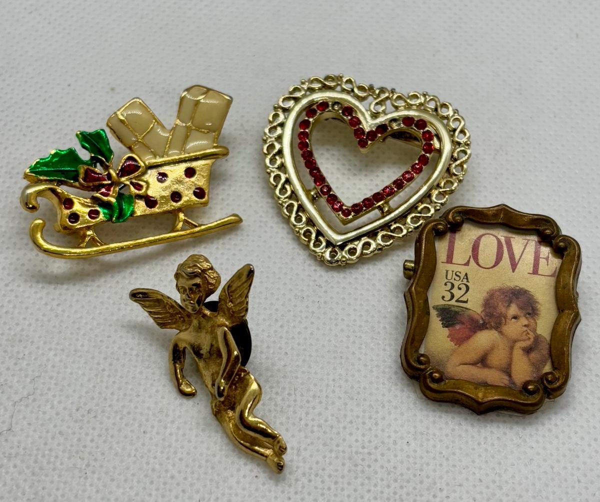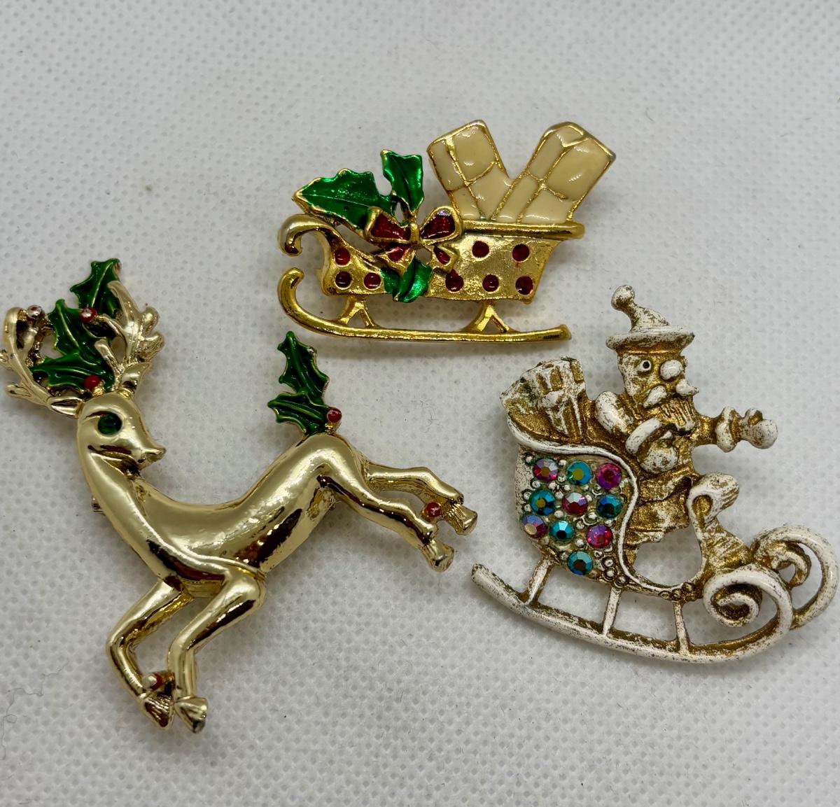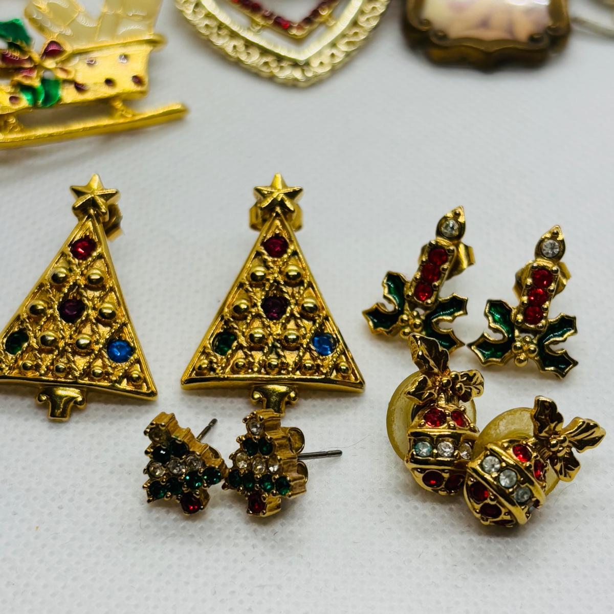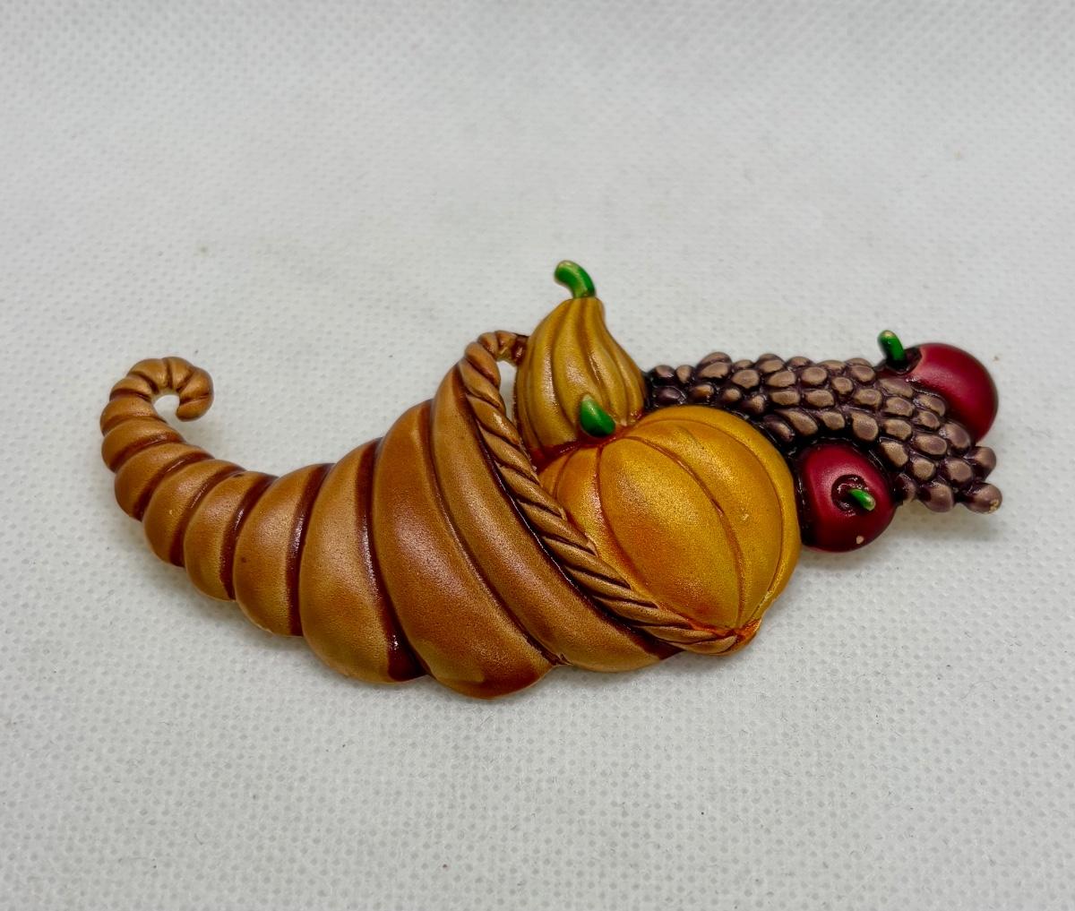 LOT 90: Collection of Holiday Brooches including a Tona Gold Tone Enamel Cornucopia Pumpkin Brooch, Eisenberg Christmas Tree Brooch w/Multicolor Rhinestones