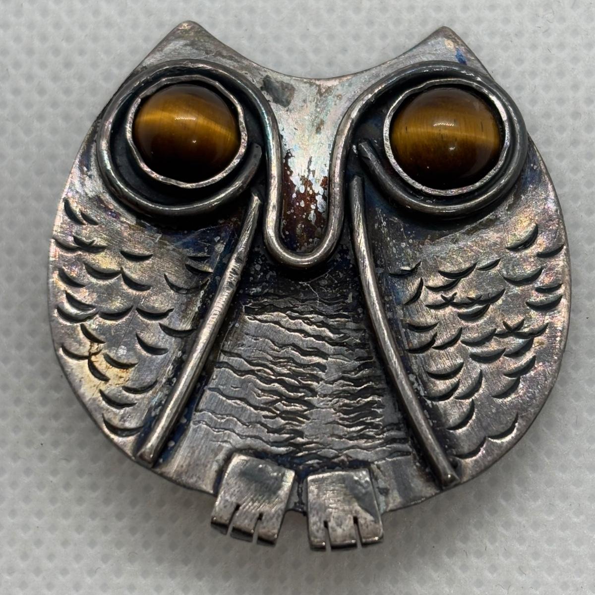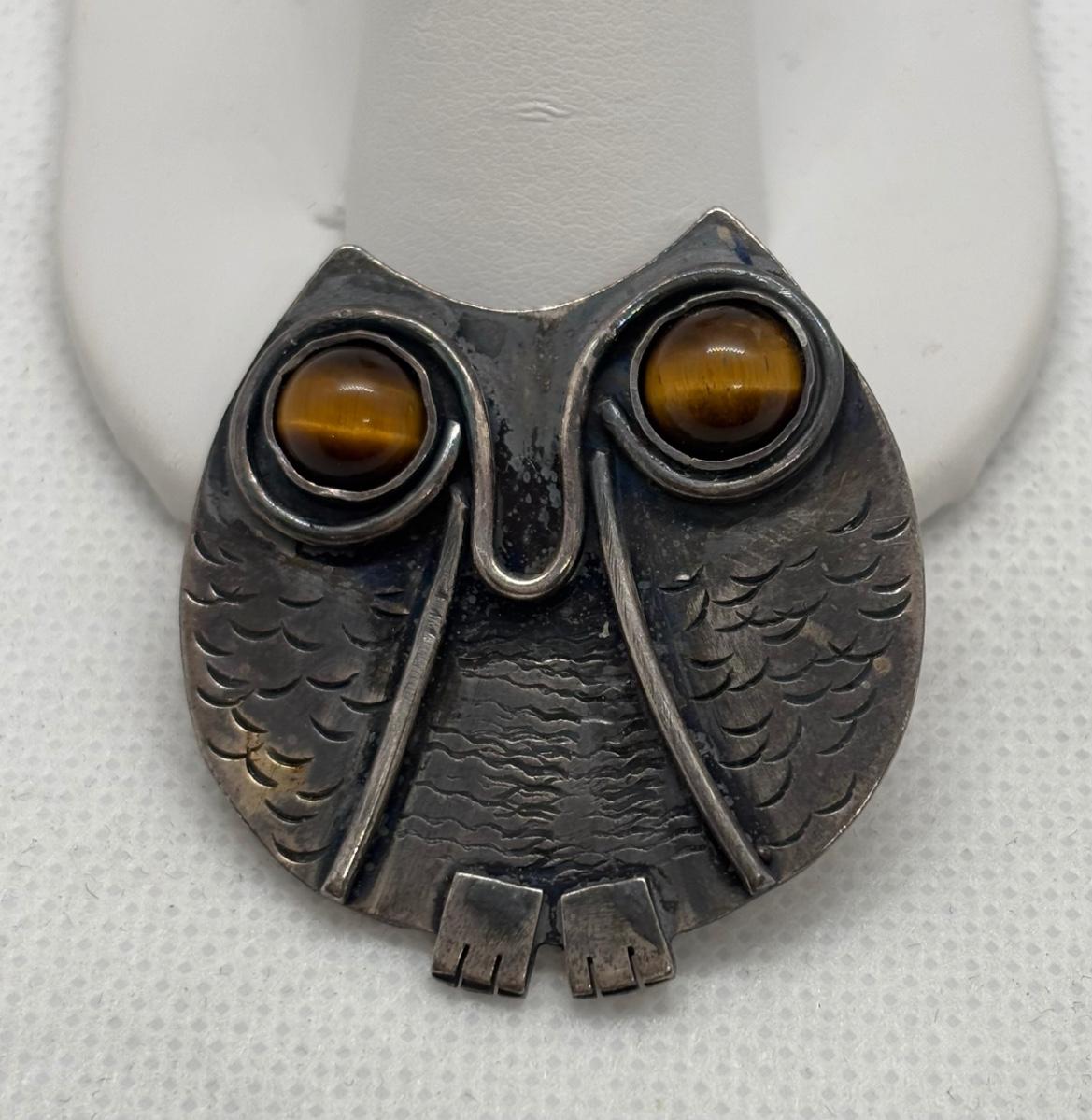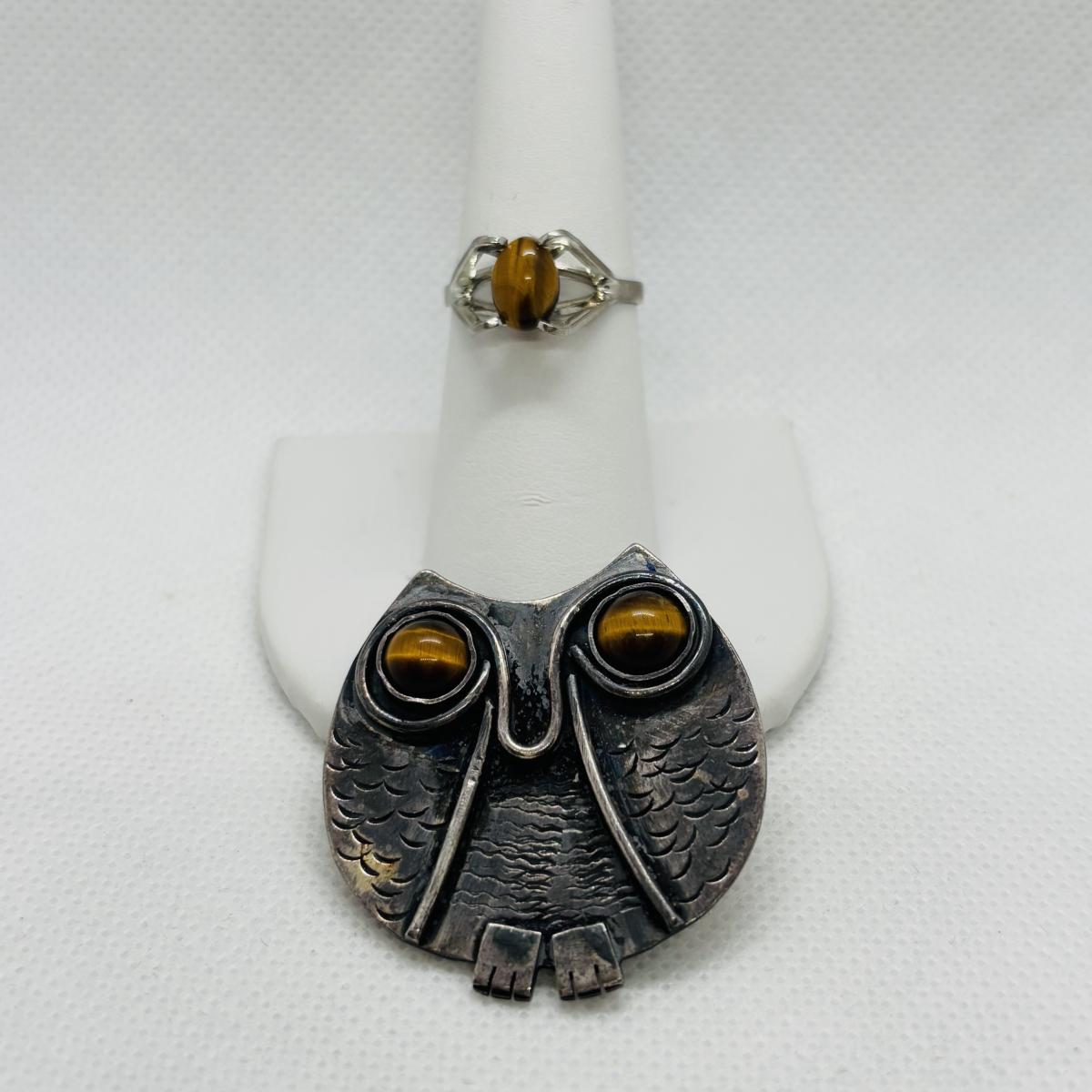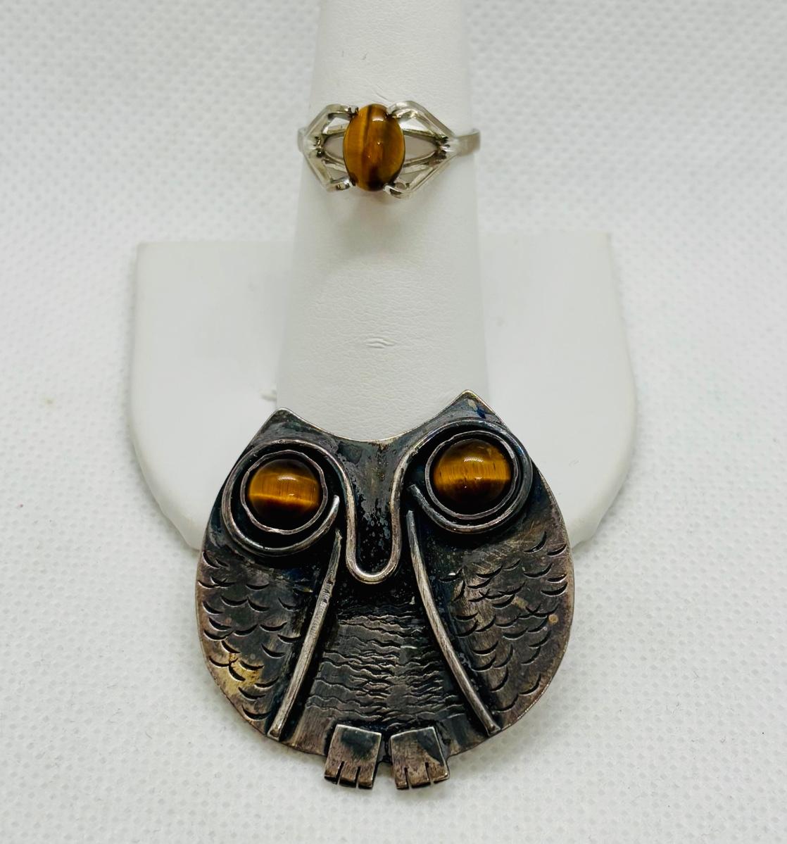 LOT 91: Sterling Silver Tiger Eye Owl Brooch & Ring, sz 7