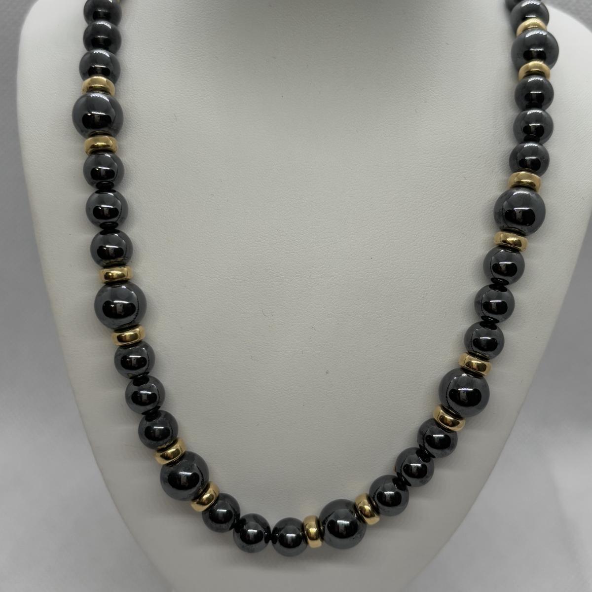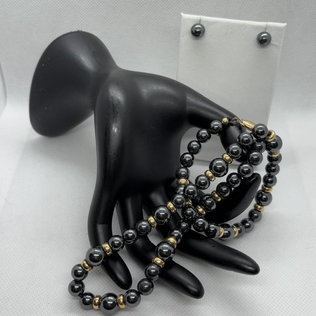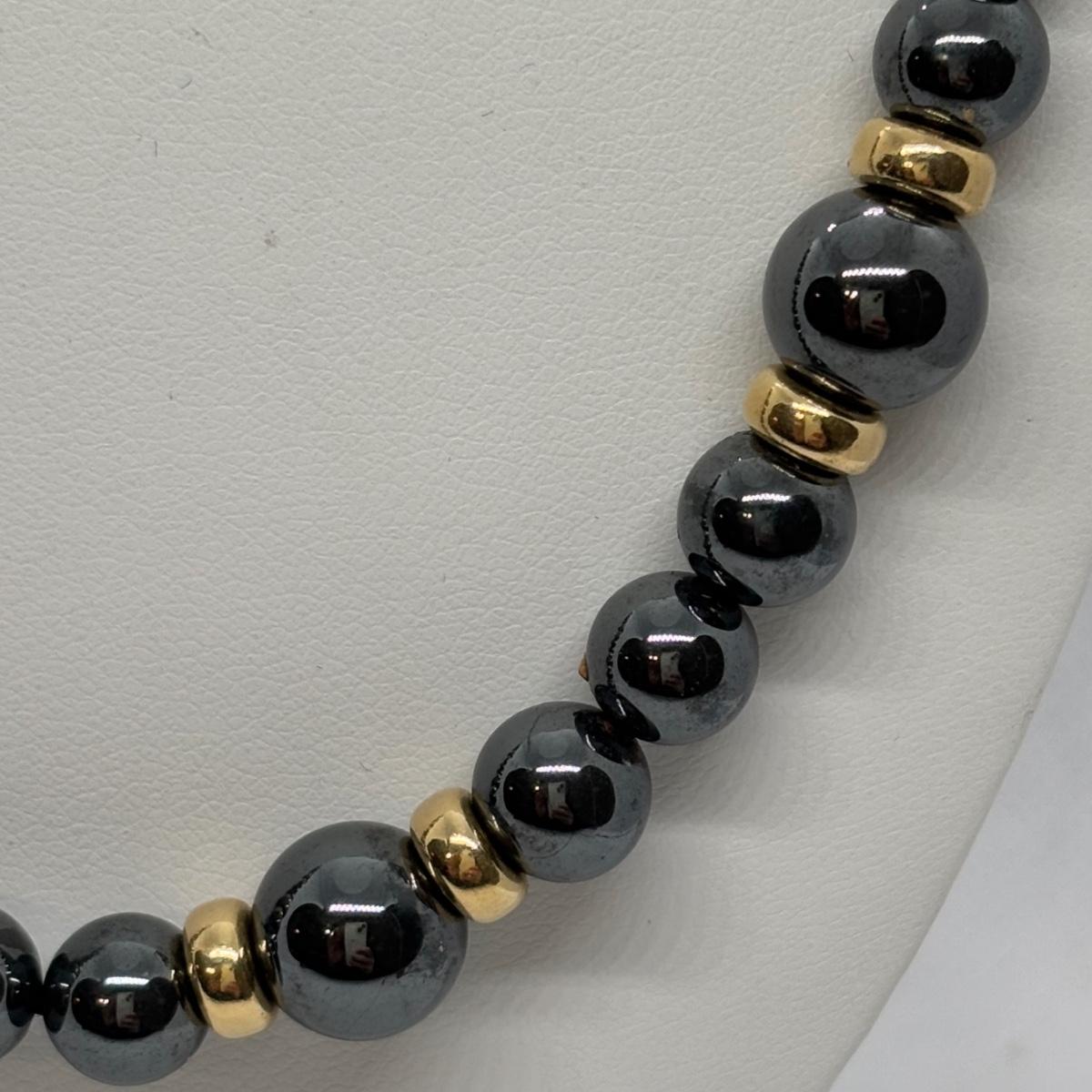 LOT 97: Hematite & Gold Beaded Necklace 14K on Clasp along w/Matching Earrings 14K on Stem