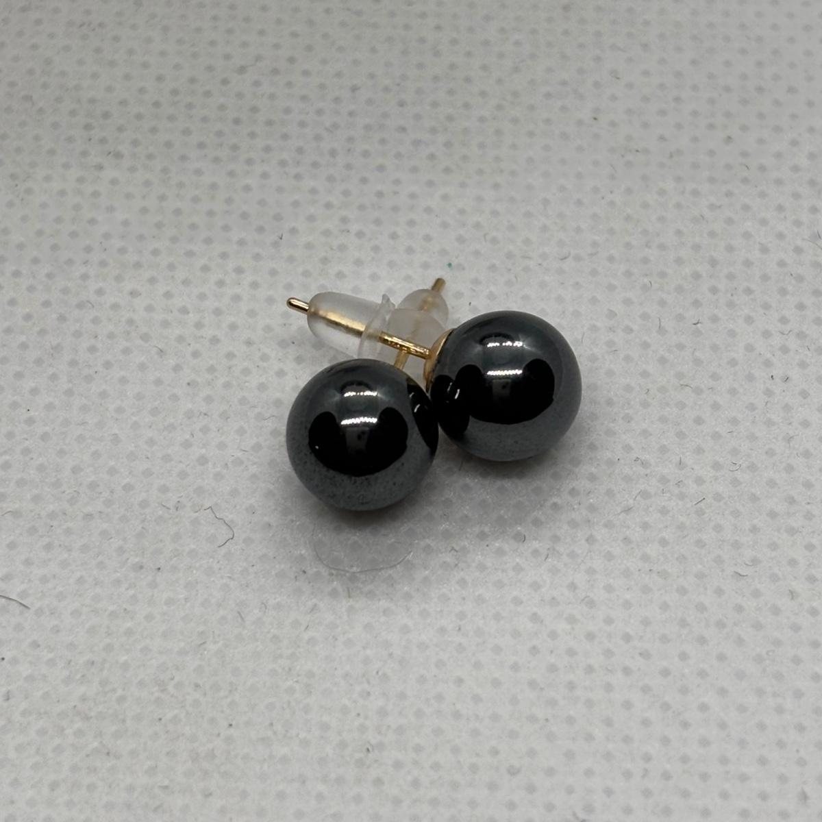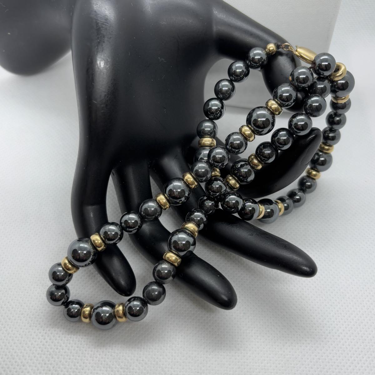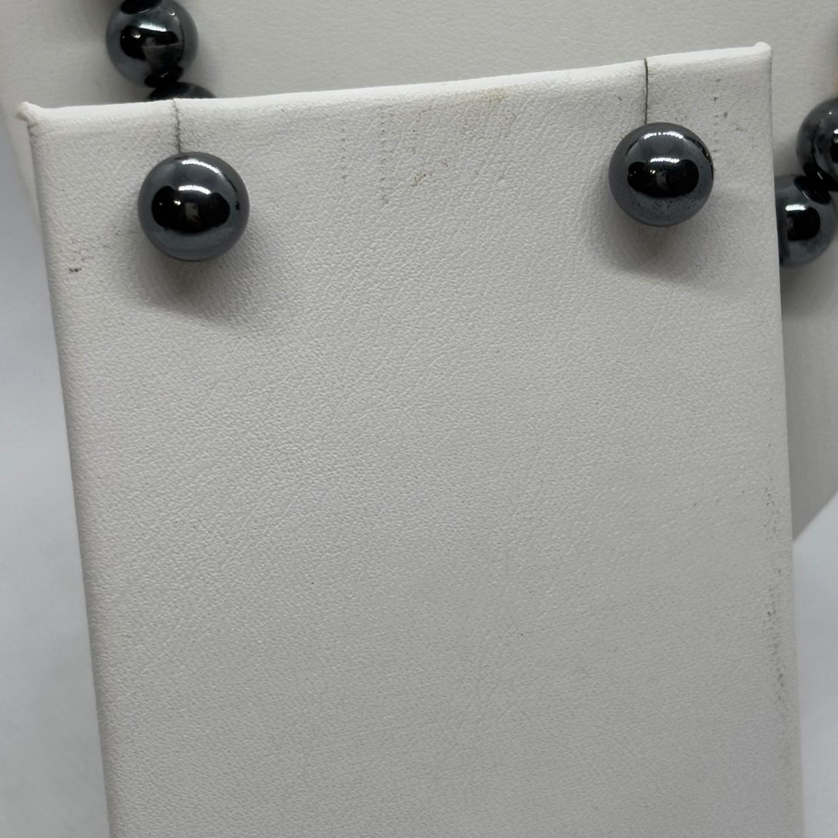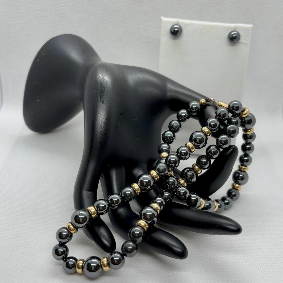 LOT 97: Hematite & Gold Beaded Necklace 14K on Clasp along w/Matching Earrings 14K on Stem