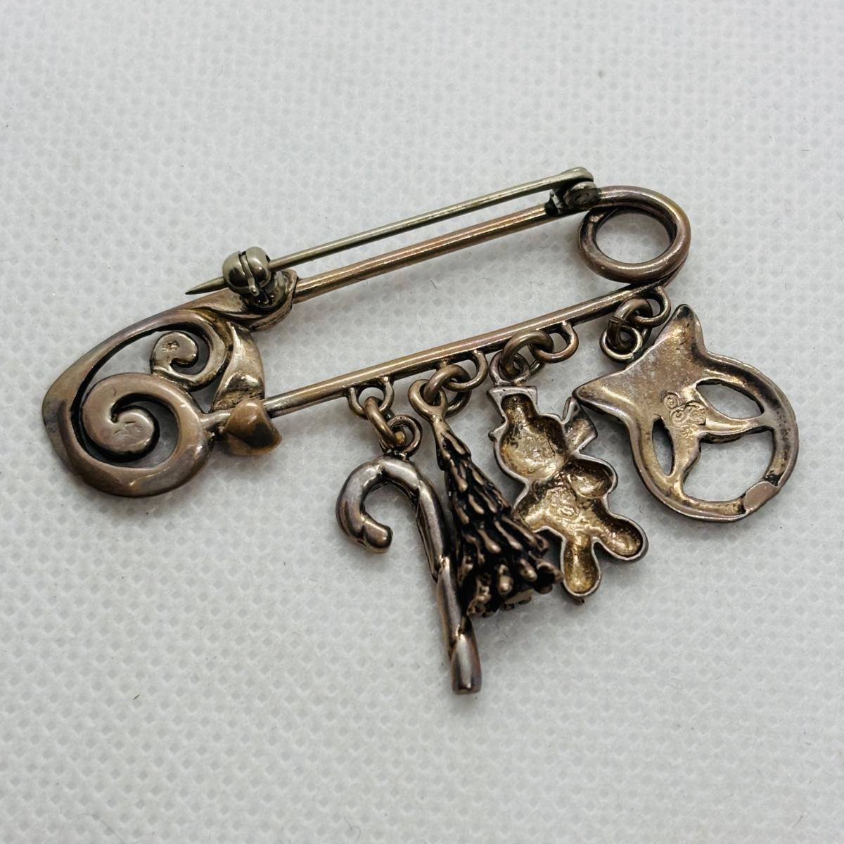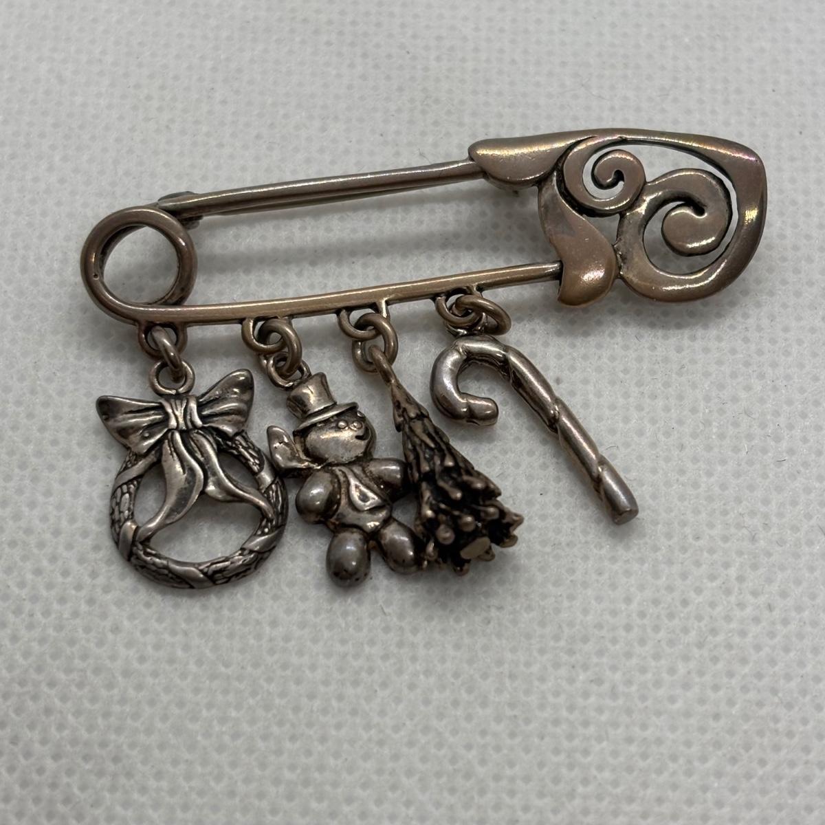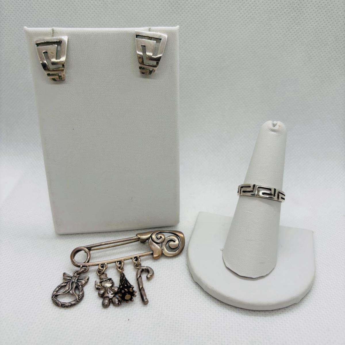 LOT 104: Sterling Silver Cut Out Band Ring sz 7 w/ Matching Earring & Jezlaine Safety Pin with Holiday Charms